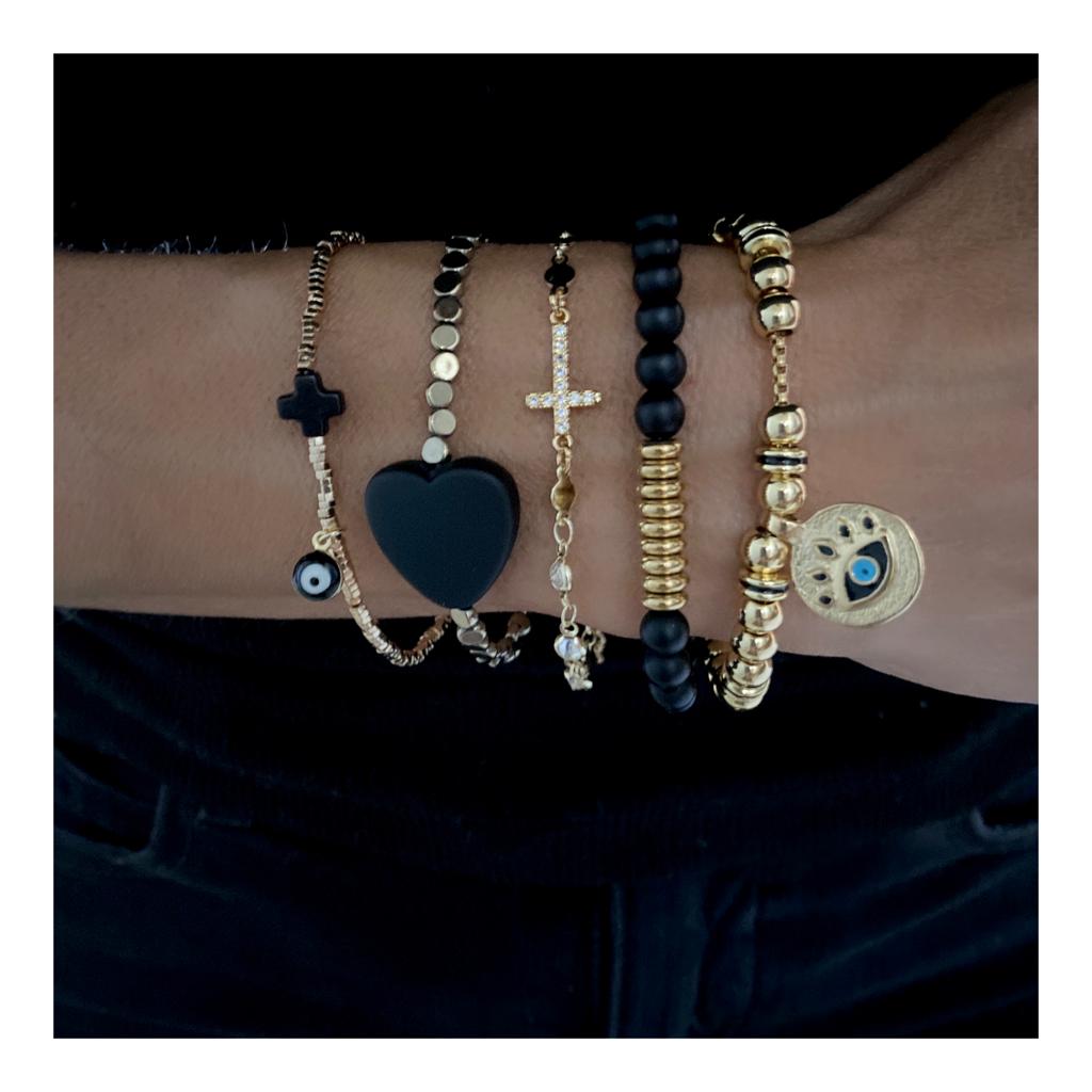 #1 Hématite plaquée or avec breloque croix et œil (extensible)