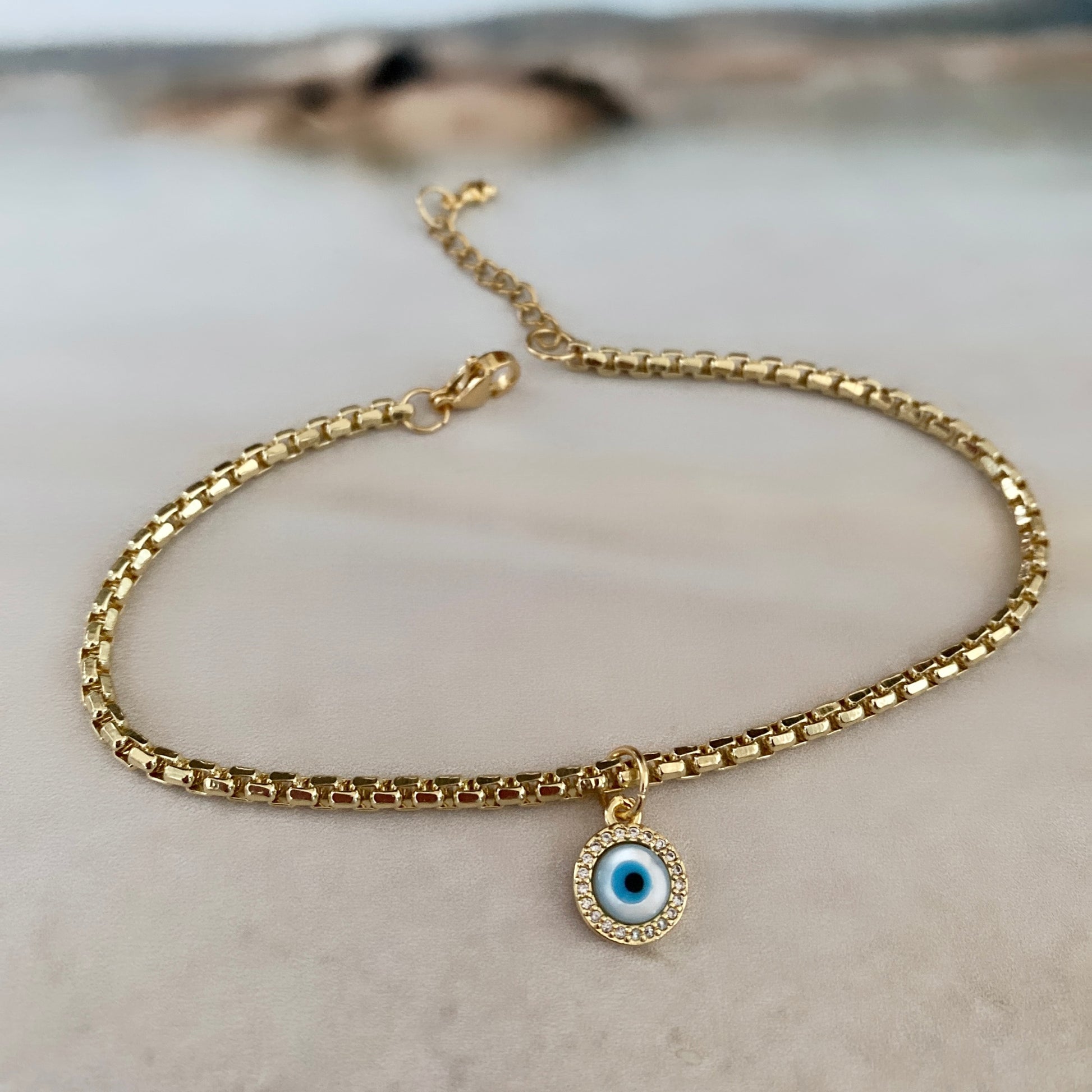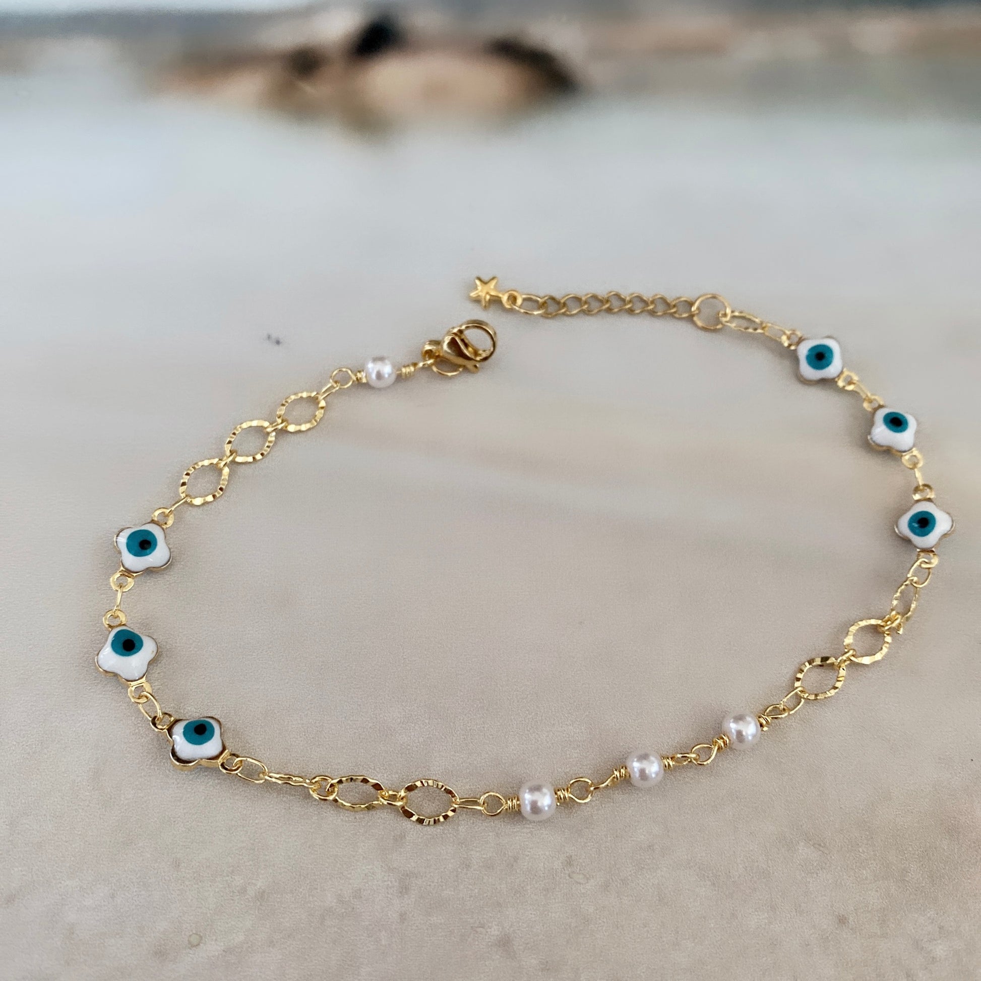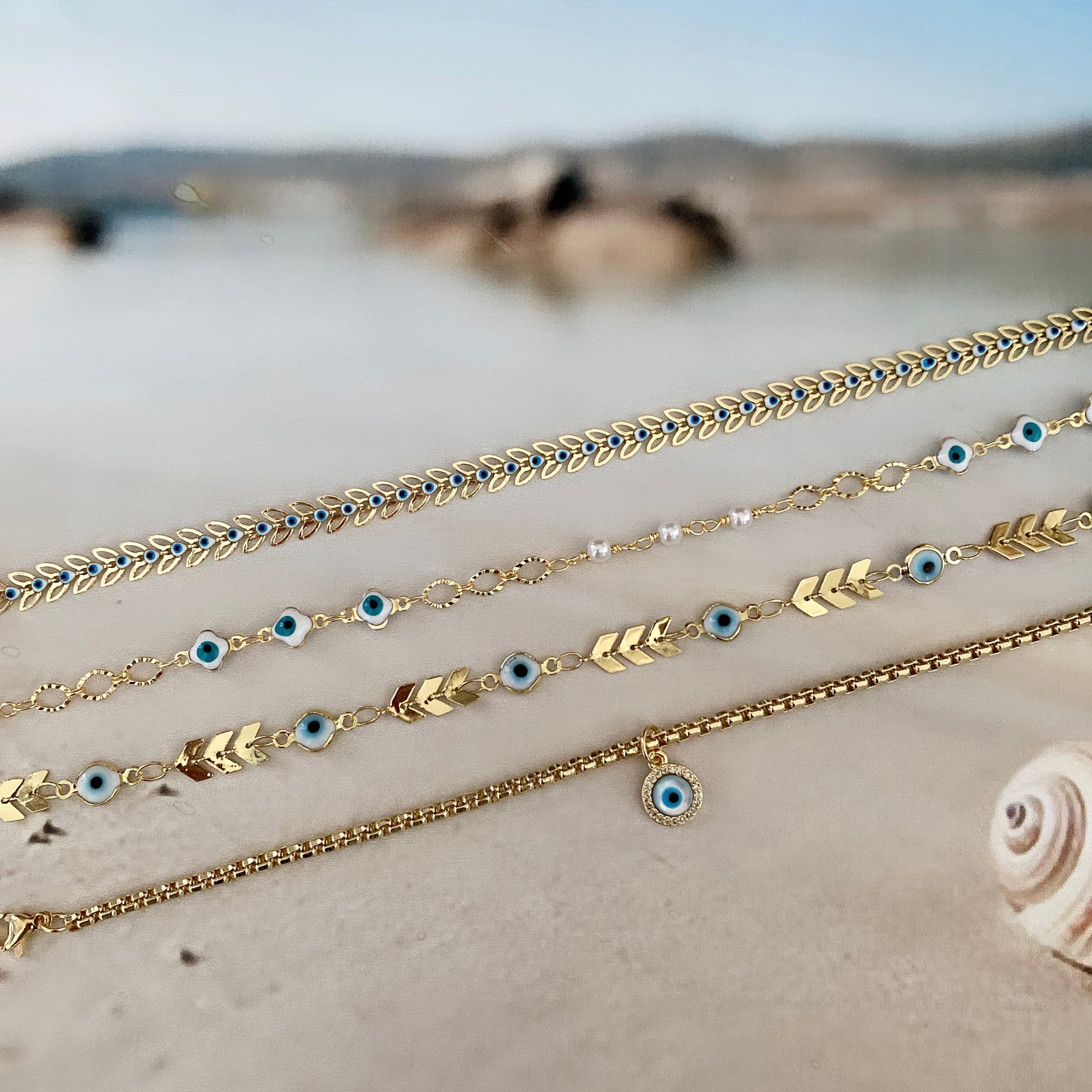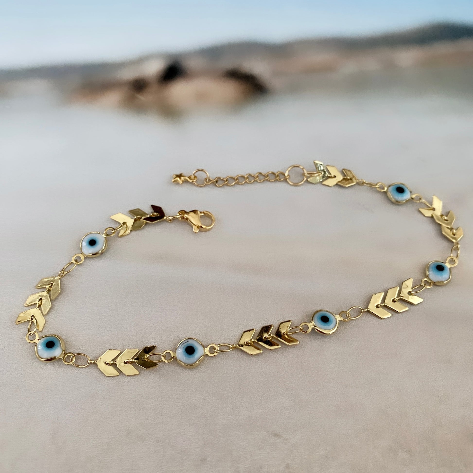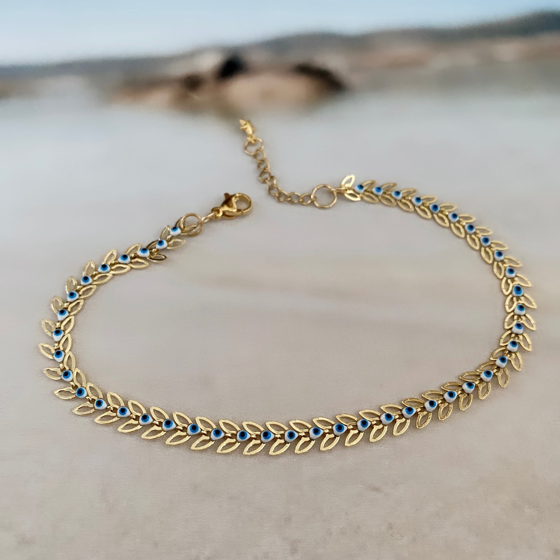 Belle variation de bracelets de cheville en laiton plaqué or avec des accents pour les yeux