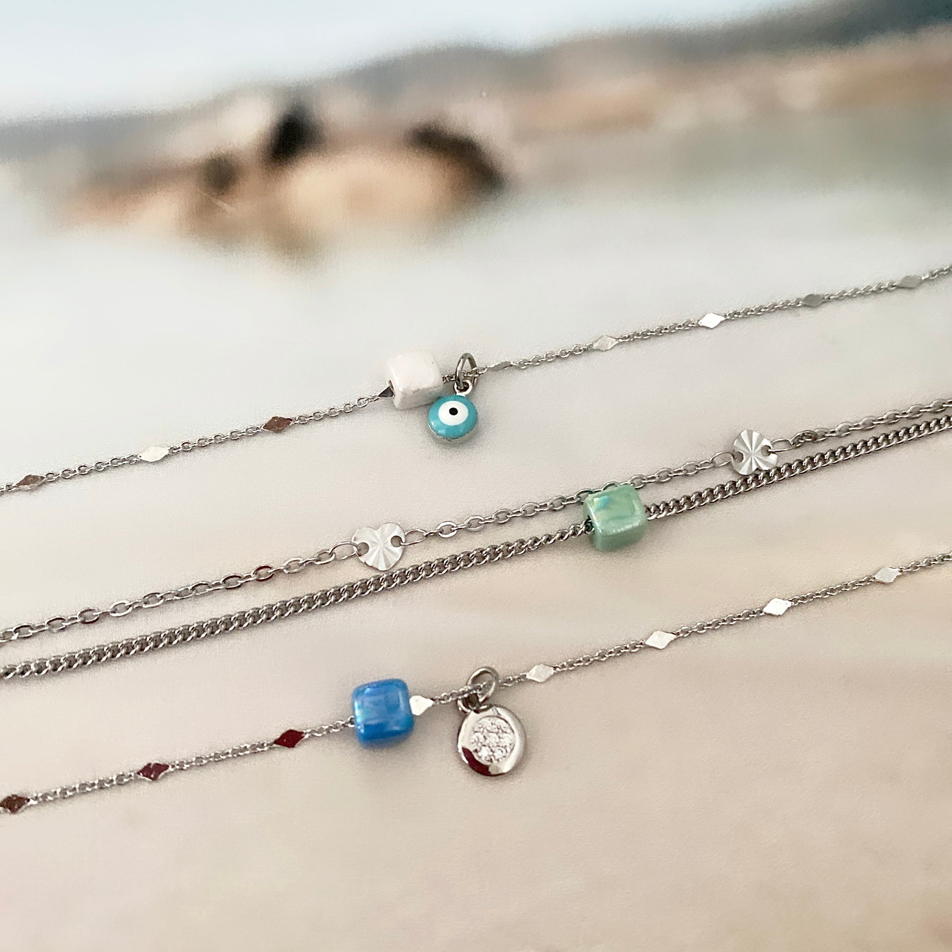 #1 Chaîne en acier inoxydable avec breloque œil en émail turquoise et cube en céramique blanche