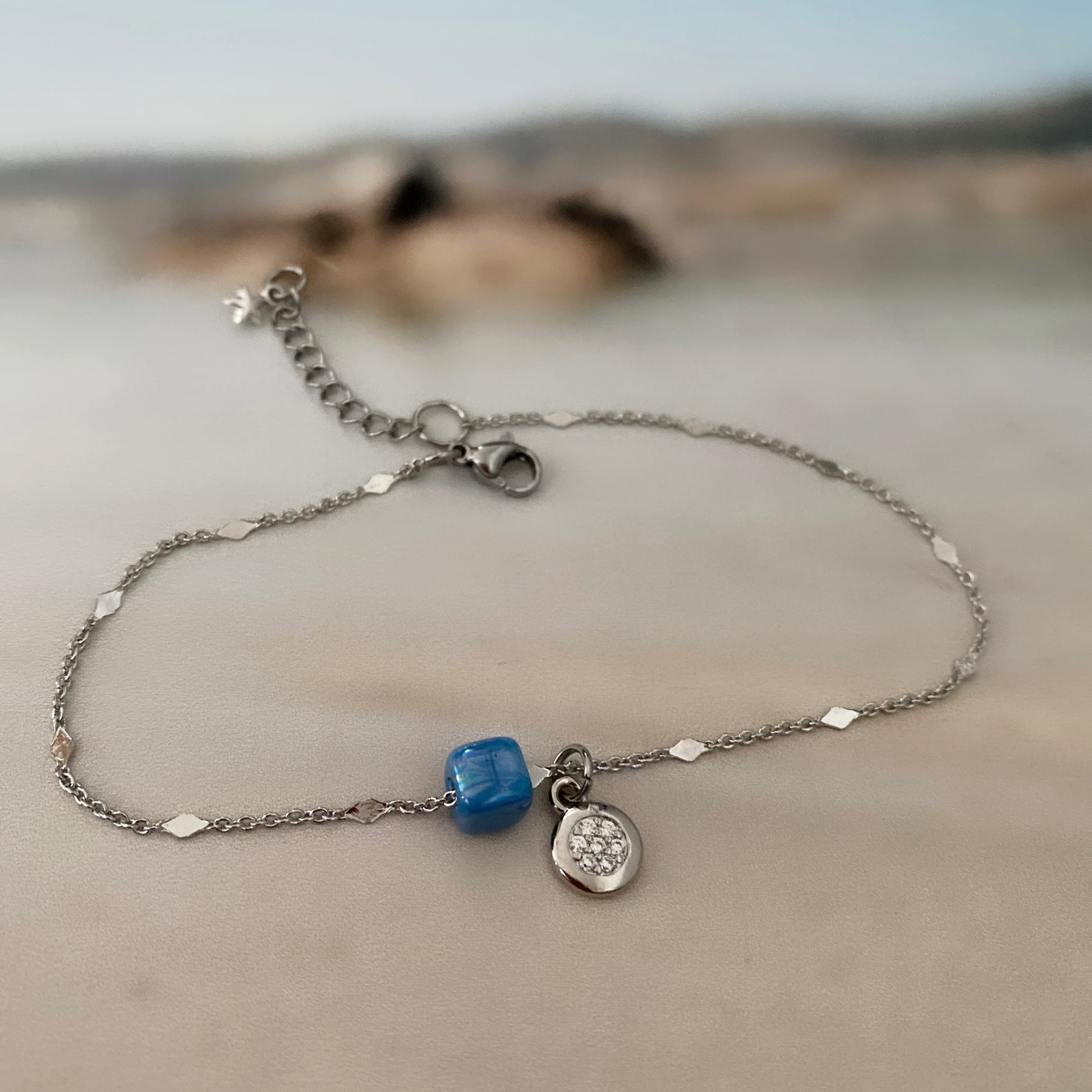 #3 Chaîne en acier inoxydable avec breloque en oxyde de zirconium et cube en céramique bleue