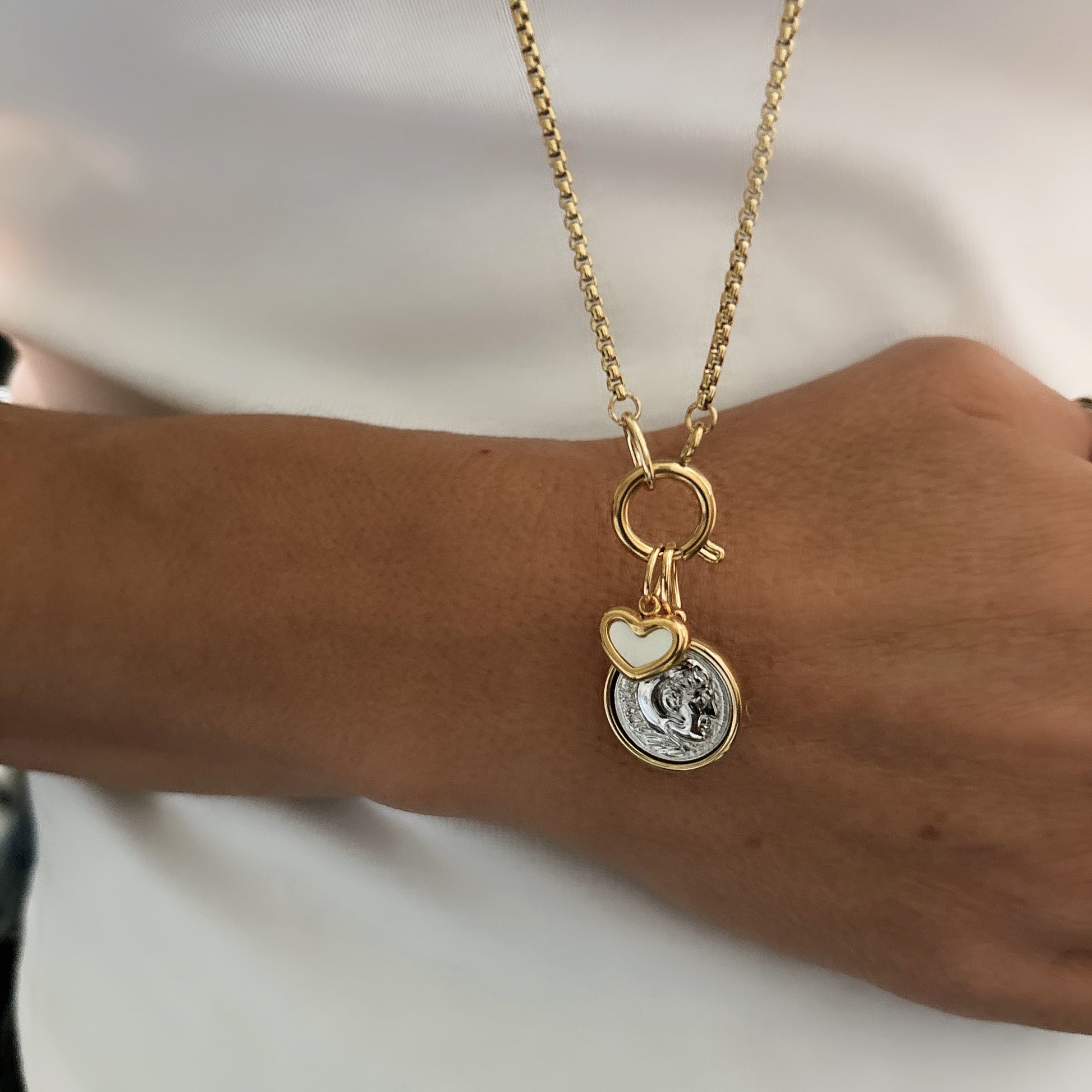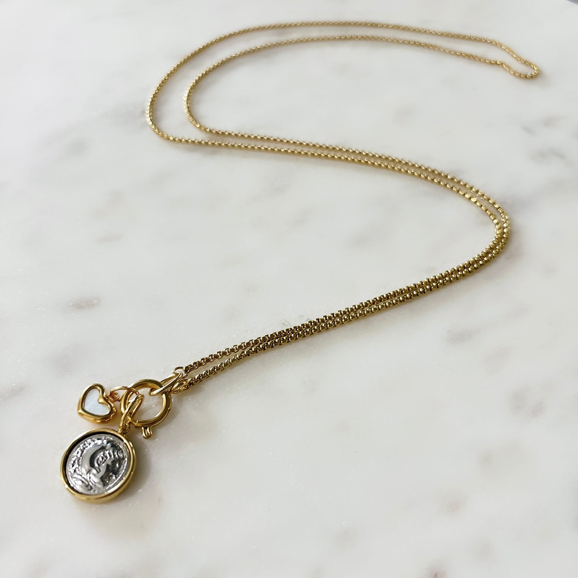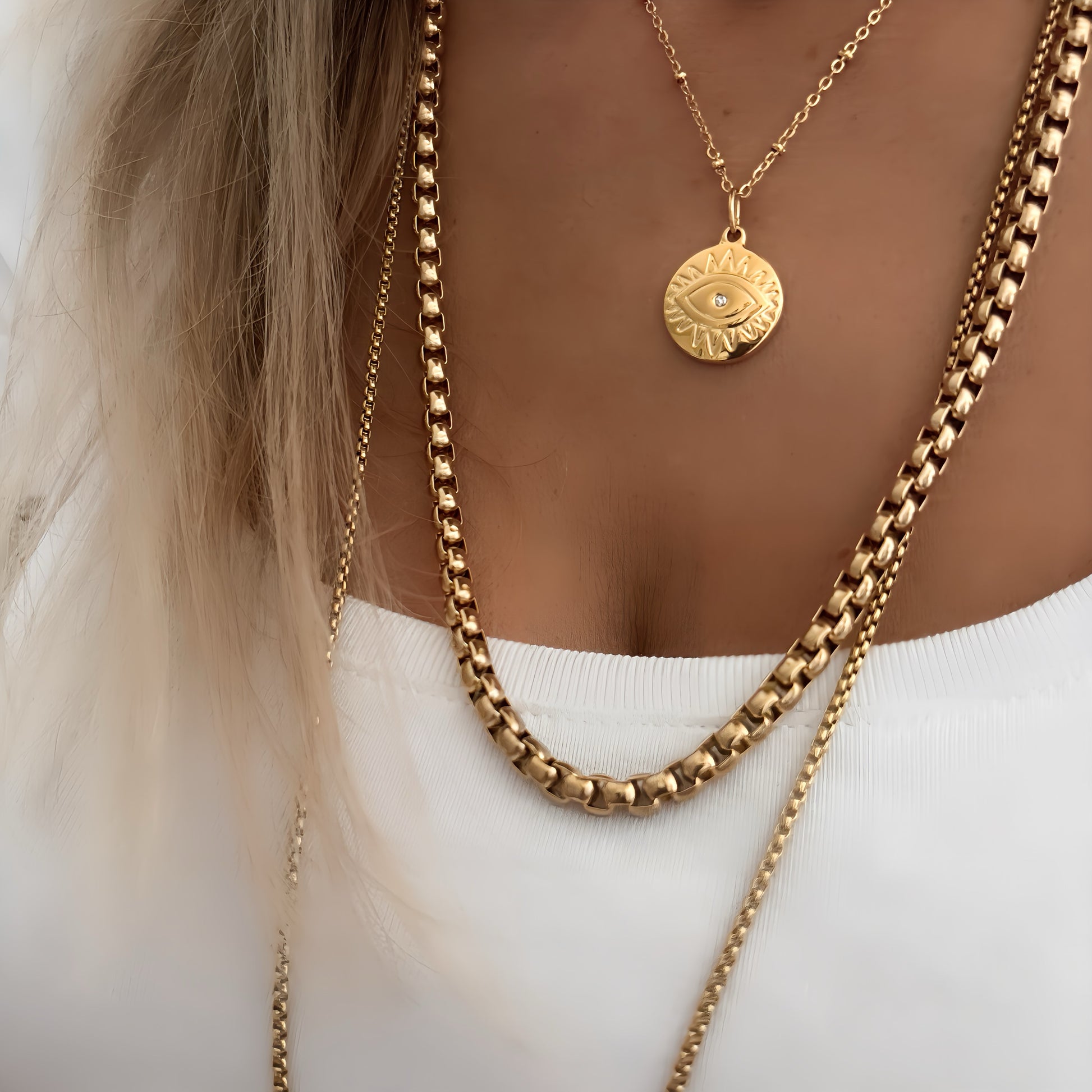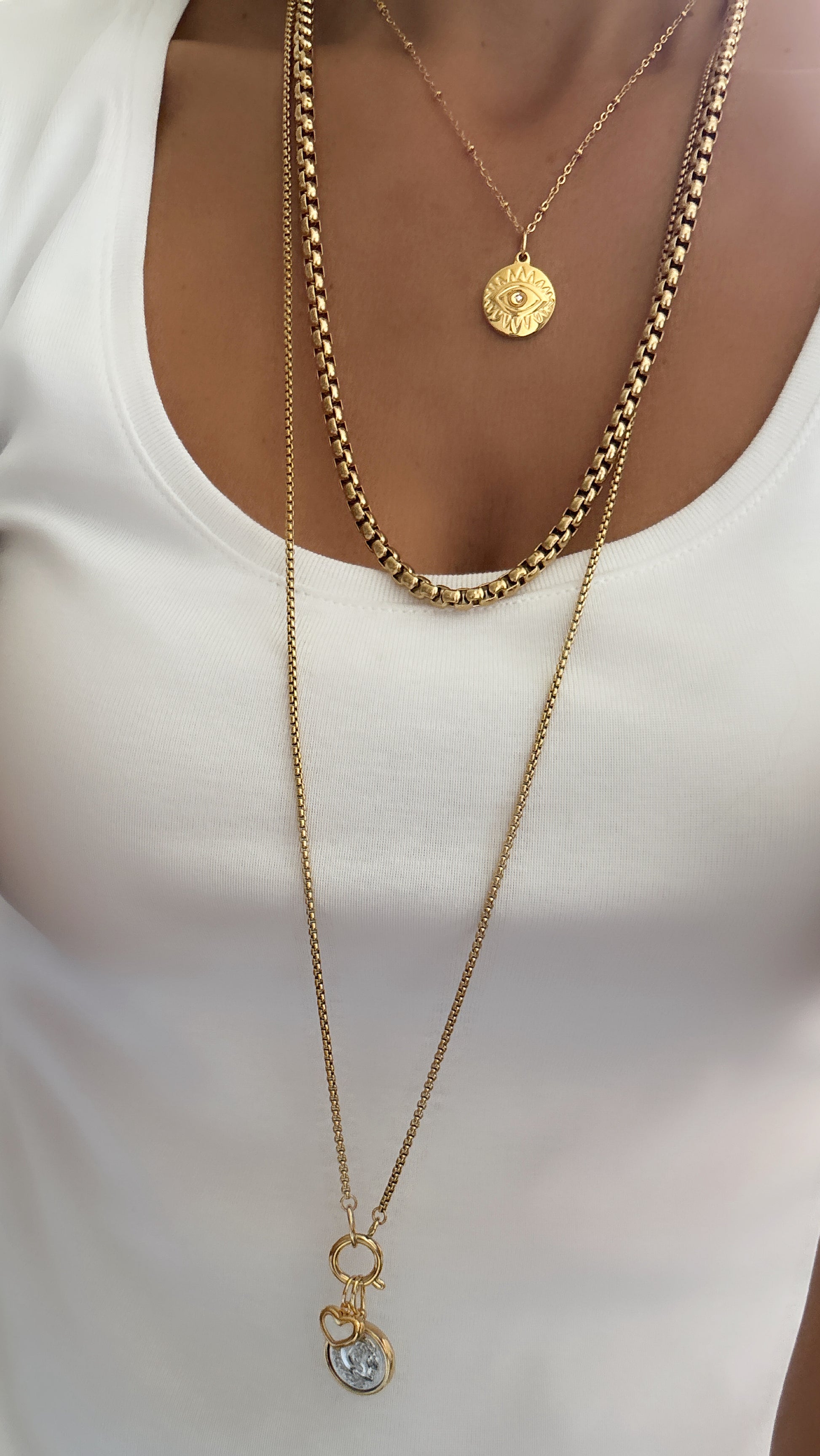 Fabriqués avec soin avec trois colliers superposés, dont un pendentif accrocheur contre le mauvais œil, une chaîne épaisse et une longue chaîne ornée d'une pièce de monnaie et d'un pendentif en forme de cœur. Ces COLLIERS ARIANA polyvalents peuvent être portés ensemble pour un look audacieux ou séparément pour une touche plus subtile. Rehaussez n'importe quelle tenue avec ces accessoires parfaits.