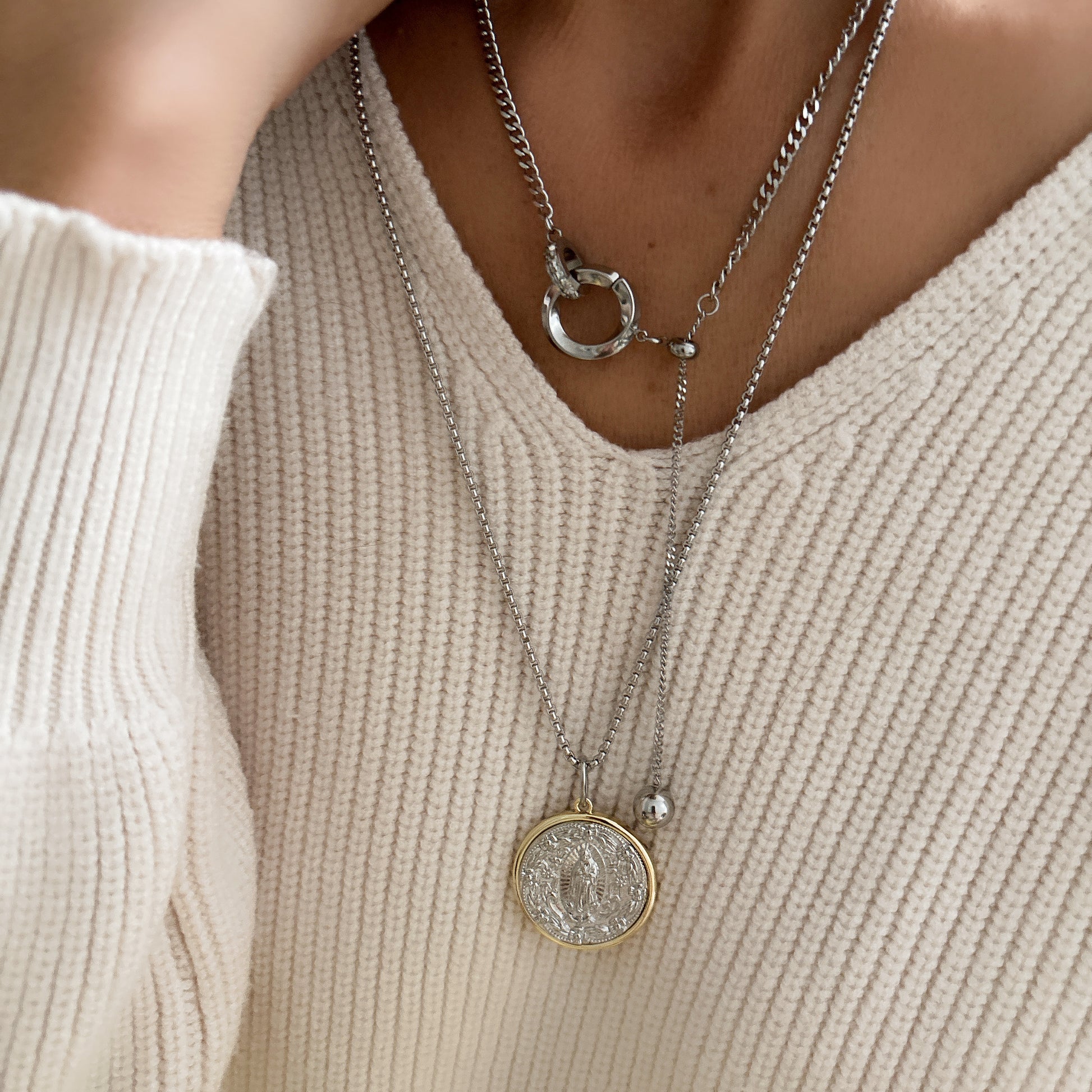 Rehaussez n'importe quelle tenue avec nos COLLIERS ATLANTA ! Ce superbe collier lariat à double anneau est doté d'une chaîne chic et est associé à une longue chaîne et à un pendentif de style pièce de monnaie. Faites une déclaration et ajoutez une touche d'élégance à votre look avec cette pièce polyvalente.