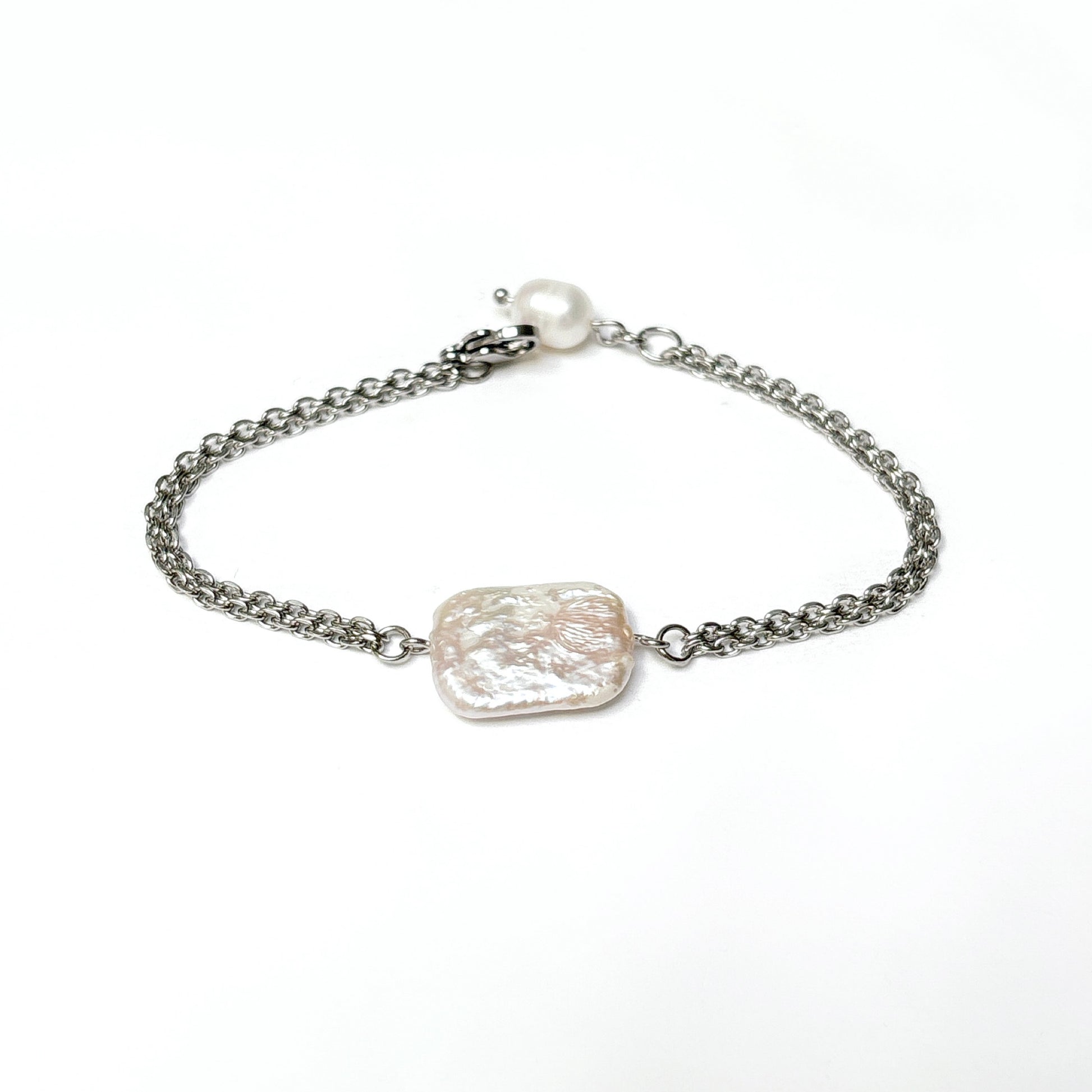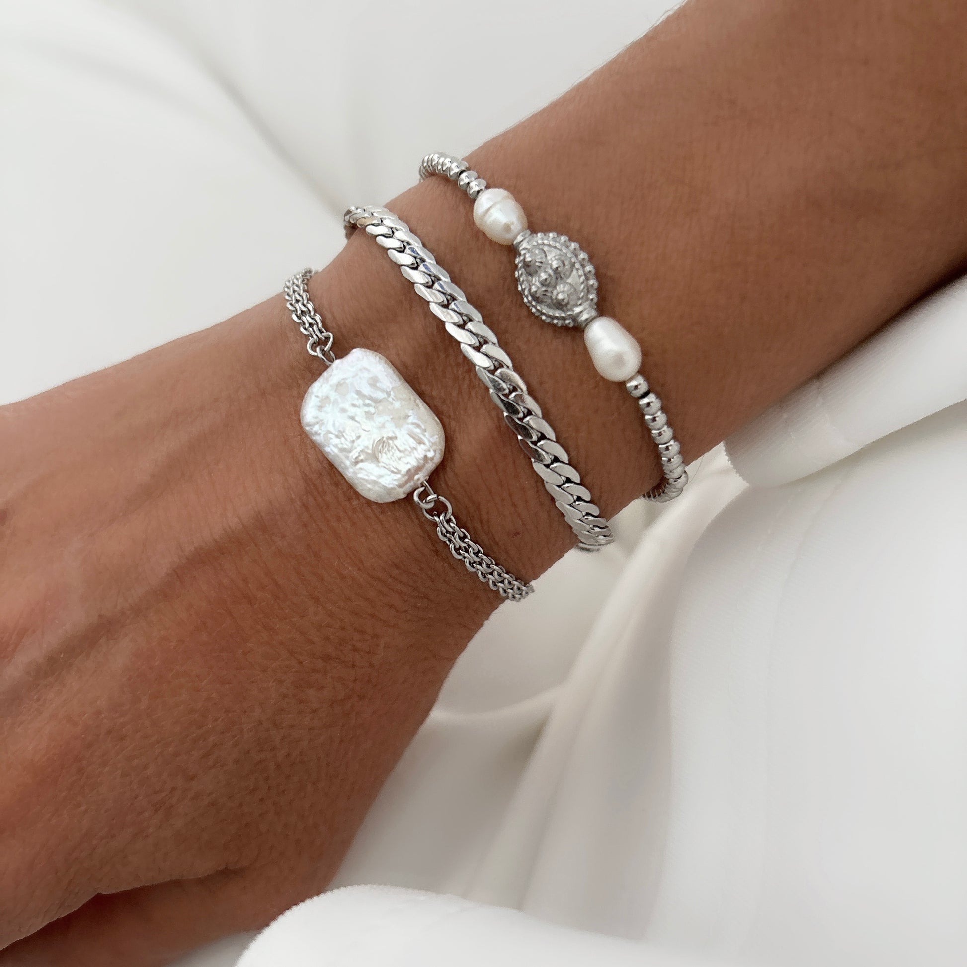 Présentation des BRACELETS BAROQUES - la combinaison parfaite de bracelets en acier inoxydable et de perles d'eau douce. Dotée d'une grande perle d'eau douce baroque rectangulaire, cette combinaison est la quintessence de l'audace et de la classe. Rehaussez n'importe quelle tenue avec ces magnifiques bracelets.