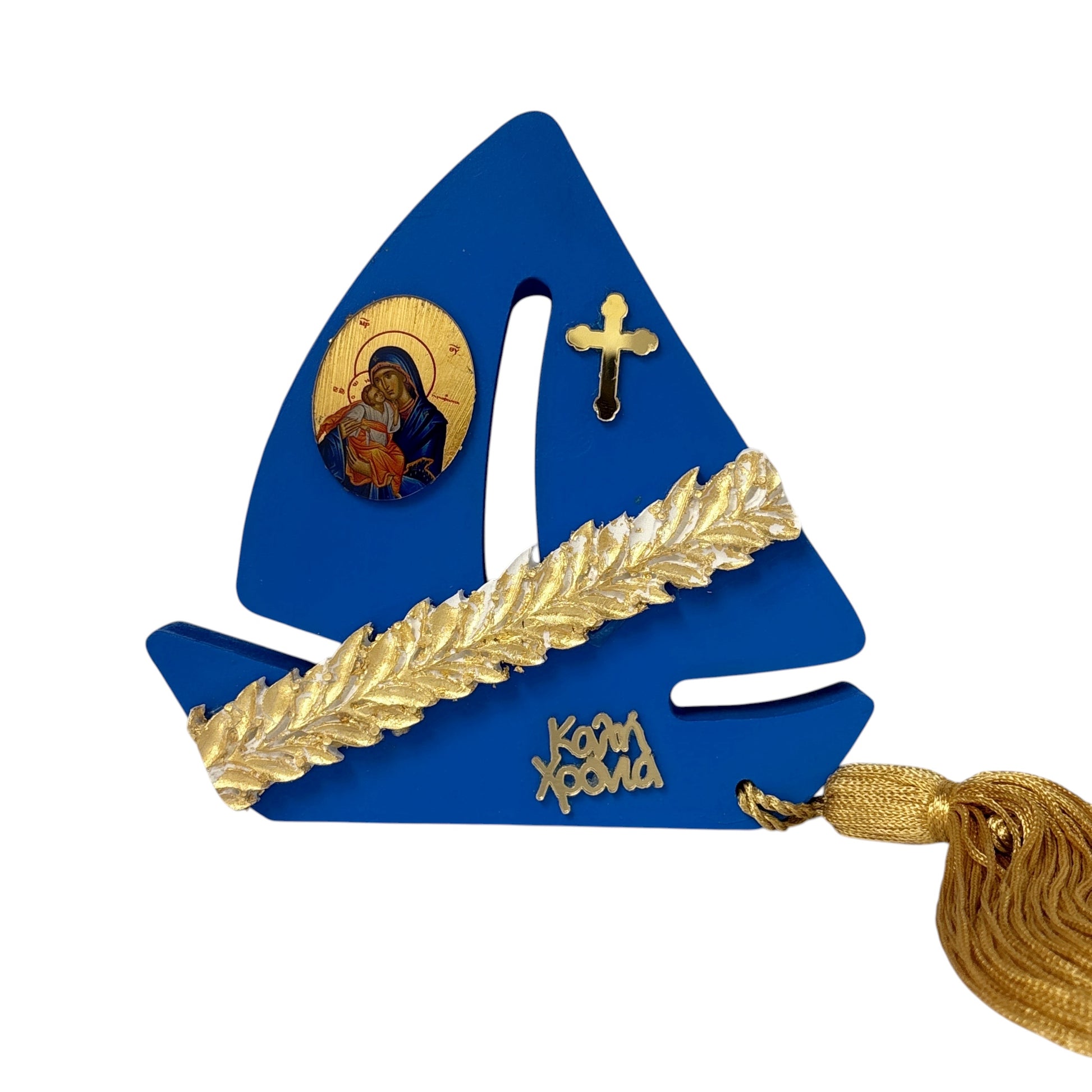 Découvrez la beauté et le savoir-faire de notre bateau en bois orné de plexiglas ! Ce magnifique bateau bleu est décoré d'une icône en plexiglas, d'une croix et d'un pompon doré, ainsi que de mots grecs inspirants pour une année prospère. C'est le cadeau idéal pour le Nouvel An, une touche symbolique et positive pour votre intérieur.