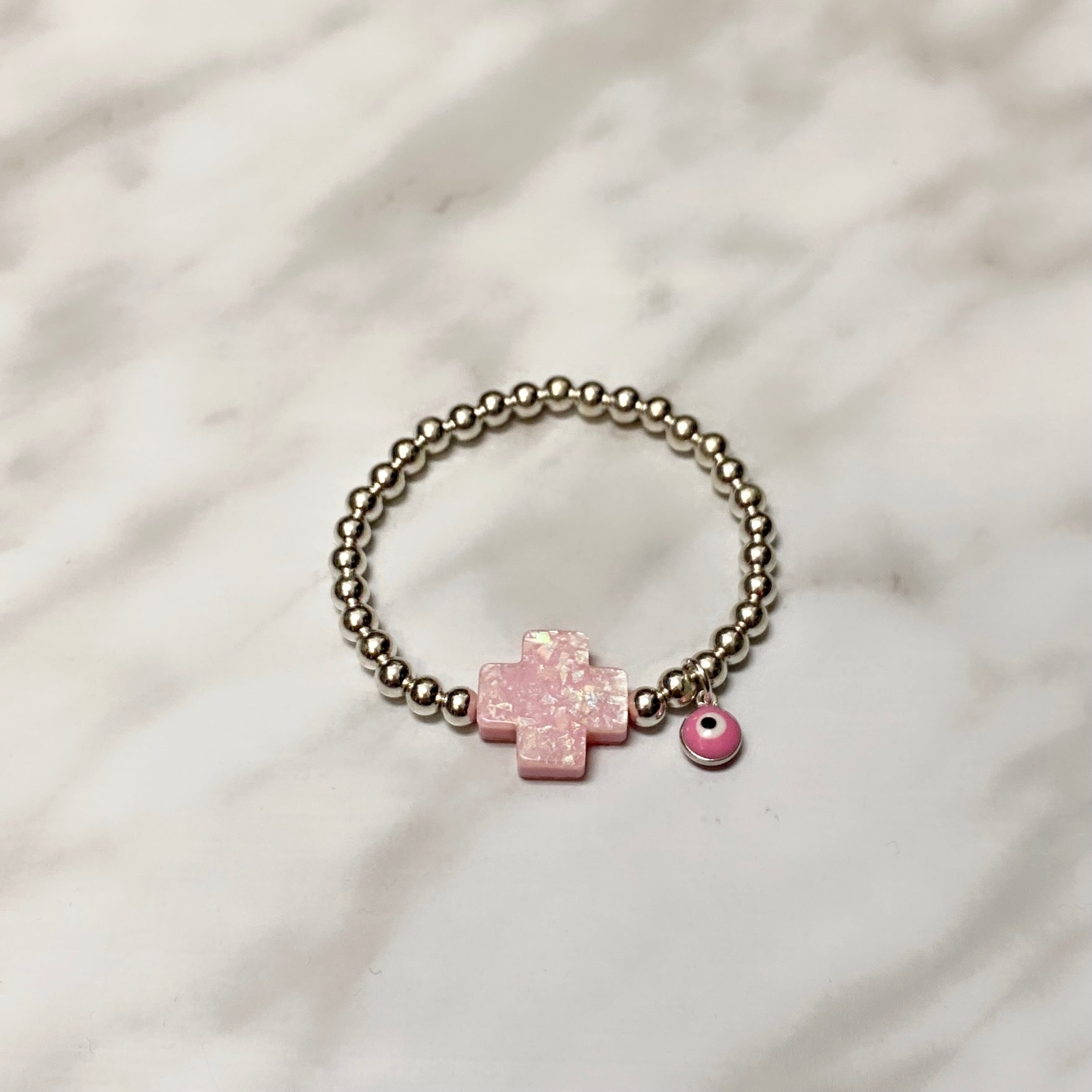 #3 (taille enfant) hématite plaquée argent 4mm avec croix œil et coquillage en émail rose plaqué argent (extensible),