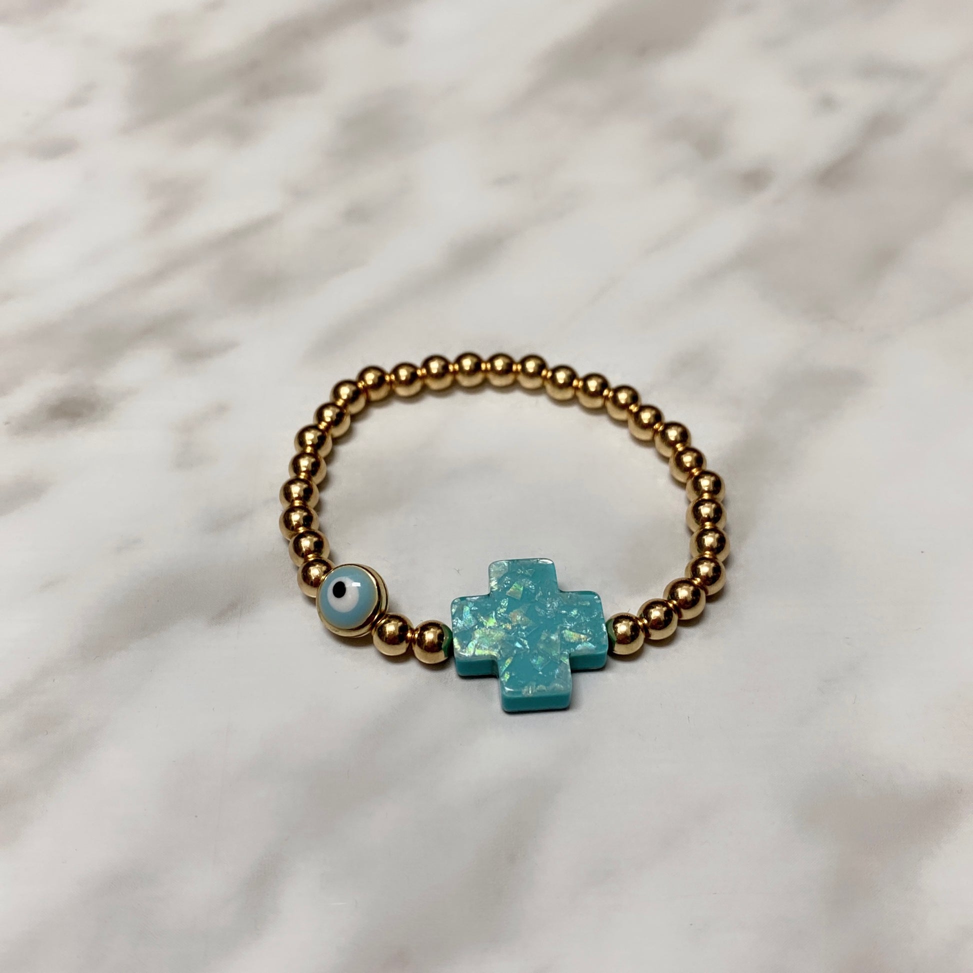 #6 (taille adulte) Hématite plaquée or 4 mm avec œil et croix en émail turquoise plaqué or (extensible),