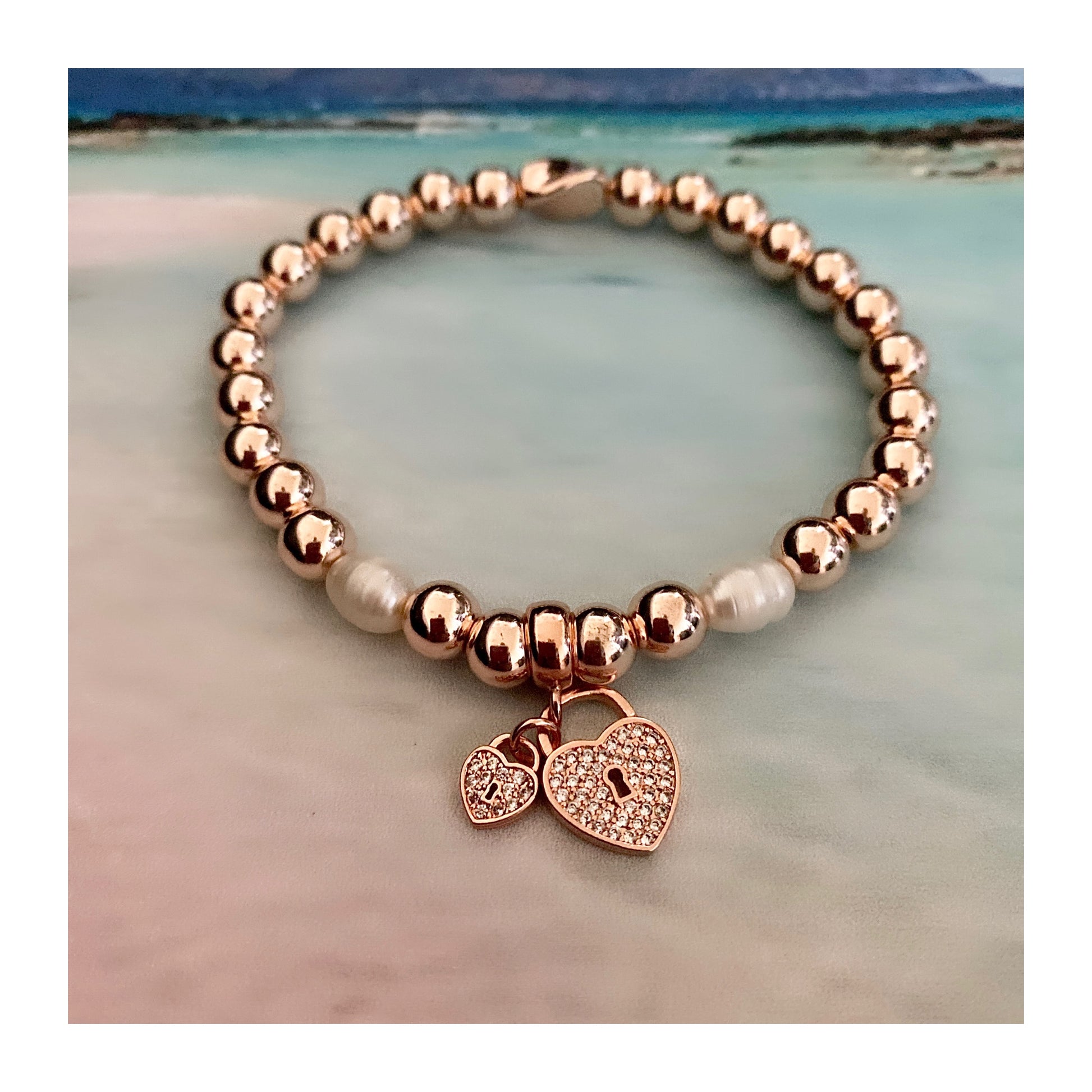 #8 Hématite plaquée or rose 6mm avec perle d'eau douce & 2 coeurs cz (stretch),
