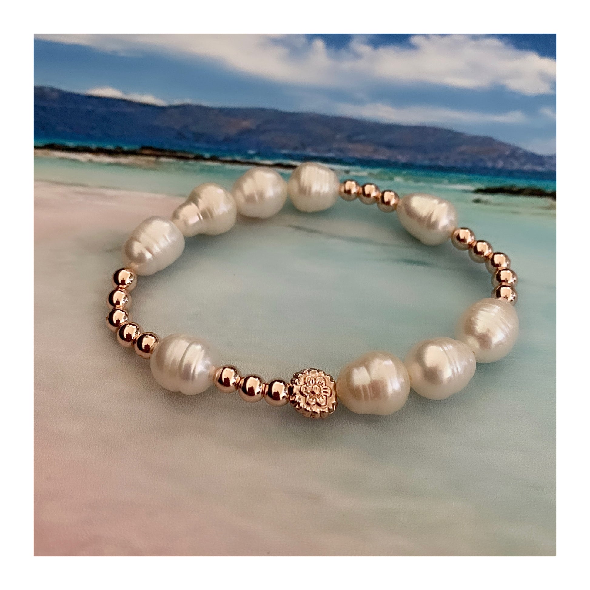 Une superbe pile de bracelets en or rose et une variété de perles. Vendus séparément, mais regroupés pour un look complet.