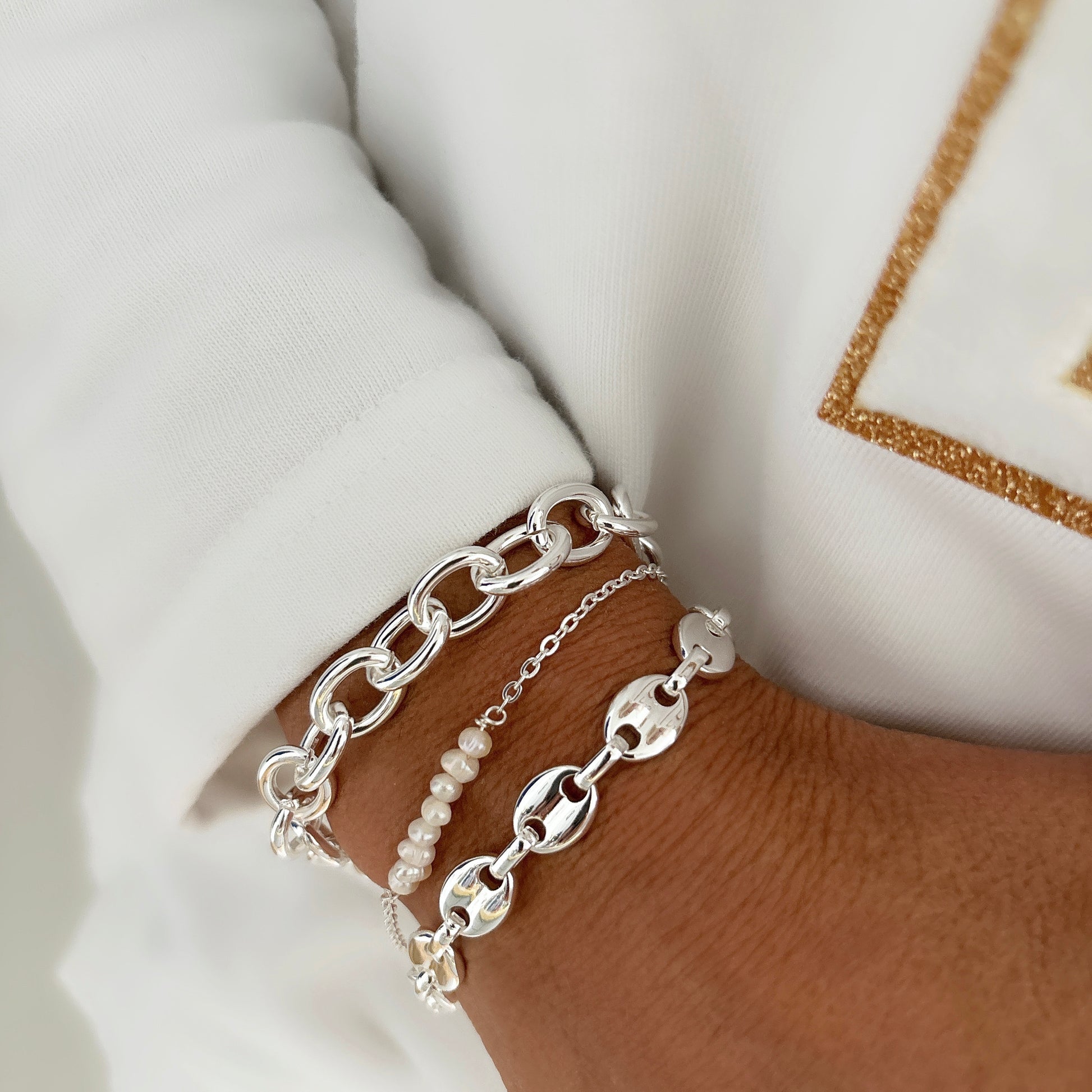 Rehaussez votre style avec les BRACELETS BRITNEY. Les chaînes en acier inoxydable plaqué argent dégagent une brillance éclatante, tandis que les chaînes épaisses et délicates offrent une touche d'élégance avec le fermoir et les perles d'eau douce. La chaîne en grain de café ajoute une touche unique et tendance pour compléter n'importe quelle tenue.