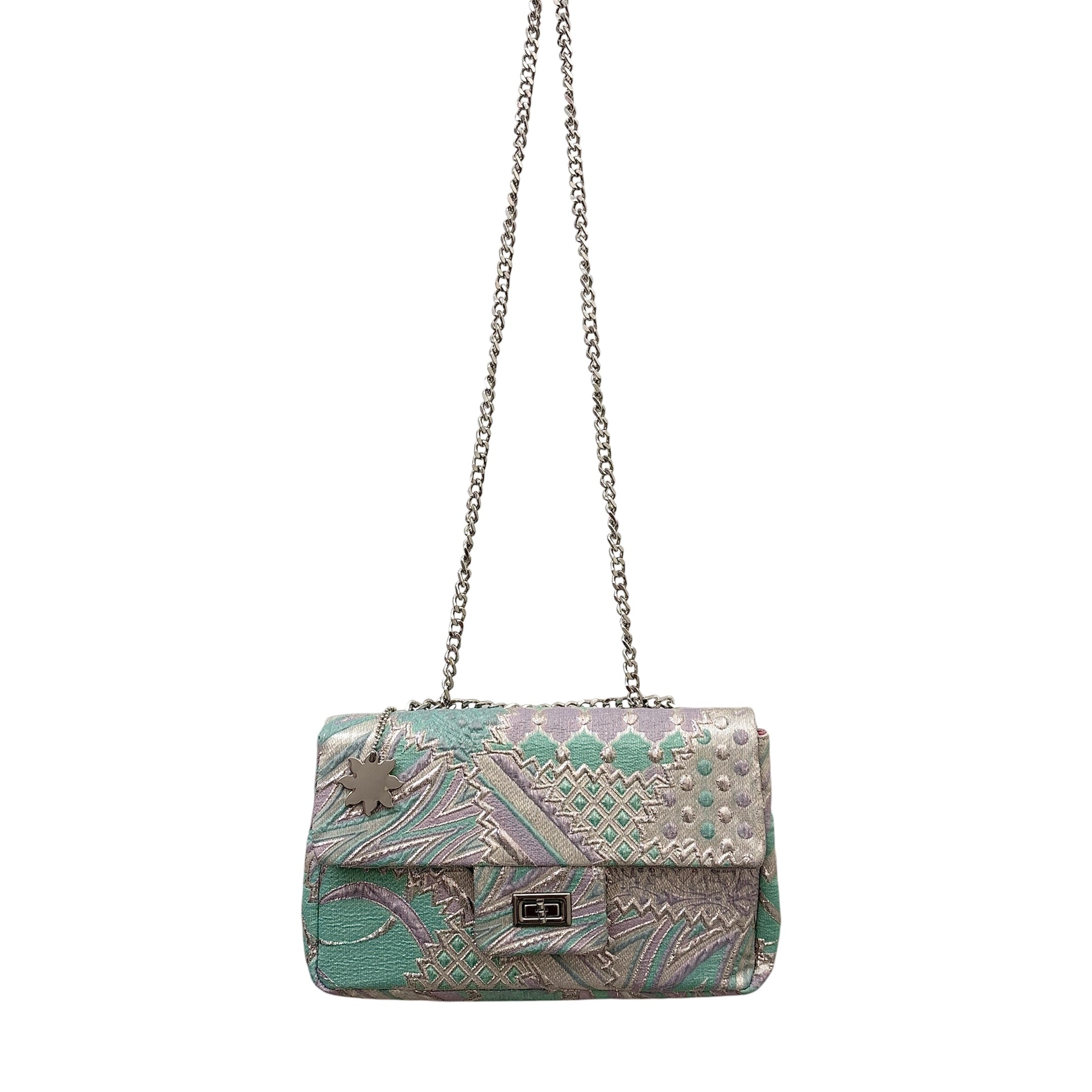 Découvrez le sac Camelia, un accessoire élégant et polyvalent en tissu métallisé turquoise, lilas et argent, avec des touches de couleur et des finitions argentées. Portez-le à l'épaule pour un confort optimal. Affirmez votre style avec le sac Camelia !