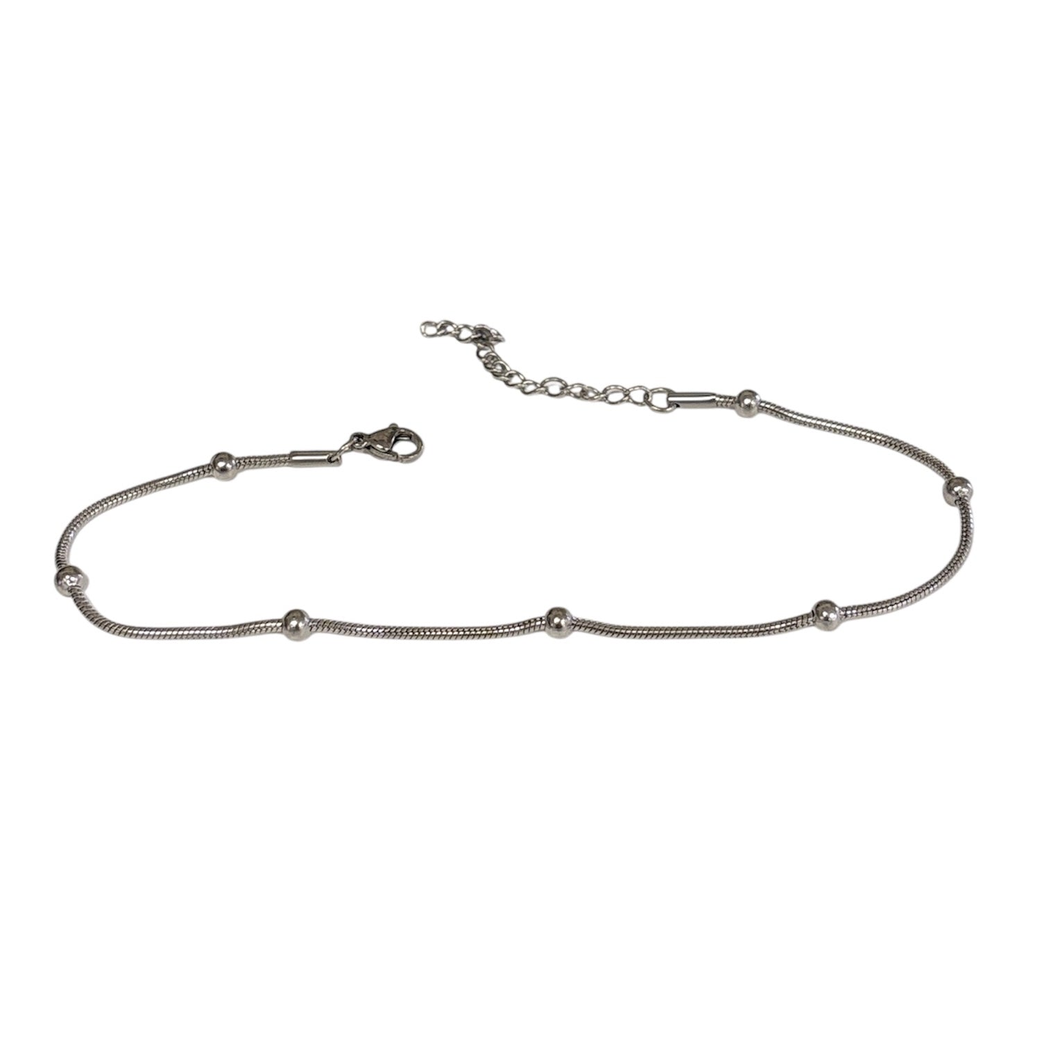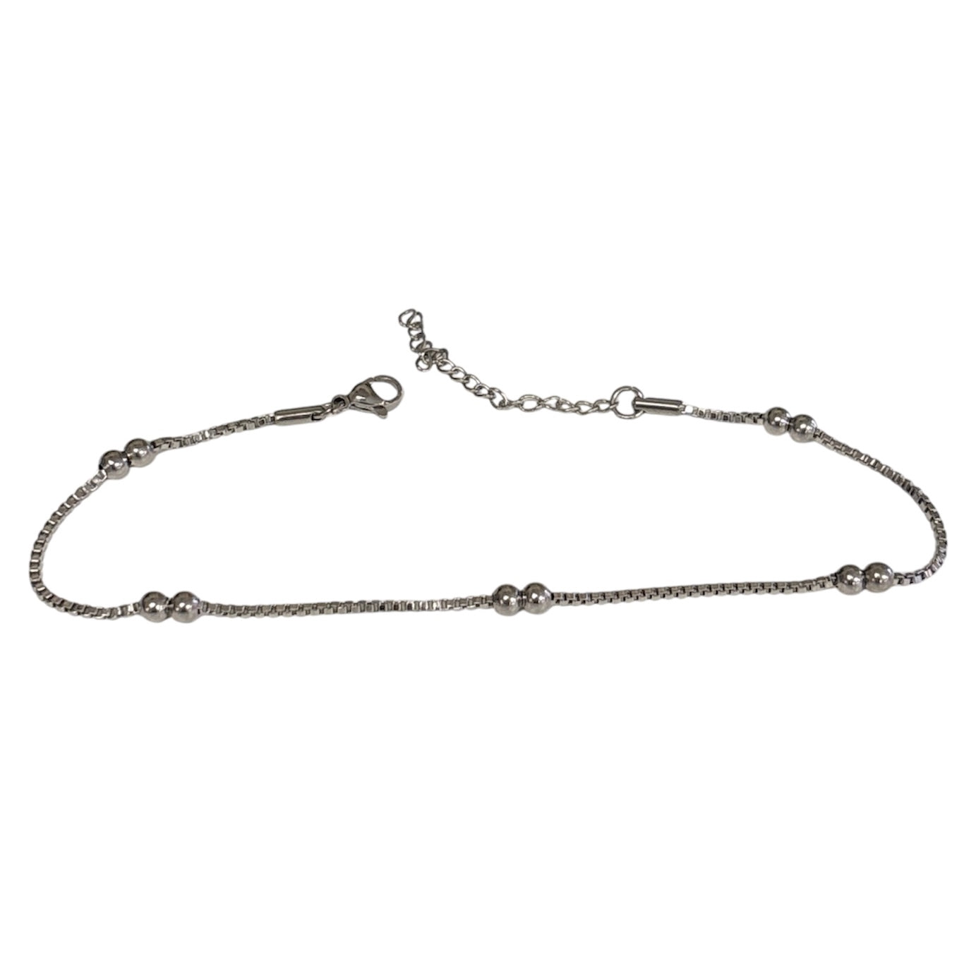 Les bracelets de cheville CASSANDRA allient les textures uniques des chaînes serpent et box à l'acier inoxydable pour un look superposé, rehaussé de boules fantaisie. Transformez votre tenue avec ces bracelets de cheville originaux et élégants.