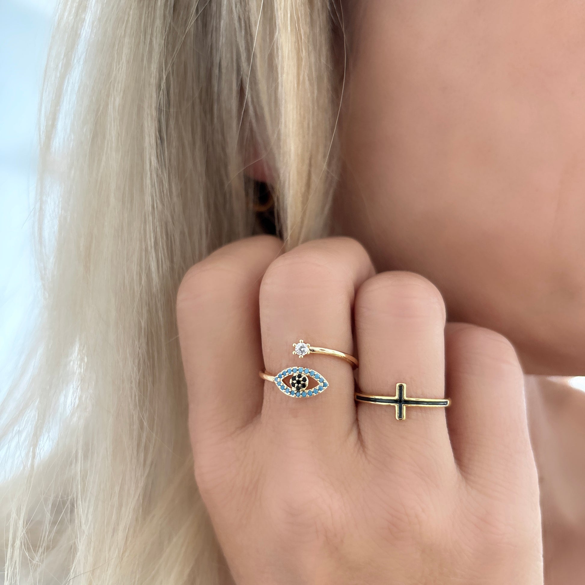 Améliorez votre style et votre protection avec les bagues CELESTE. La bague mauvais œil ornée de zircones cubiques et la bague croix en émail noir peuvent être portées ensemble ou séparément. Les deux bagues offrent une protection, ce qui en fait le complément parfait à votre collection de bijoux.