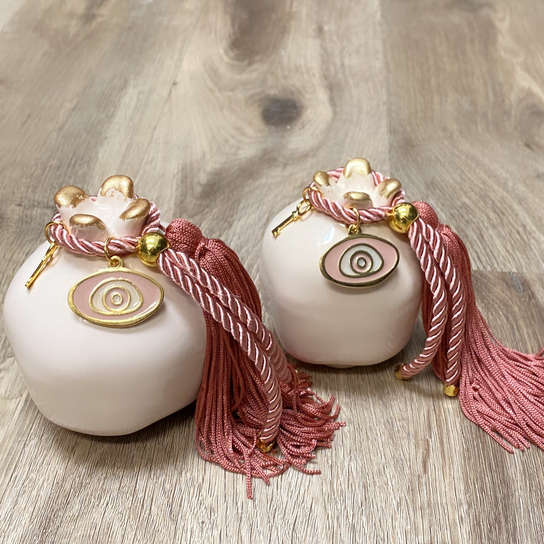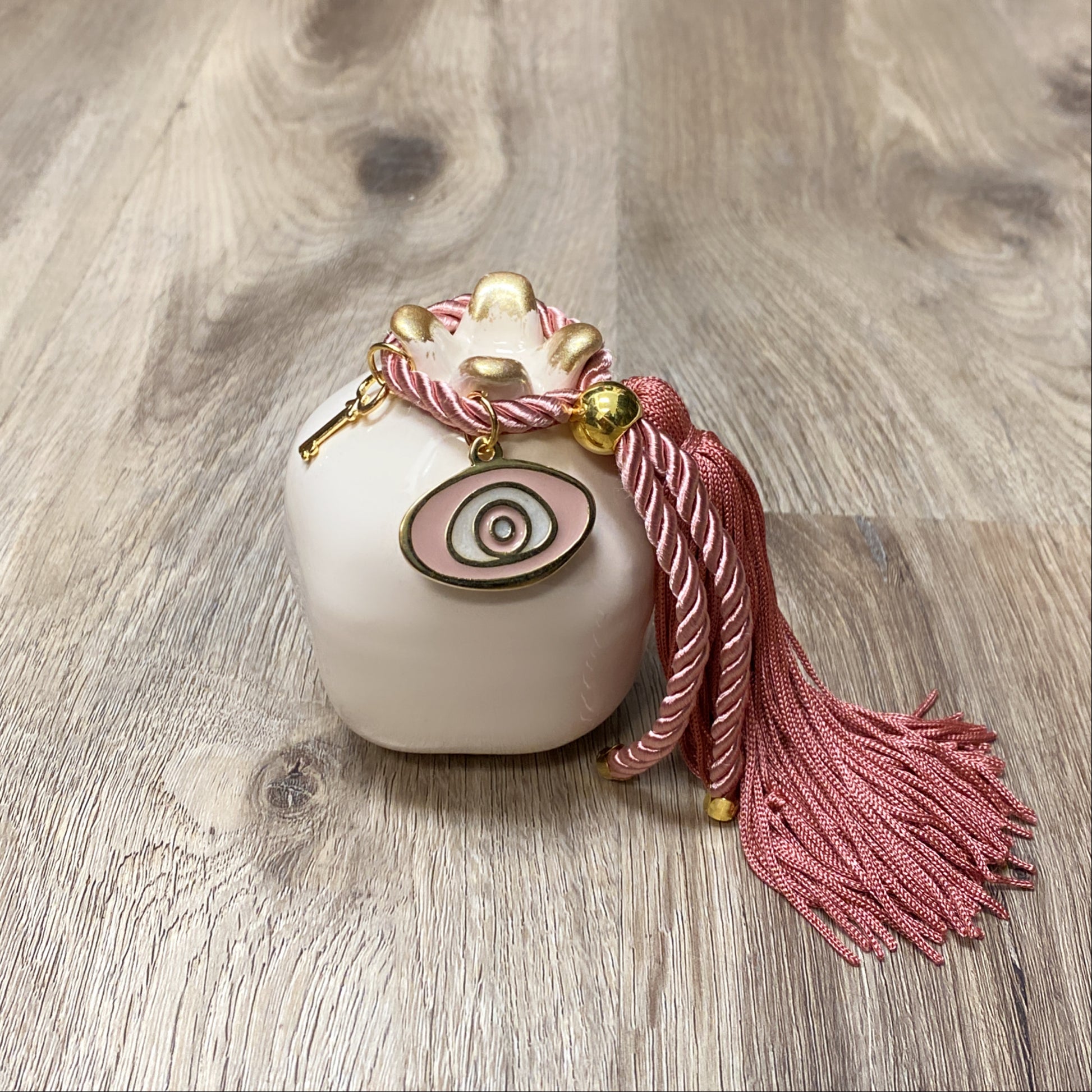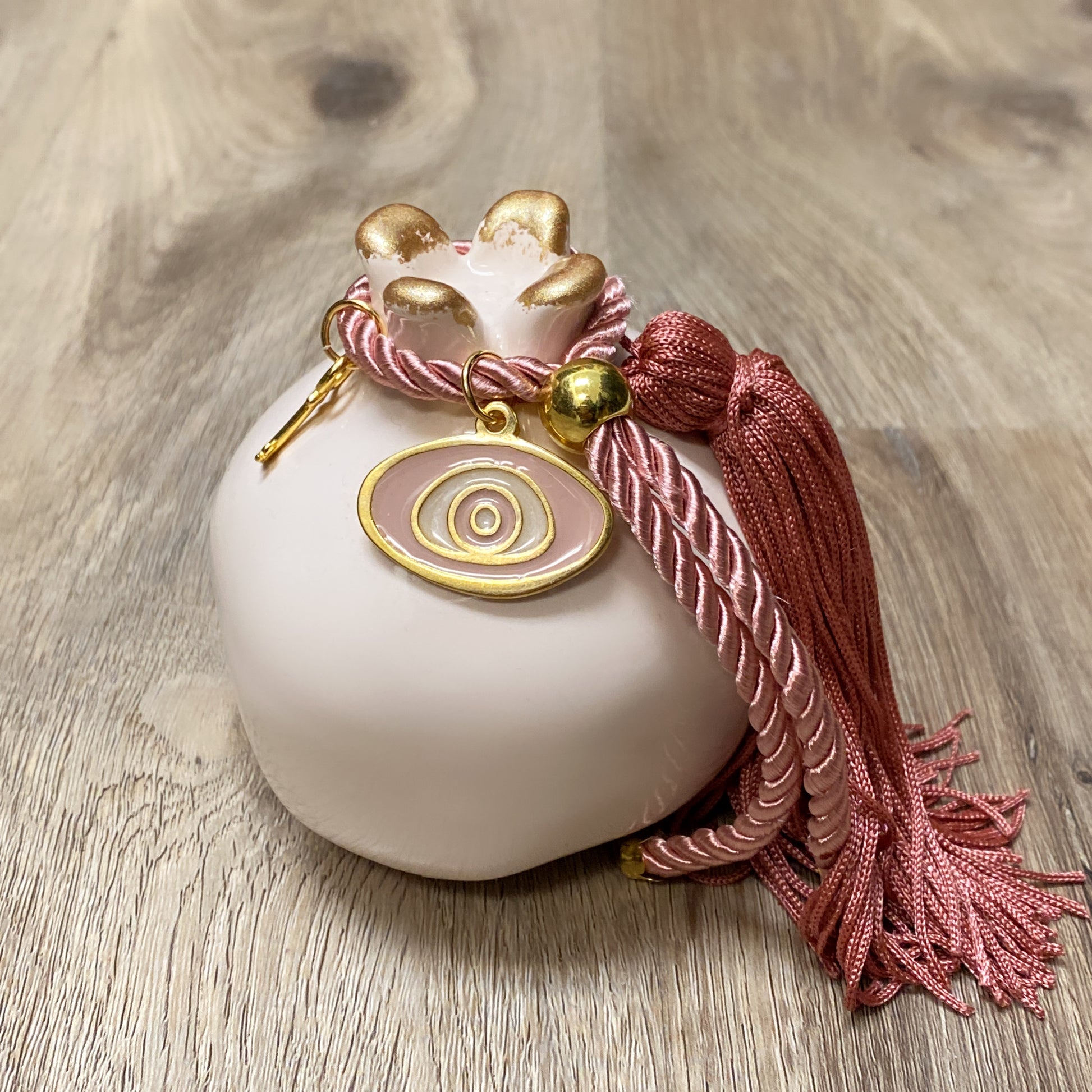 Grenade en céramique de couleur crème avec breloque œil rose et pompon. Porte-bonheur pour l'année. Un cadeau parfait pour une pendaison de crémaillère.