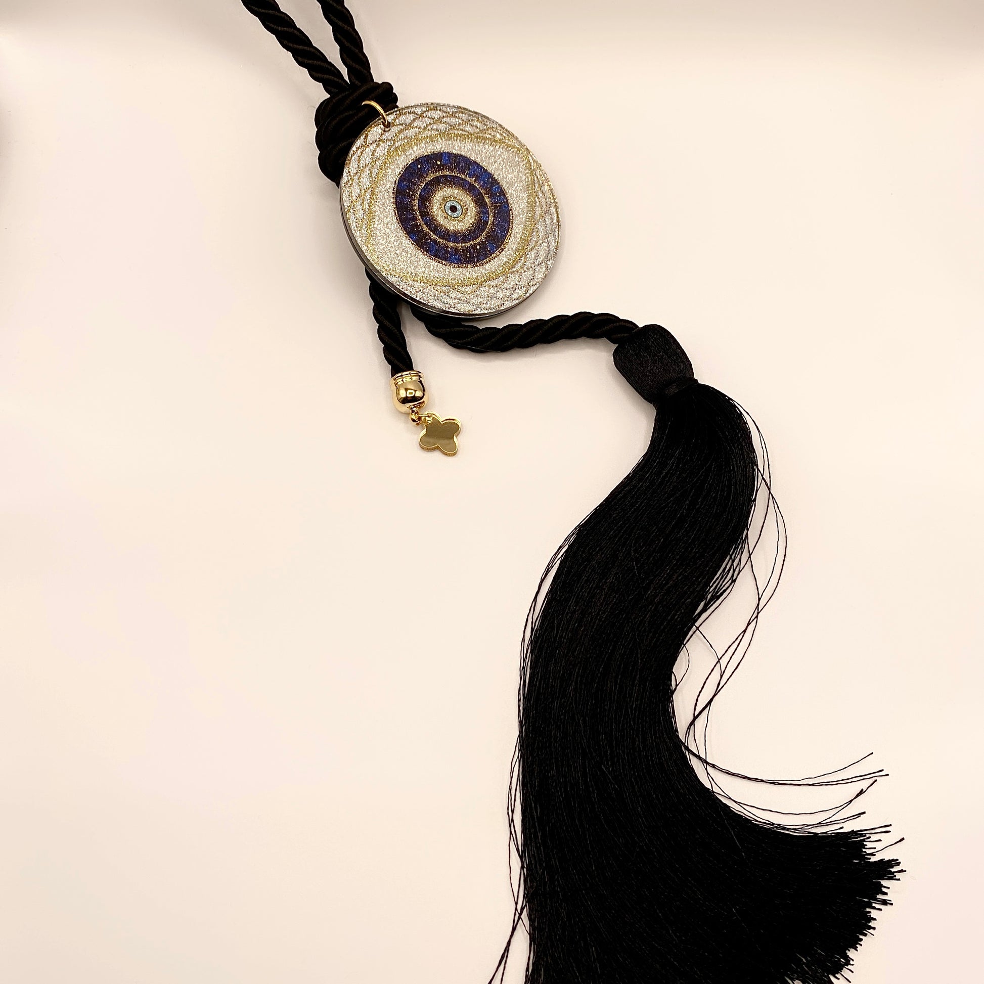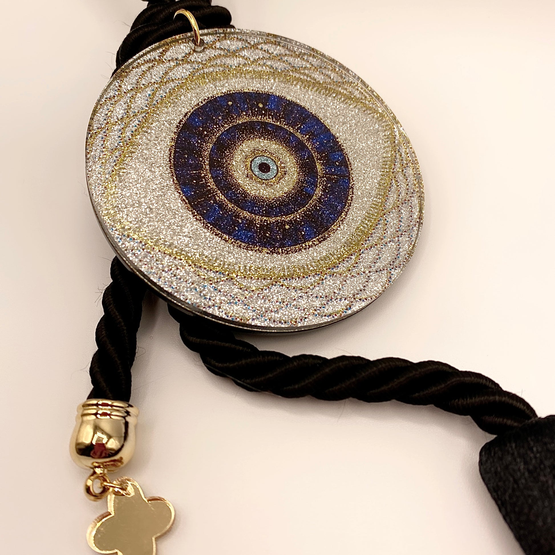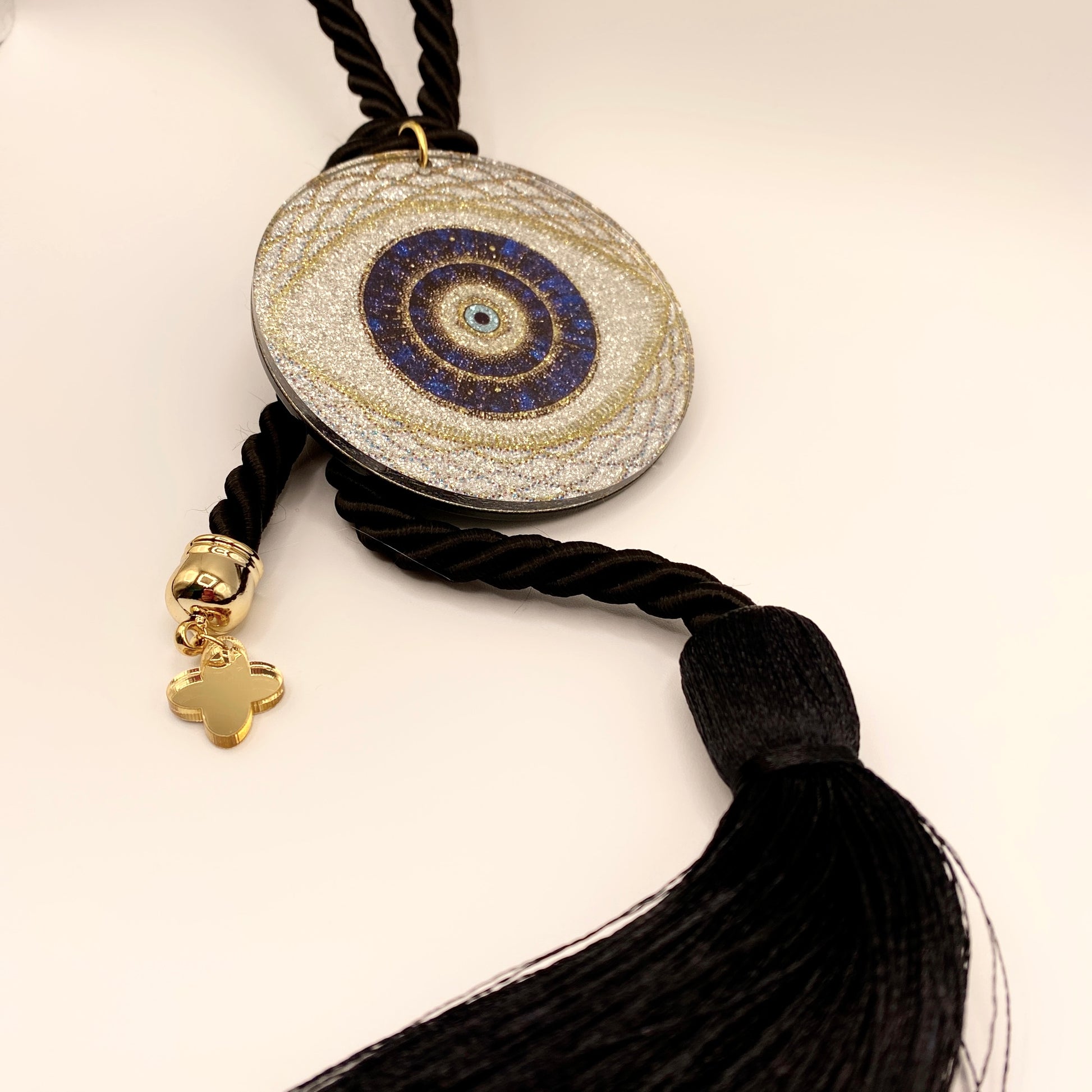 Une impressionnante corde noire avec un pompon noir, une breloque œil ronde en plexiglas avec des détails pailletés dorés et une délicate breloque croix pendante.