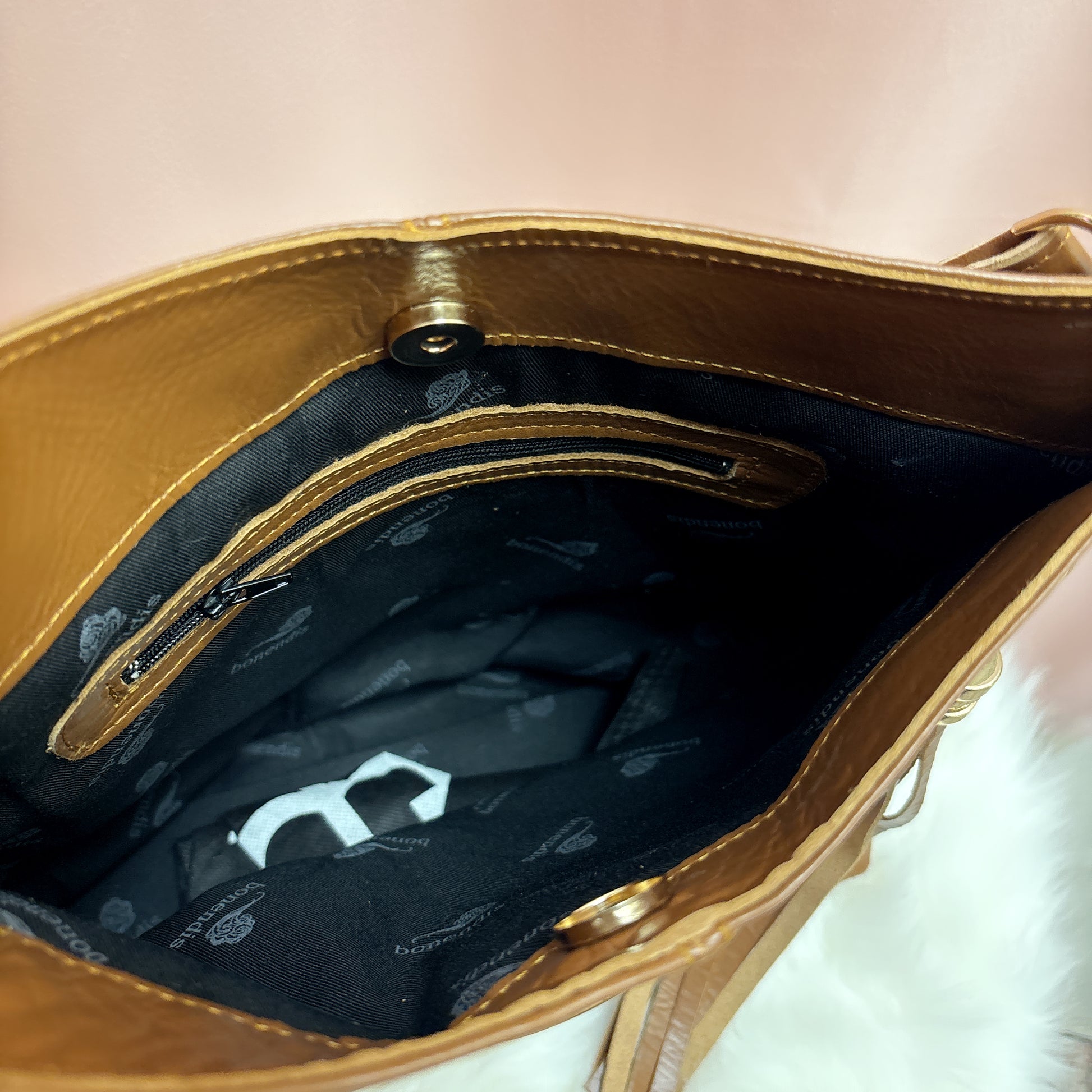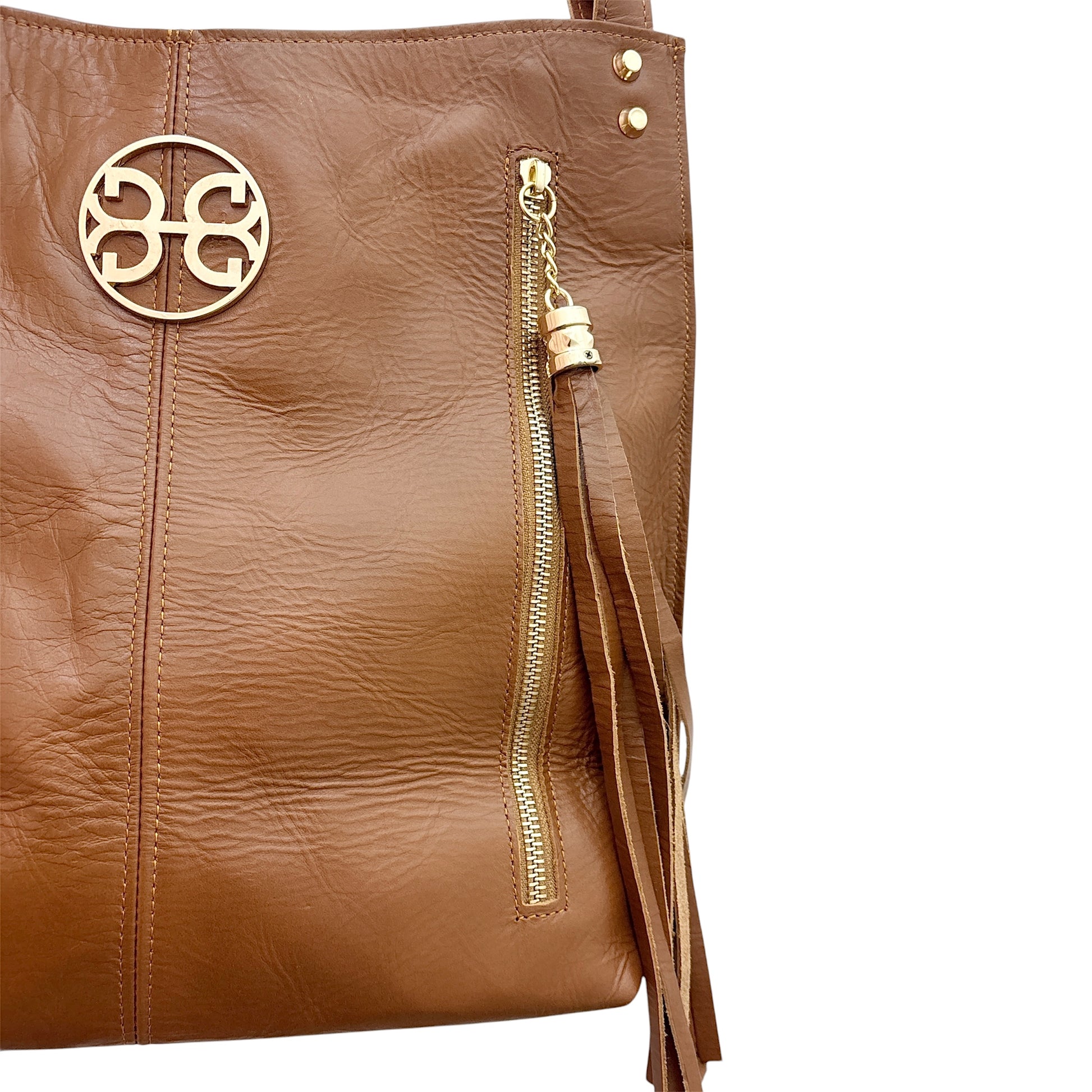 Découvrez notre luxueux sac cabas en cuir Chevie, confectionné en cuir marron riche, doté d'une poche avant zippée pratique, ornée d'un élégant pompon et d'une bandoulière cloutée. Sublimez votre look quotidien avec cet accessoire sophistiqué et exclusif.