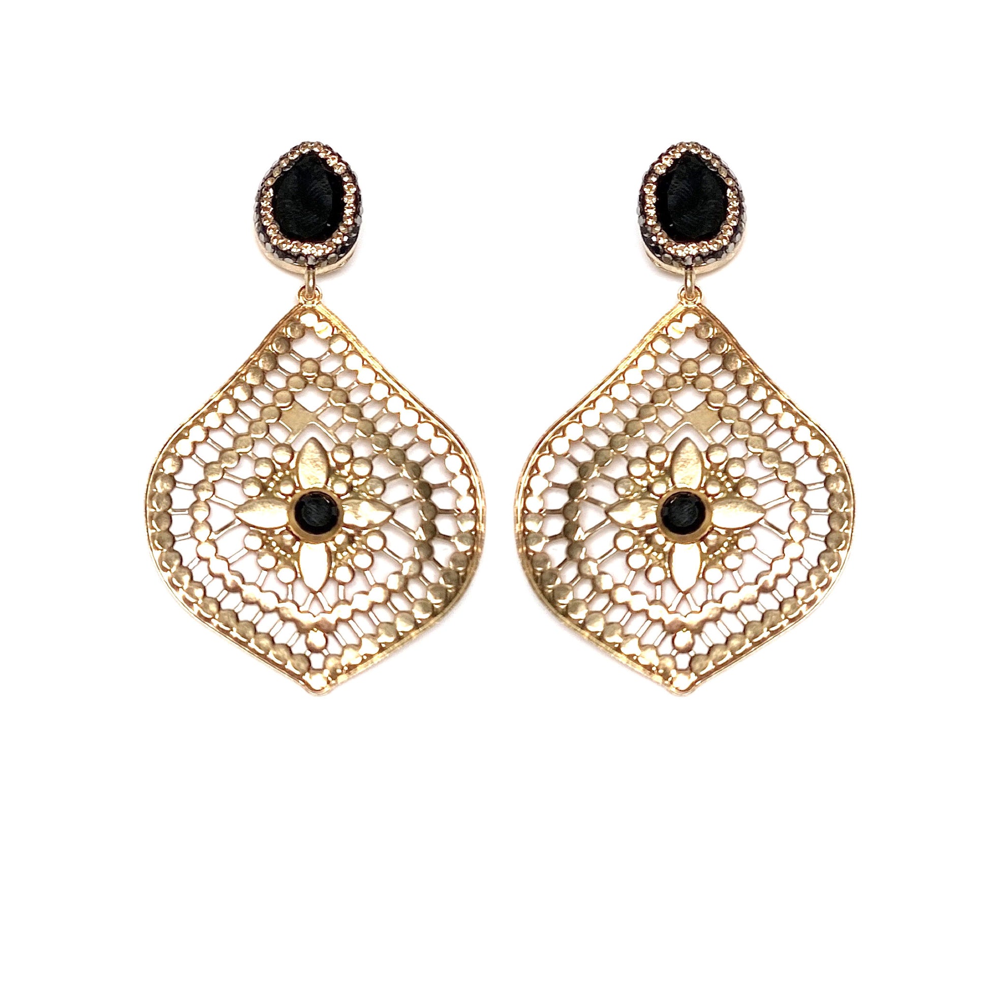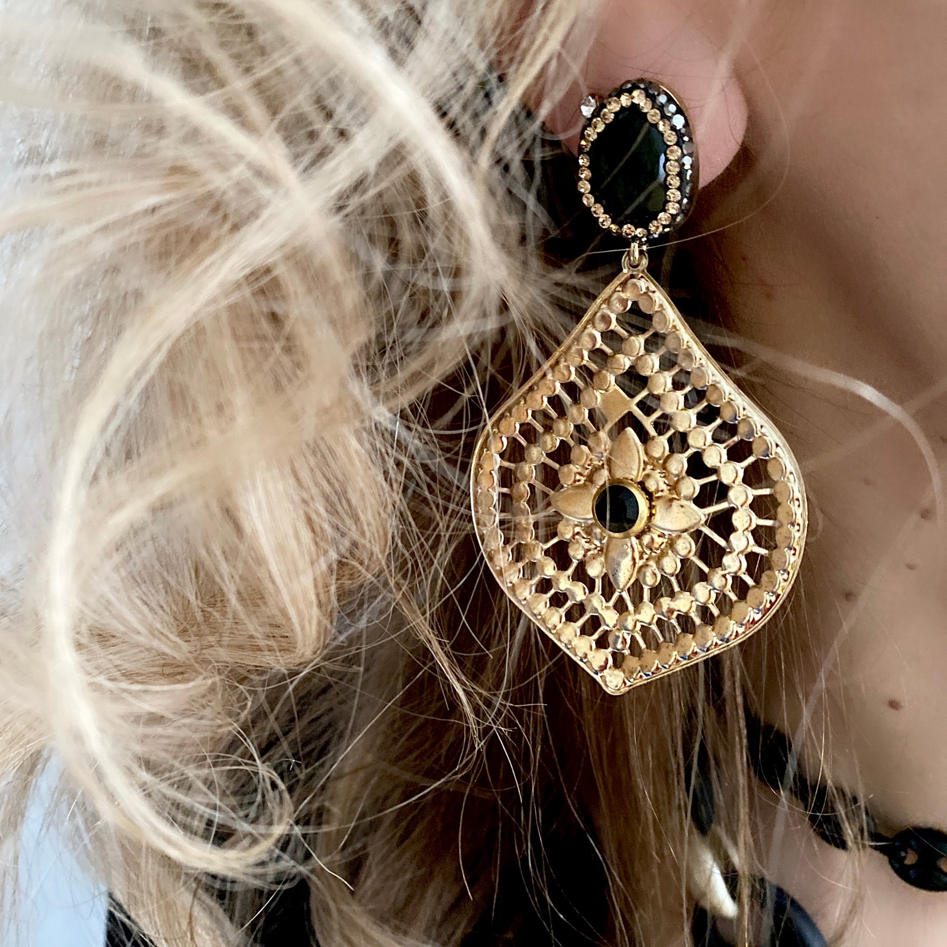 #1 Laiton plaqué or sculpté avec embellissements en verre noir (goutte de 3 pouces)