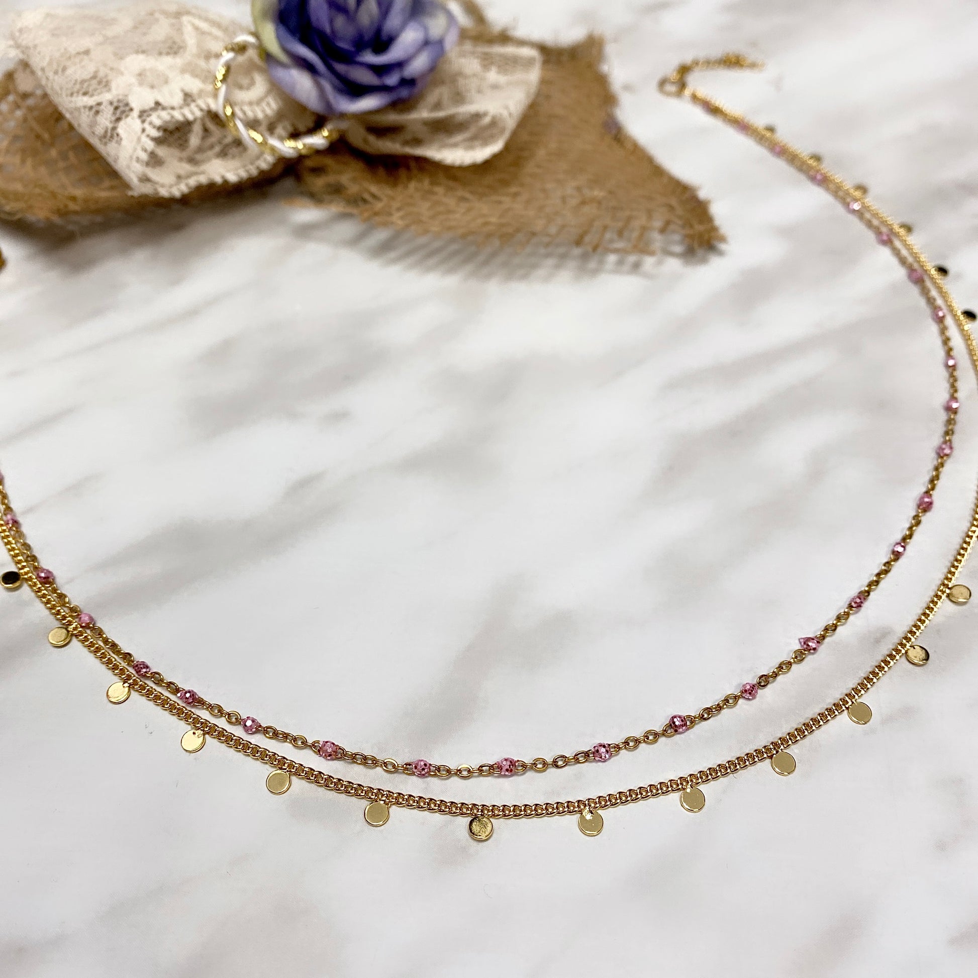 Collier double chaîne #2 (longueur 15"&17" avec extension) en acier inoxydable avec émail, laiton plaqué or.