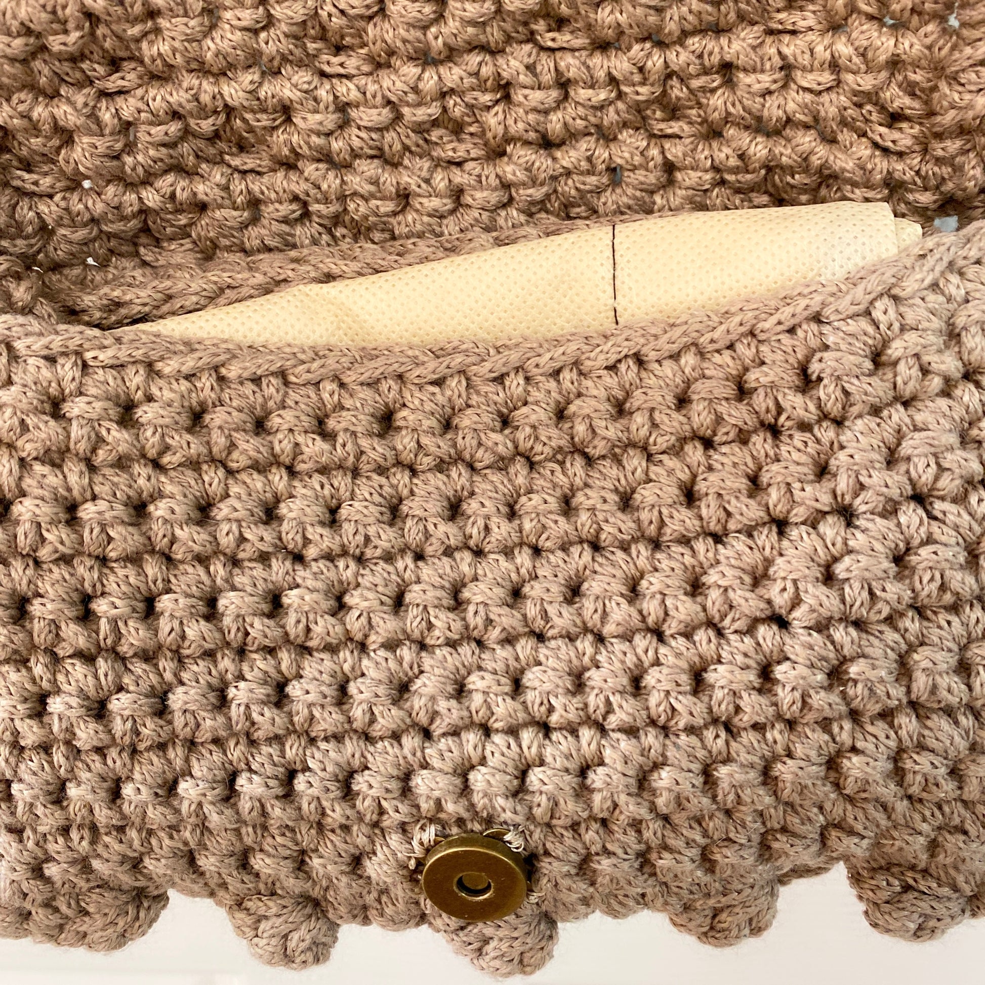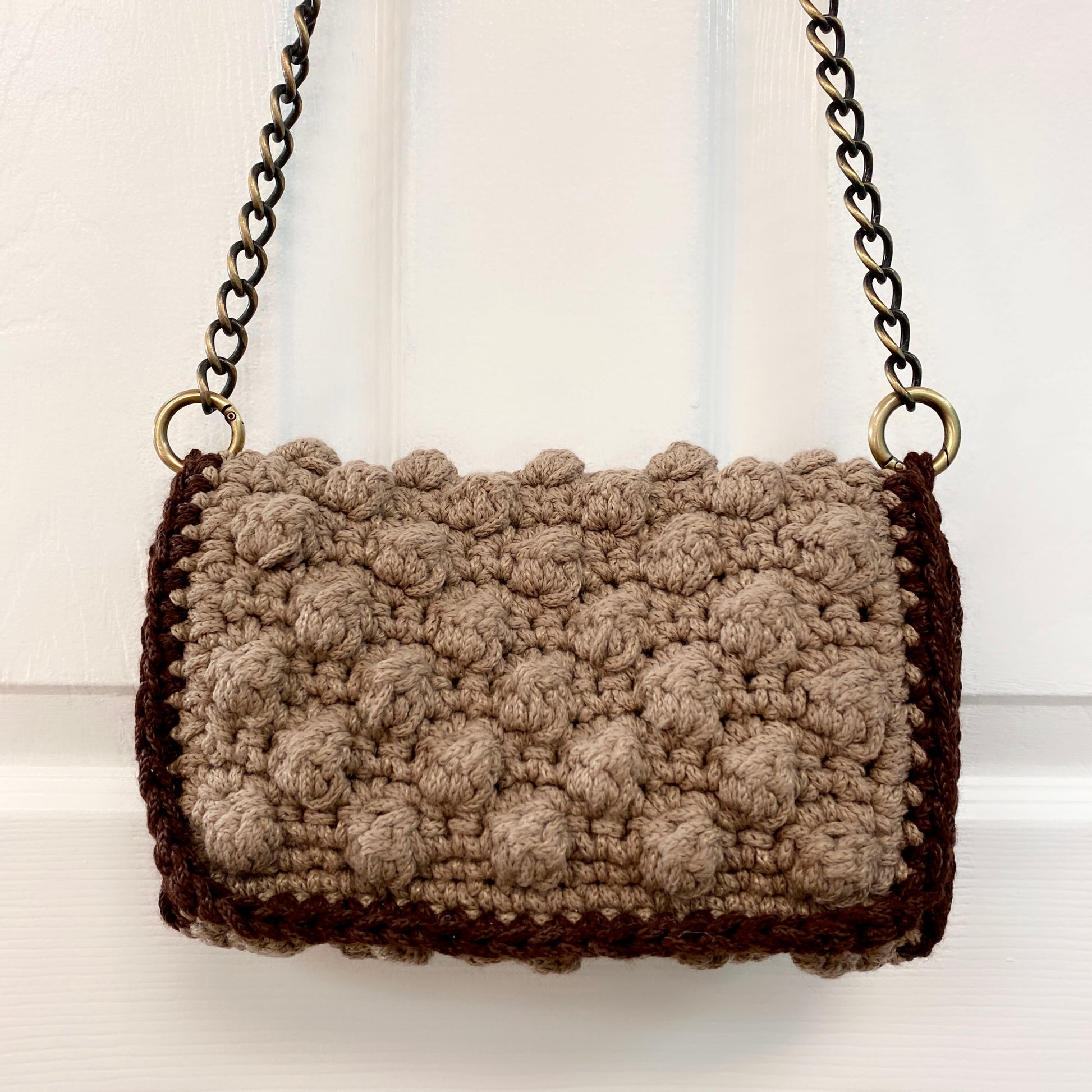 Sac fait main au crochet magnifiquement fabriqué à la main avec chaîne. Beige foncé avec bordure marron. Il peut être porté comme sac de soirée ou décontracté. Importé et fabriqué à la main en Grèce. Conception originale et maximum deux exemplaires