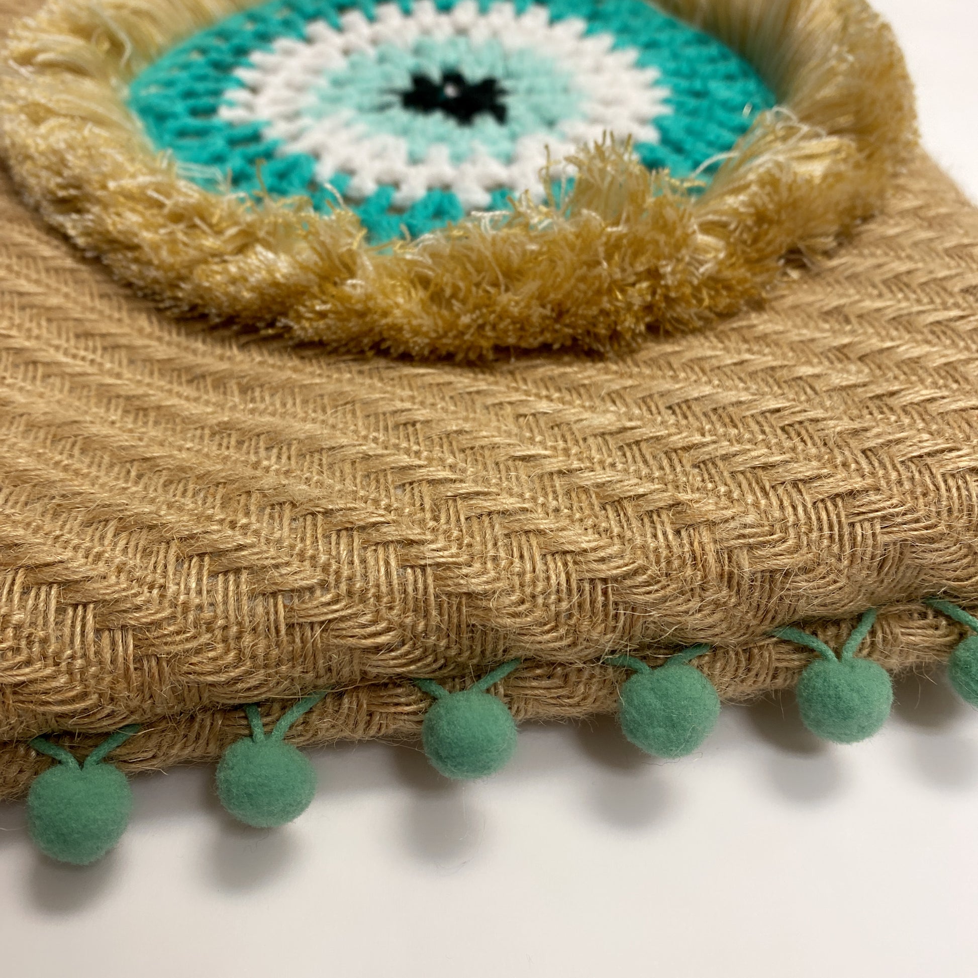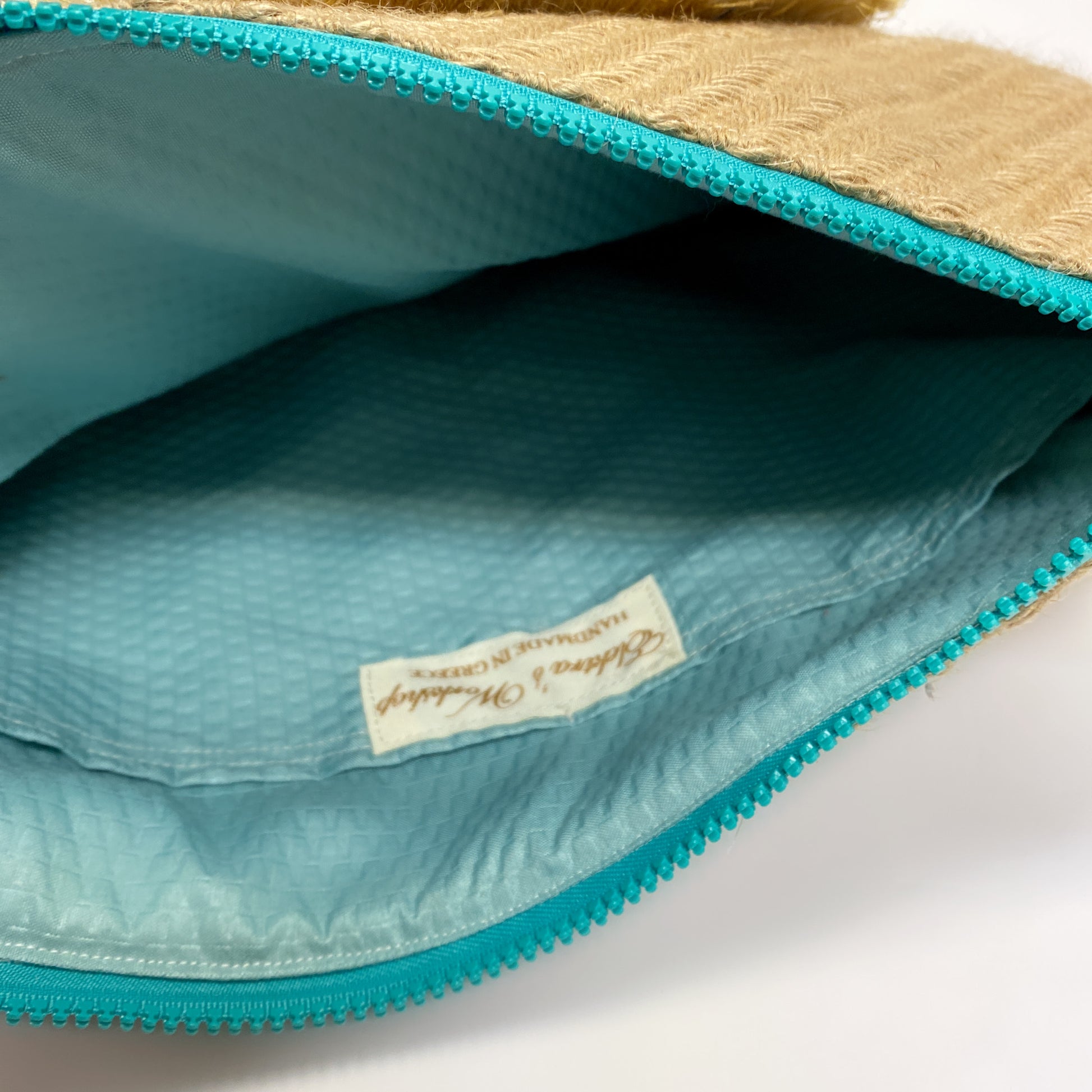 Une superbe pochette beige tapisserie avec un œil au crochet turquoise avec une frange tout autour. Le sac est profilé de petites boules turquoise.