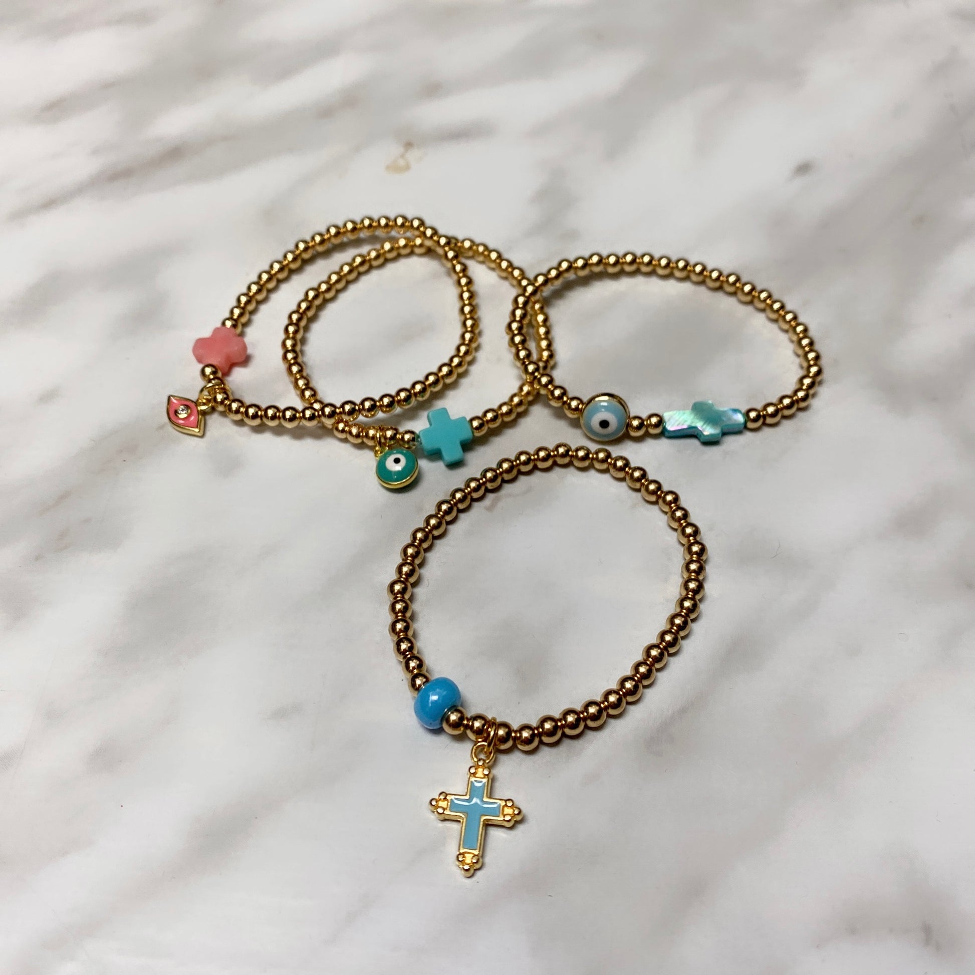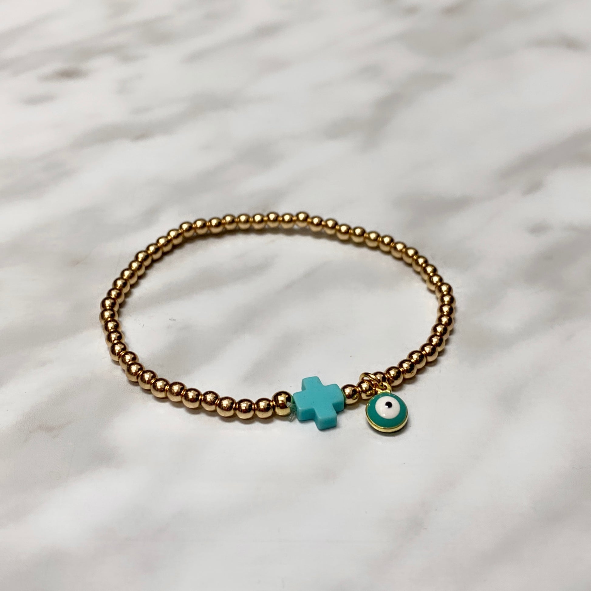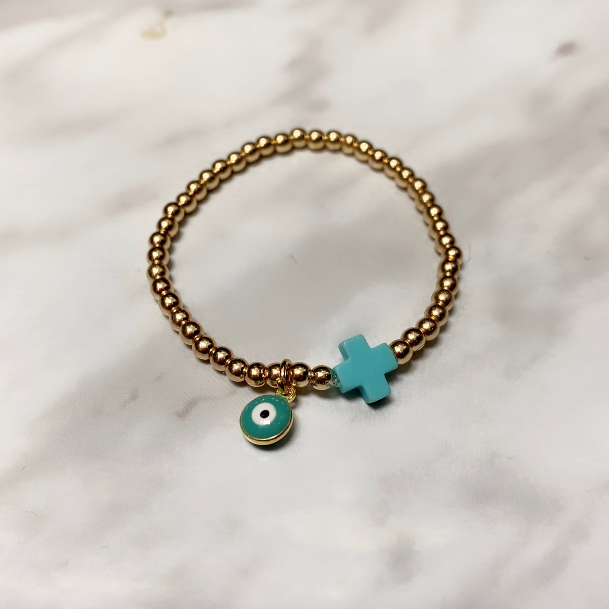 #3 (taille enfant) Hématite plaquée or 3mm avec oeil turquoise & croix turquoise (stretch),