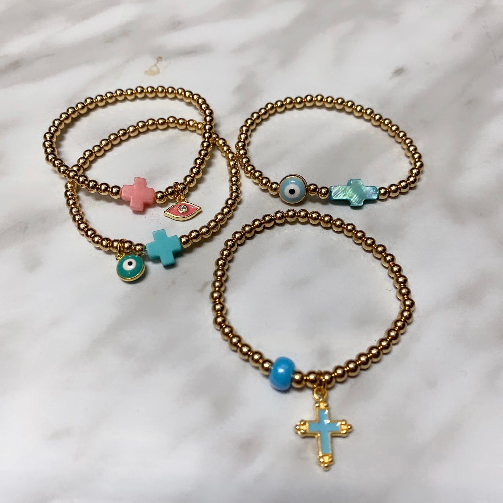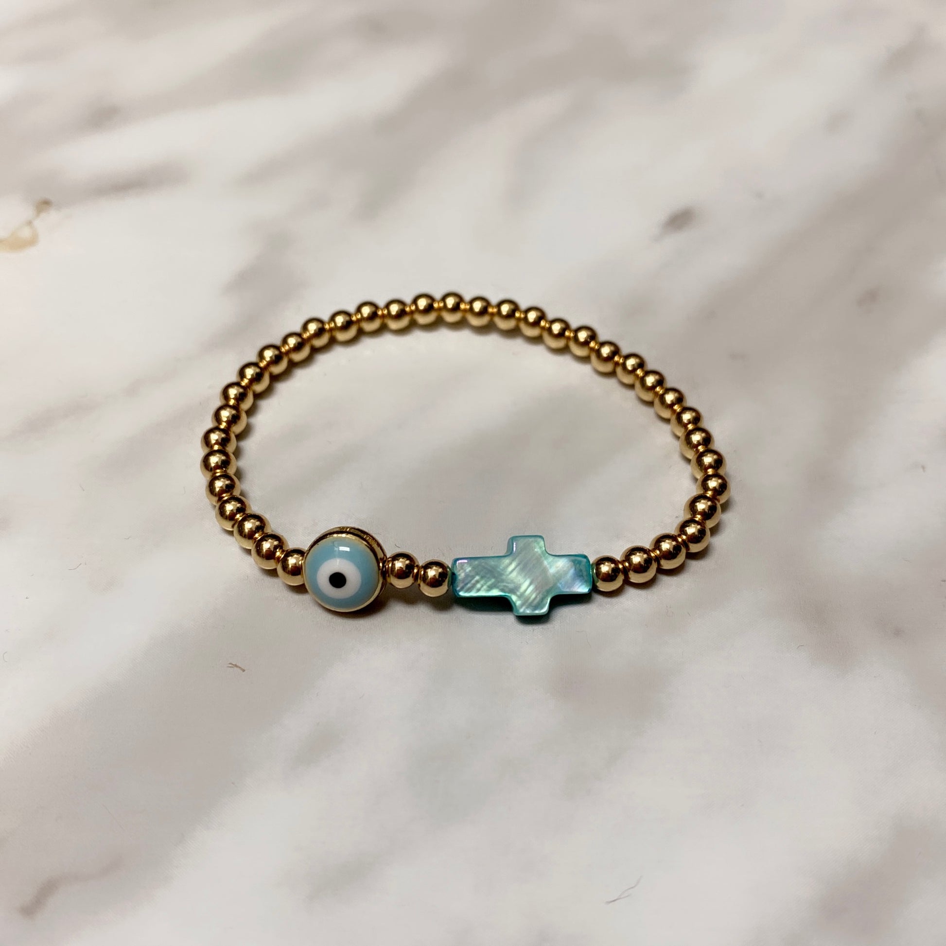 #6 (taille adulte)Hématite plaquée or 3mm avec oeil bleu clair & croix bleu clair (stretch),