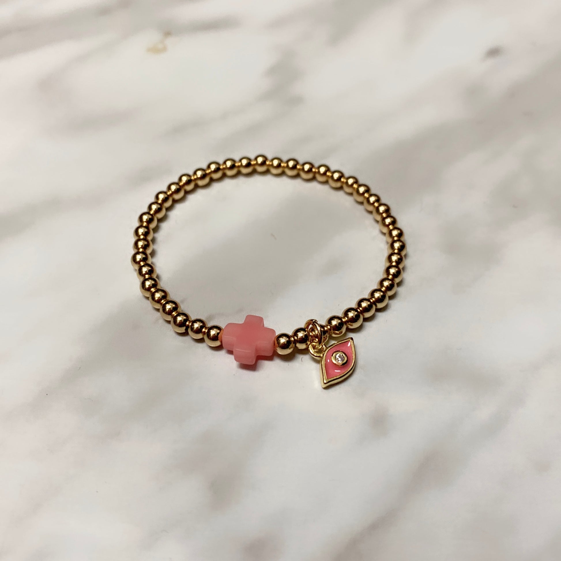 #1 (taille enfant) Hématite plaquée or 3mm avec oeil rose & croix rose (stretch),