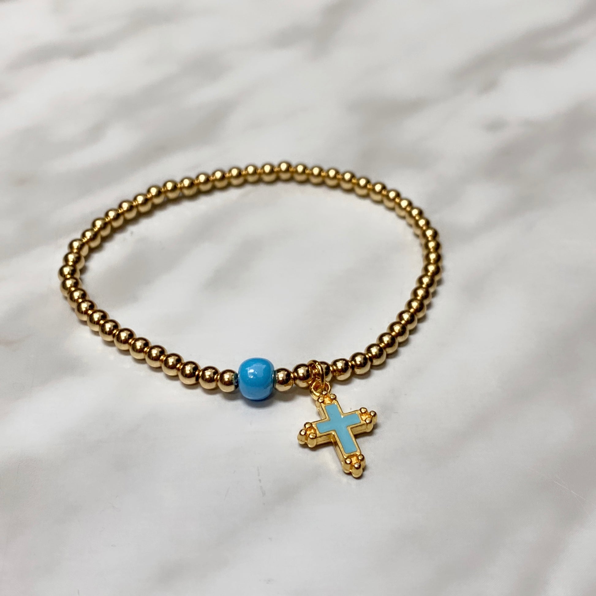 #7 (taille enfant) Hématite plaquée or 3mm avec perle bleue & croix bleue plaquée or (stretch),