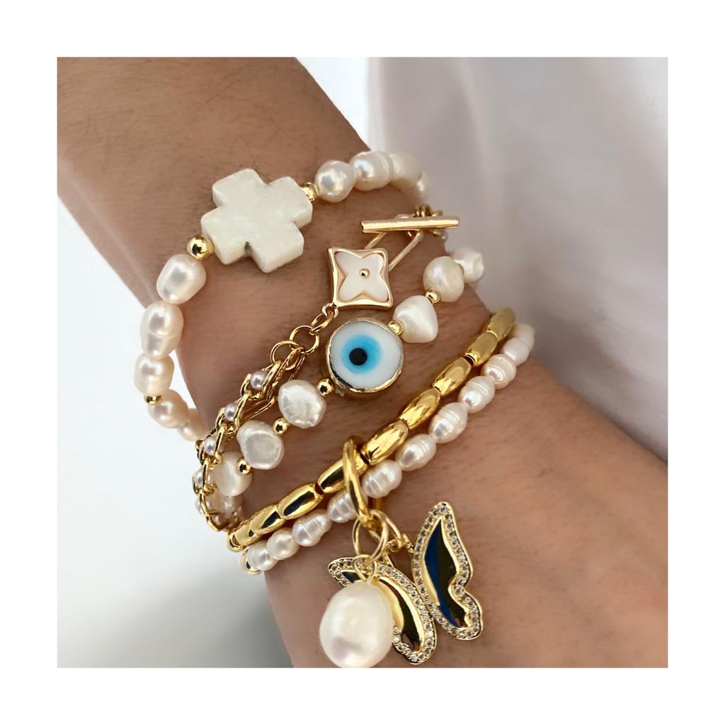 #4 Doubles perles en métal plaqué or avec perles d'eau douce et breloque papillon en perles (stretch)