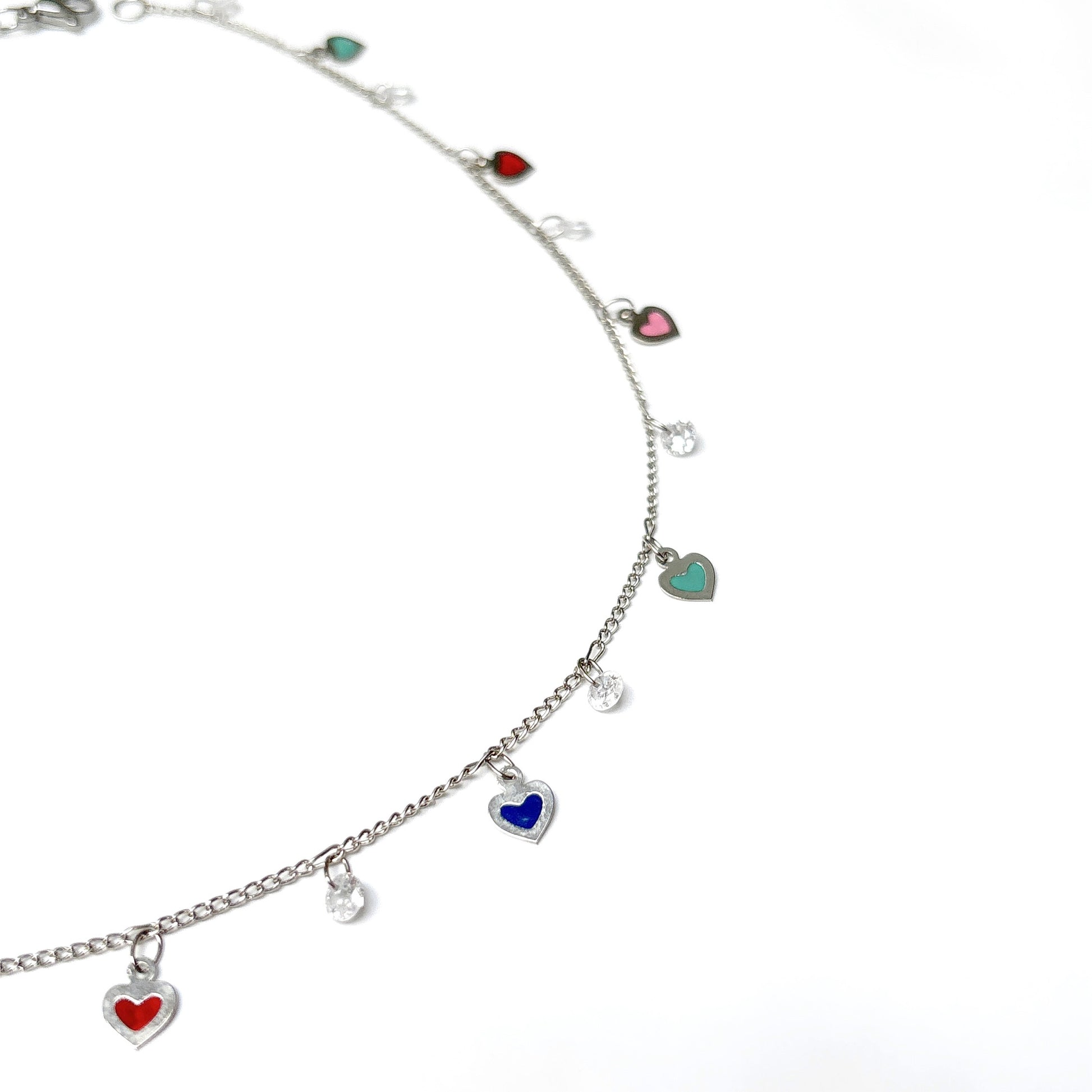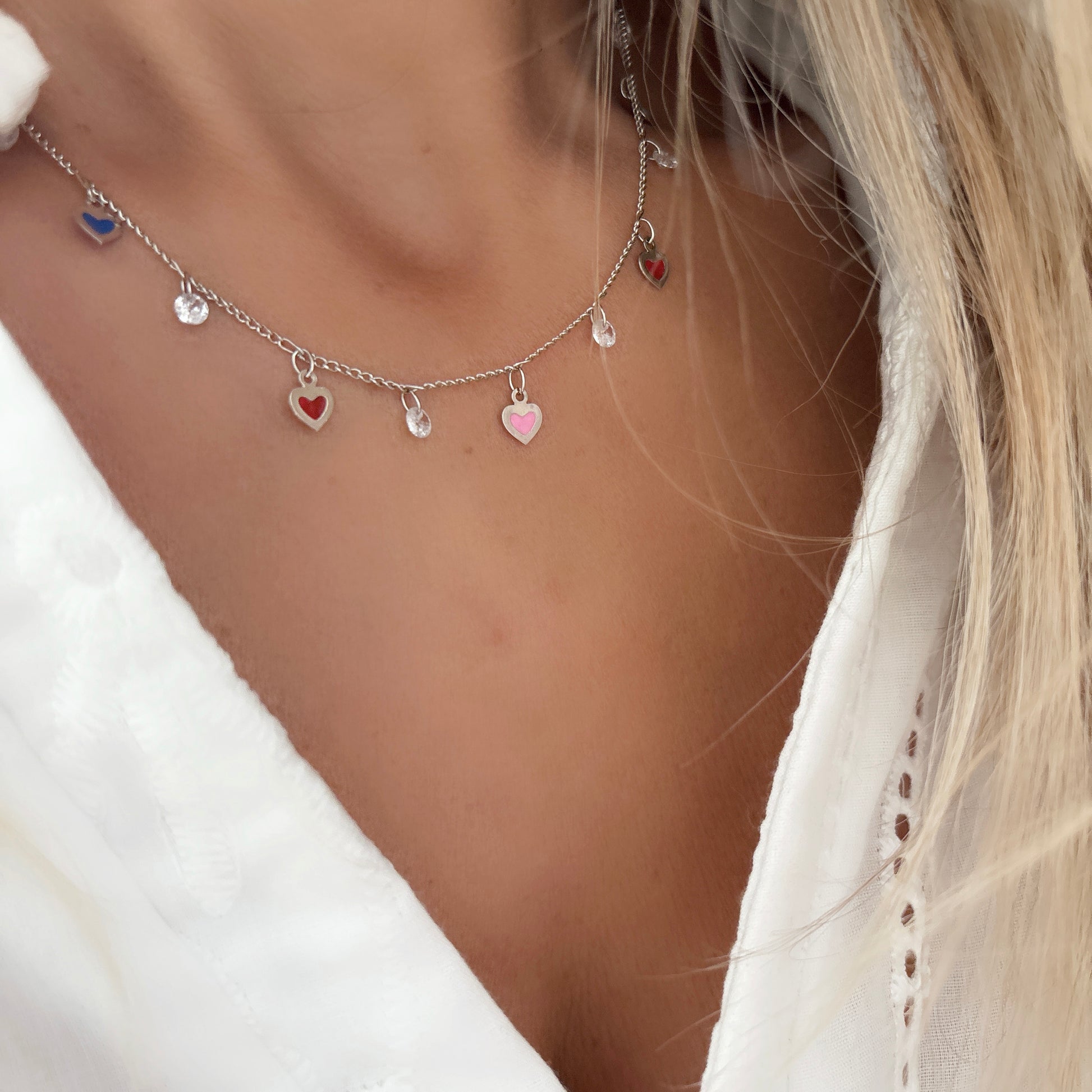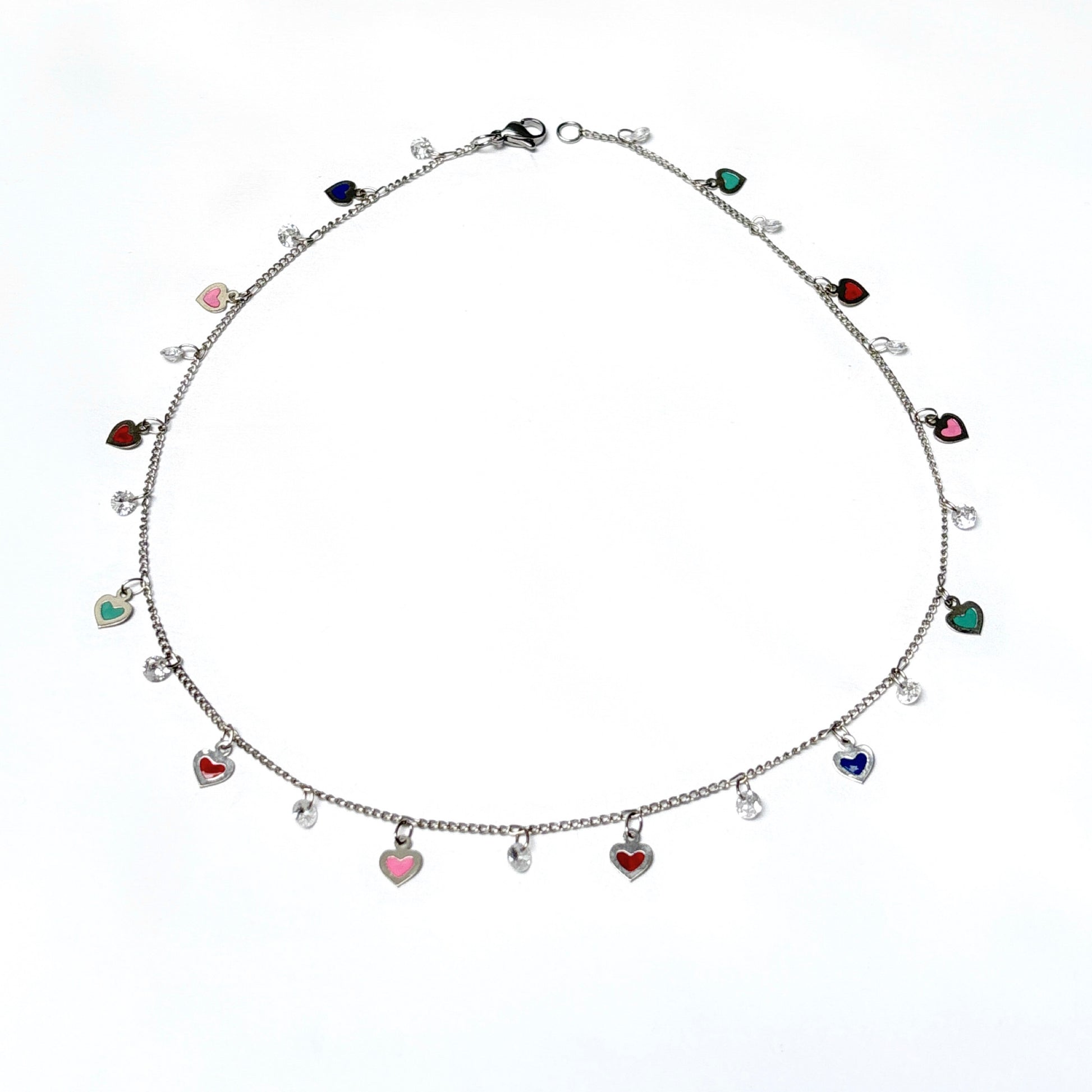 Ajoutez une touche de charme à votre tenue avec notre collier Darling. Cette jolie pièce est ornée de breloques en forme de cœur en émail multicolore et de pierres en zircone cubique étincelantes pour un look à la fois ludique et élégant. Parfait pour toutes les occasions, ce collier est l'accessoire idéal pour compléter votre ensemble.