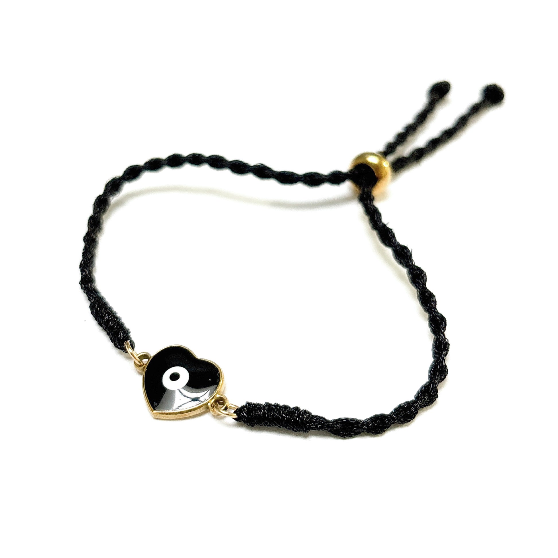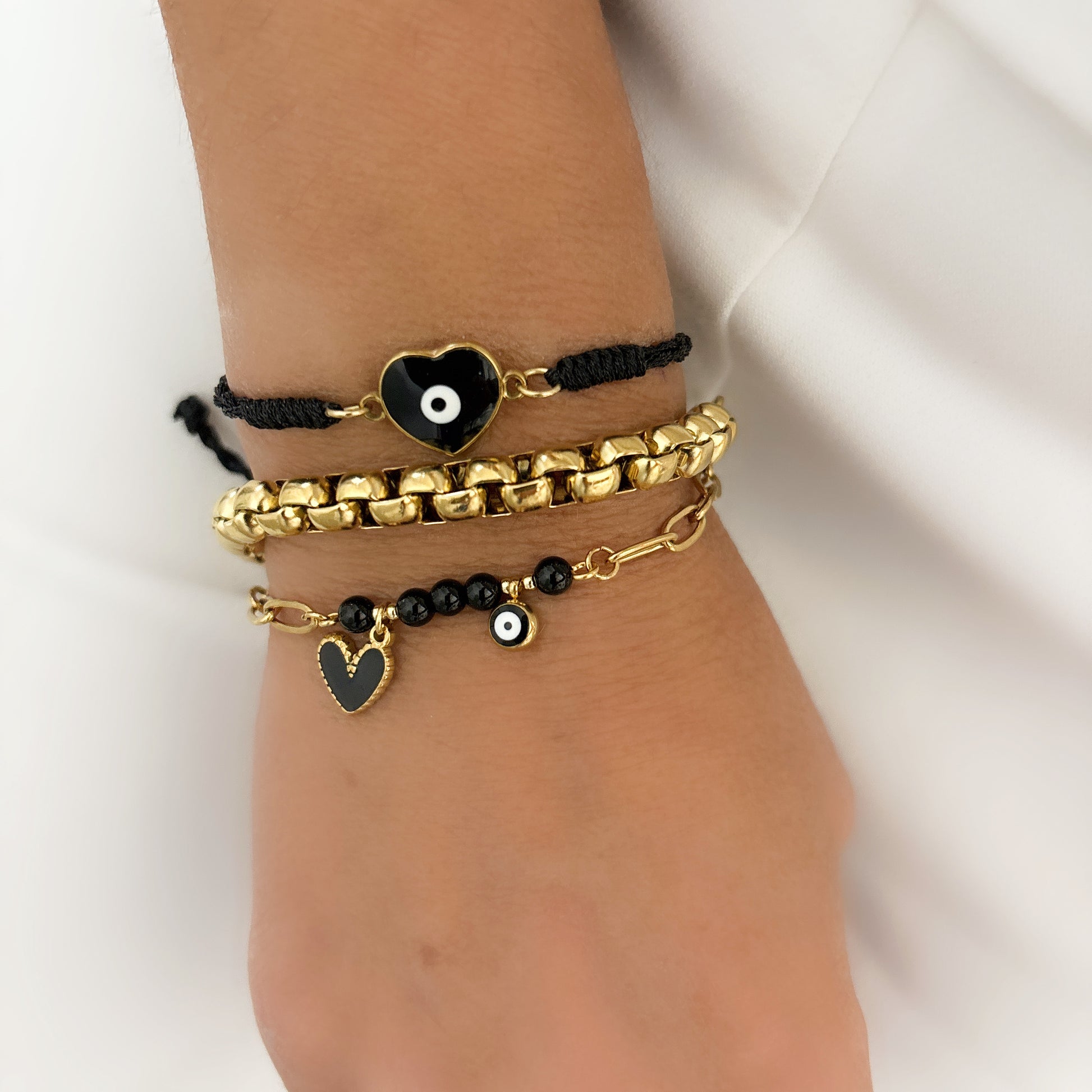 Conçus pour allier style et confort, nos BRACELETS DEMI sont dotés d'un bracelet en forme de cœur en cordon réglable, d'une chaîne épaisse en acier inoxydable et d'une chaîne trombone ornée d'une combinaison unique de cœur noir et de mauvais œil. Rehaussez n'importe quelle tenue avec cet accessoire tendance et polyvalent.