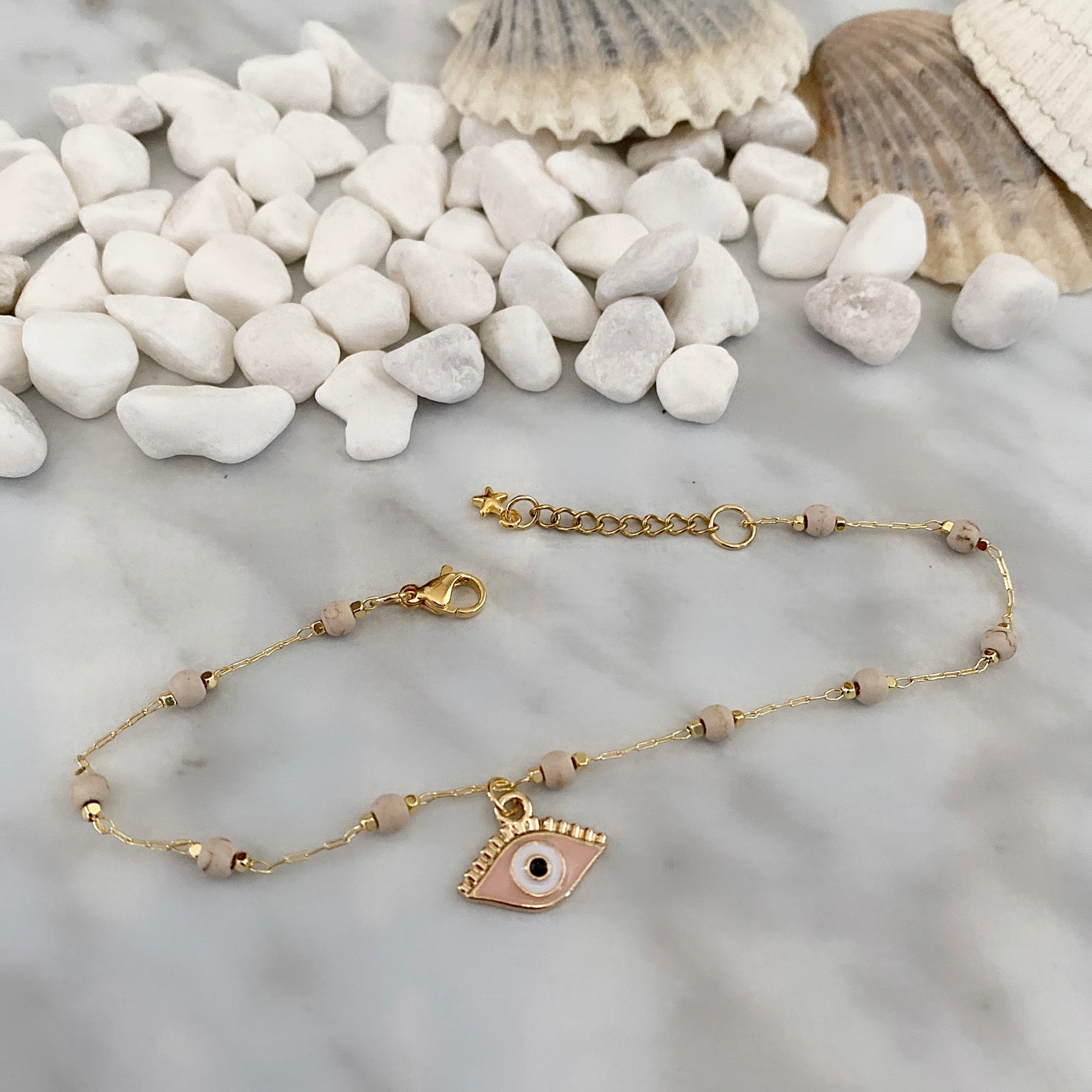 #3 Chaîne de pierres précieuses en laiton plaqué or avec breloque œil en émail