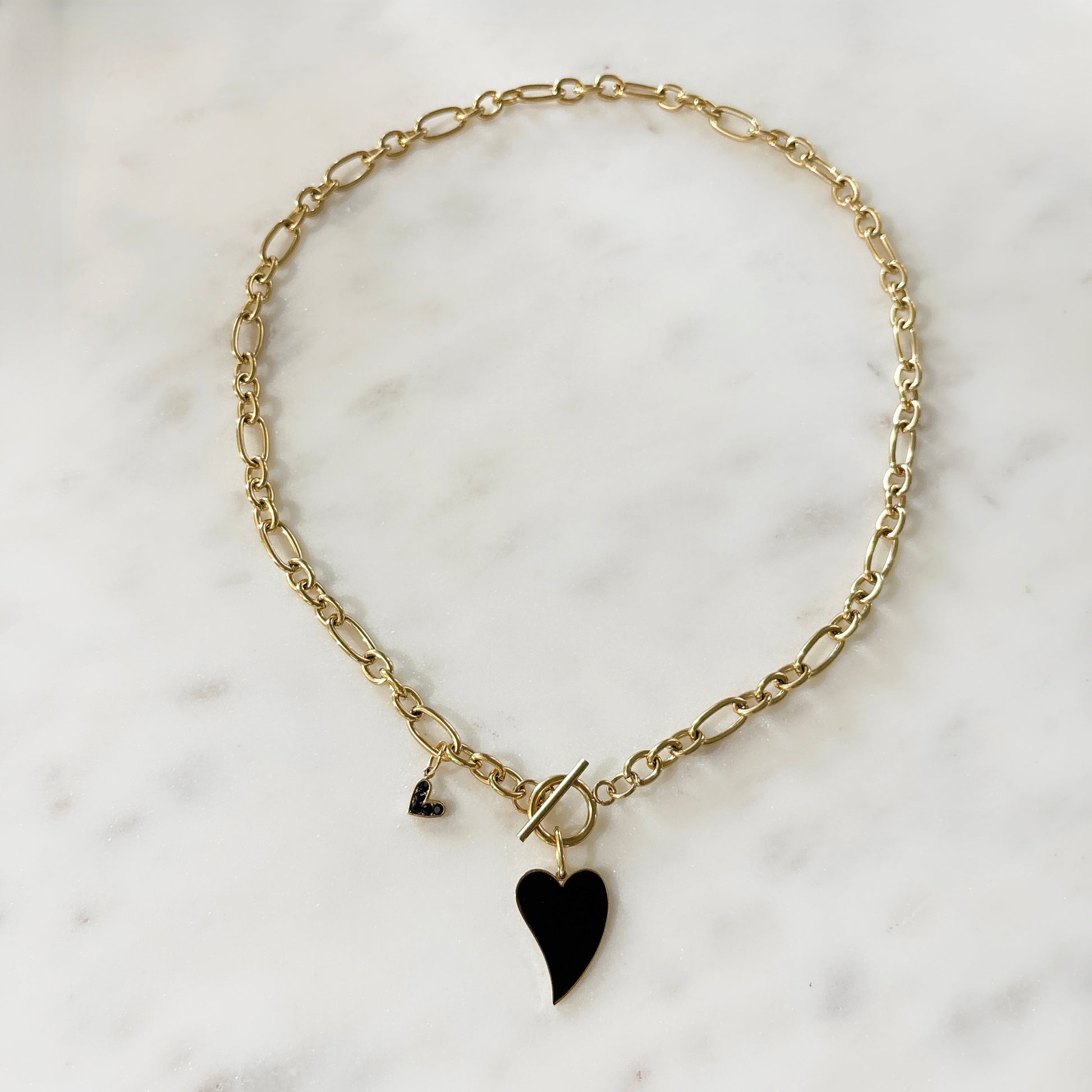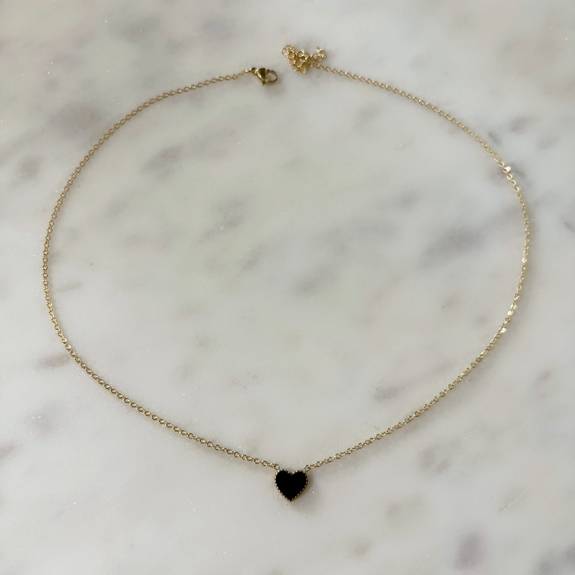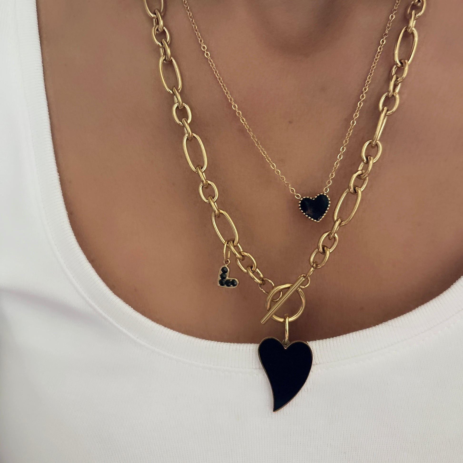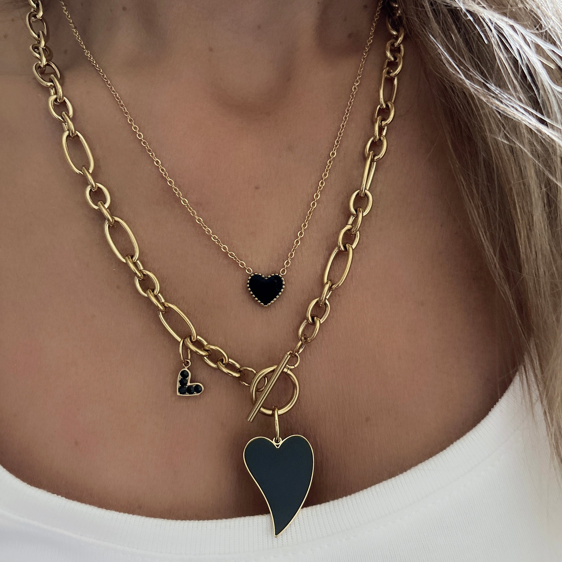 Rehaussez votre style avec les colliers Domna. Adoptez l'audace et la sophistication avec notre chaîne épaisse en forme de cœur noir, dotée d'un fermoir à bascule et d'une breloque scintillante en zircone cubique. Notre pendentif en forme de cœur délicat, fabriqué en acier inoxydable et plaqué or, ajoute une touche d'élégance délicate à n'importe quelle tenue.