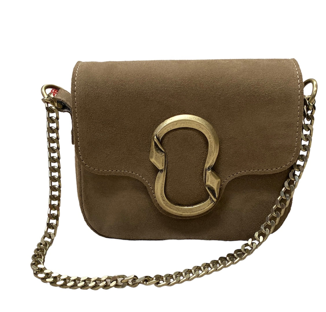 Sac en daim avec rabat et boucle magnétique, peut être maintenu par une courte chaîne d'épaule ou une longue bandoulière en daim