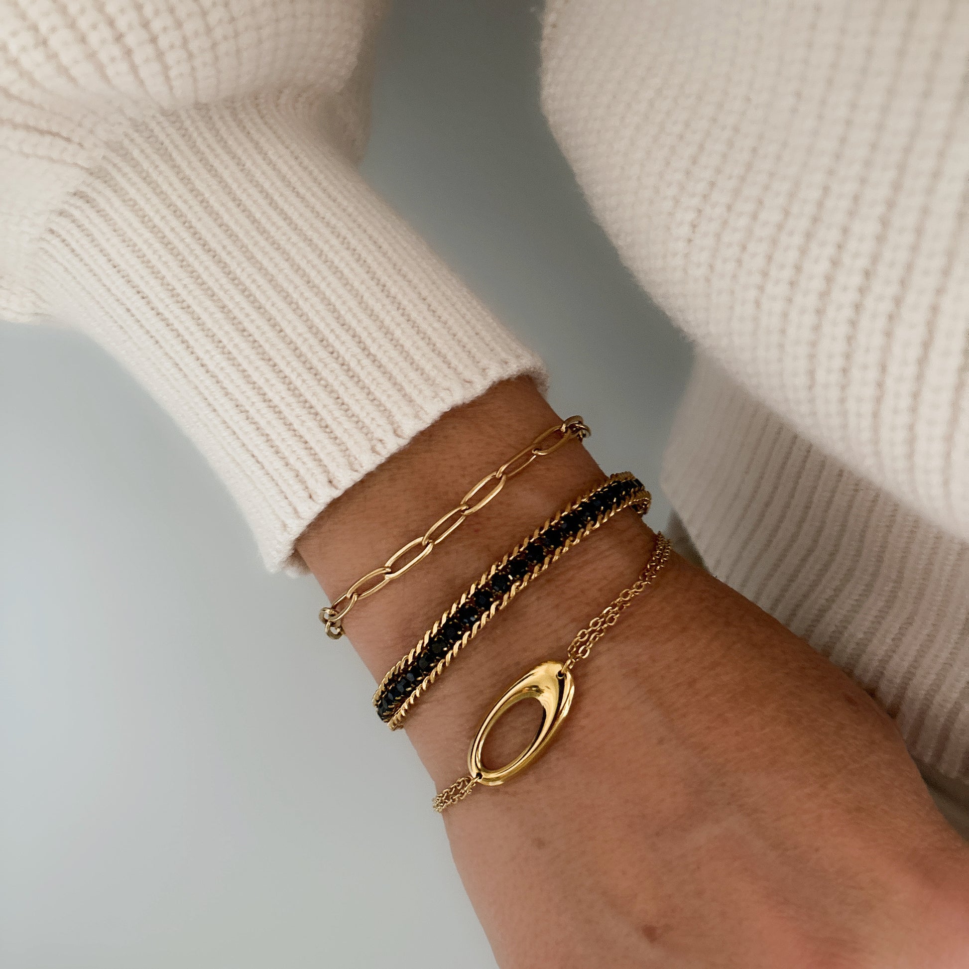 Rehaussez votre look quotidien avec nos BRACELETS ELIANA ! Ce trio parfait comprend une chaîne trombone élégante, une chaîne en zircone cubique éblouissante (bleu foncé) et une chaîne double au design ovale chic. Ajoutez de l'élégance et de l'éclat à n'importe quelle tenue et sentez-vous confiante et puissante avec ces bracelets.