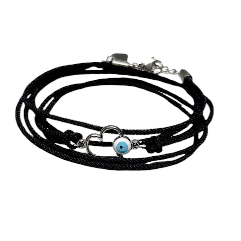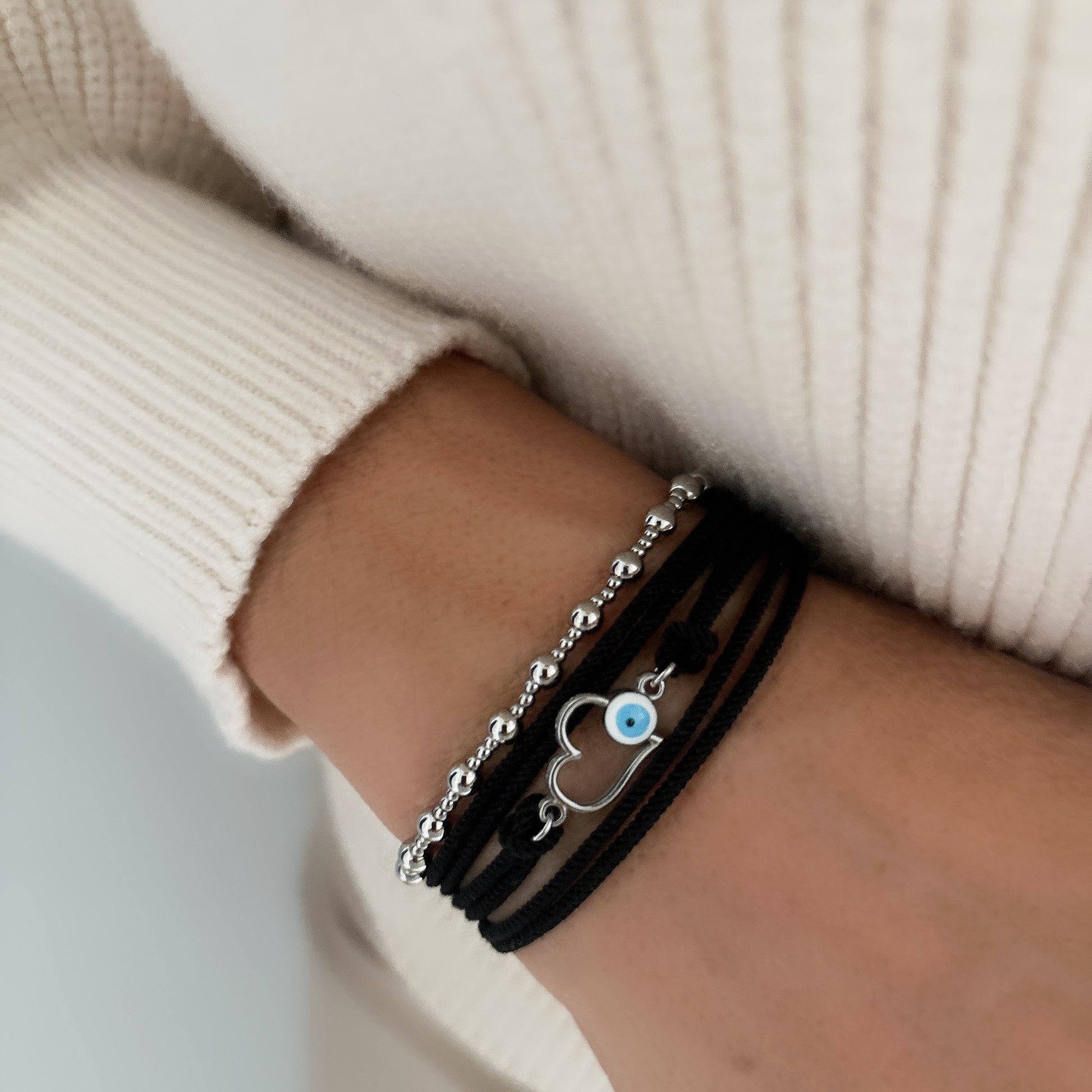 Bénéficiez d'une protection élégante avec les bracelets ERATO ! Le bracelet en cordon noir est orné d'un cœur central avec un mauvais œil pour la défense spirituelle. Associé à un bracelet extensible orné de perles en acier inoxydable, cet ensemble est la combinaison parfaite de mode et de fonctionnalité.