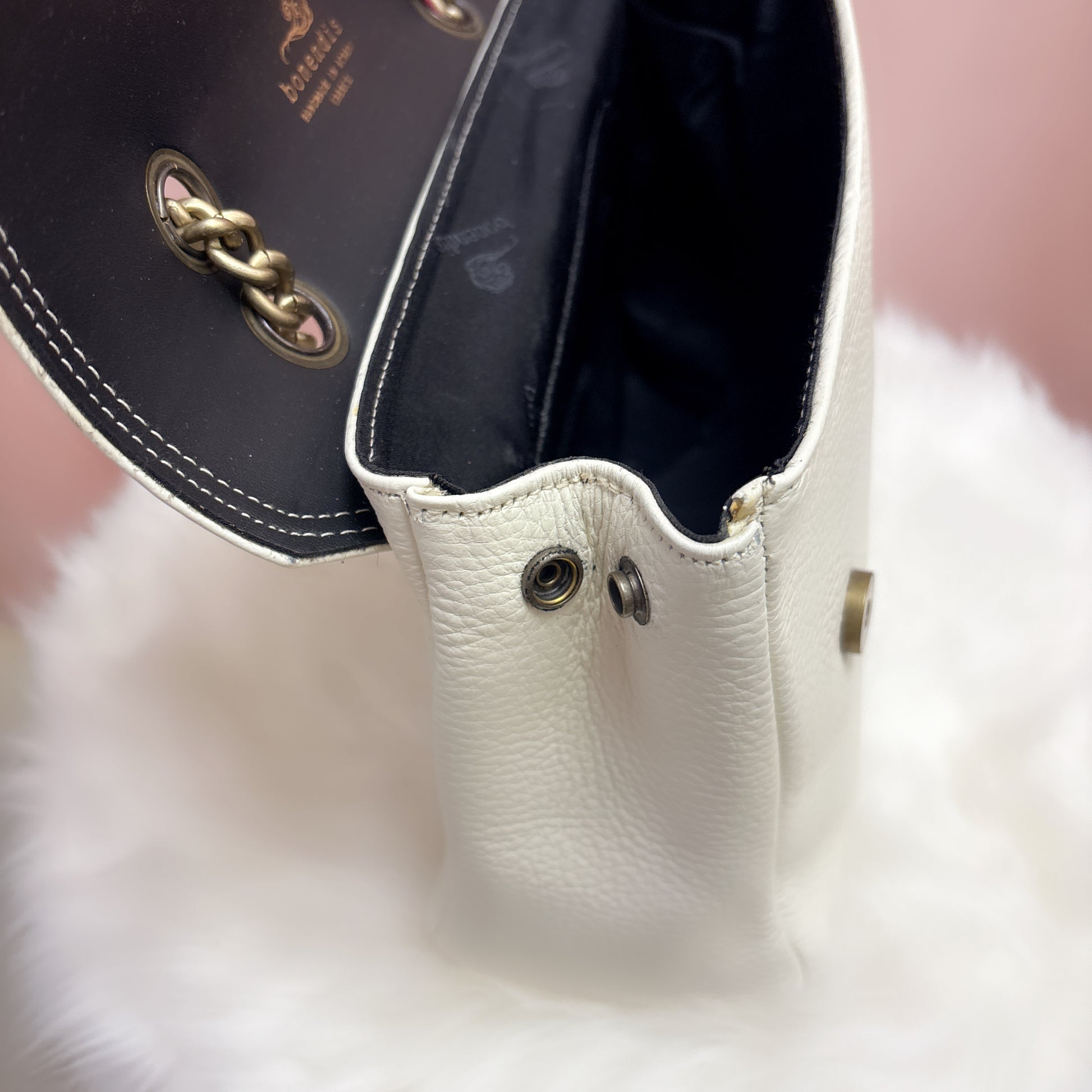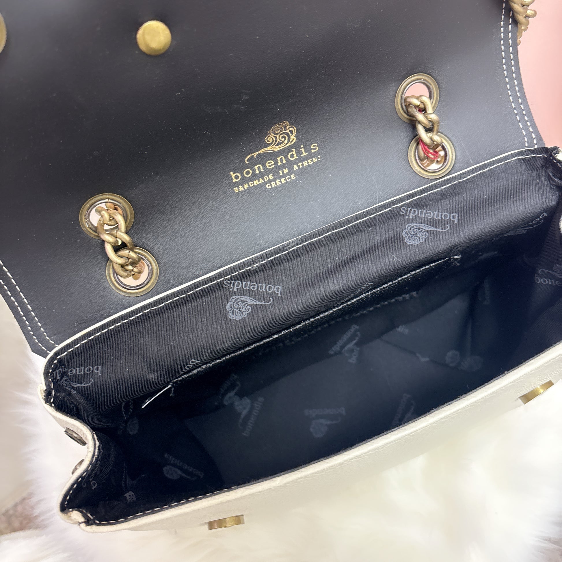 Sac en cuir blanc avec rabat, boucle magnétique et superbe finition résistante. Longue chaîne double, comme illustré.