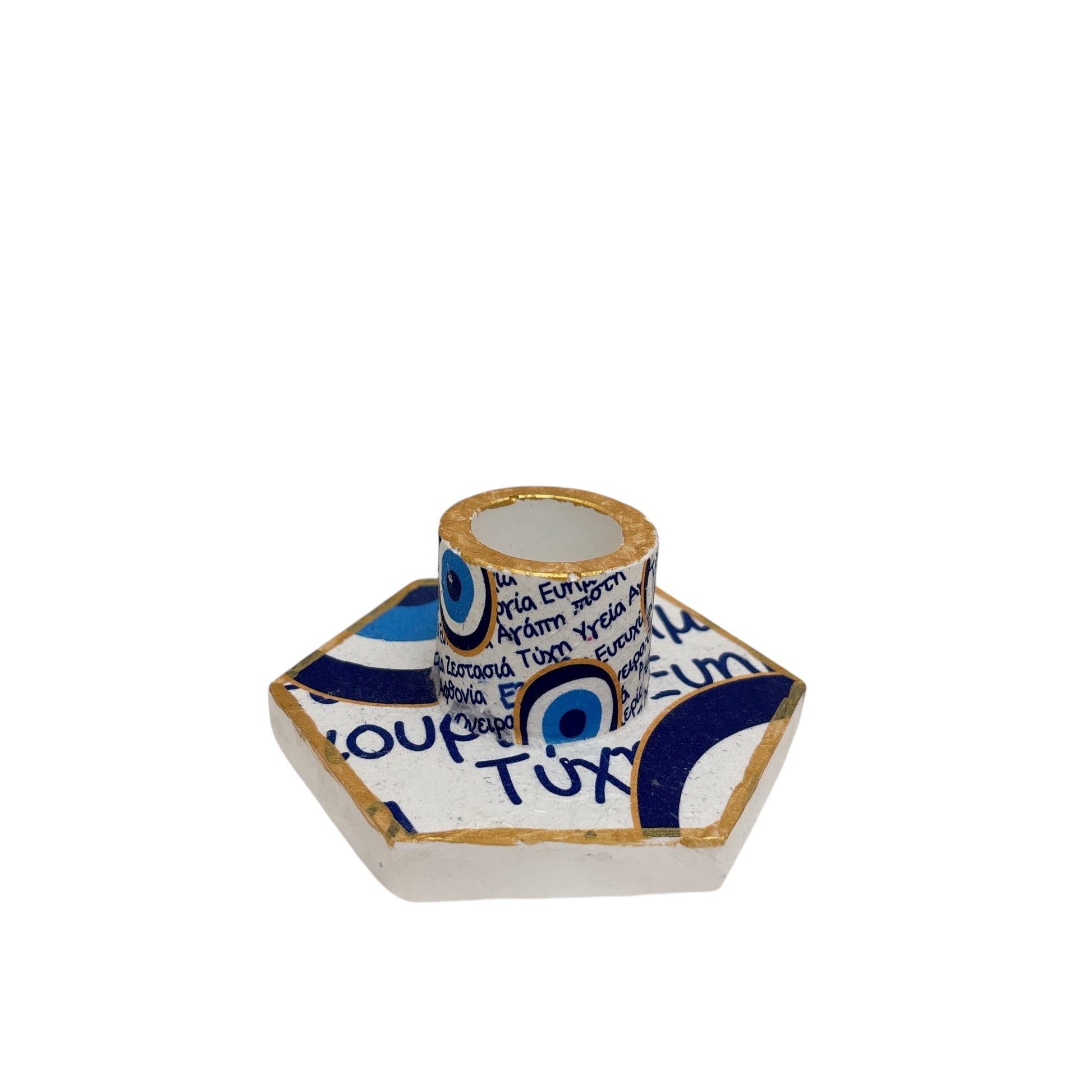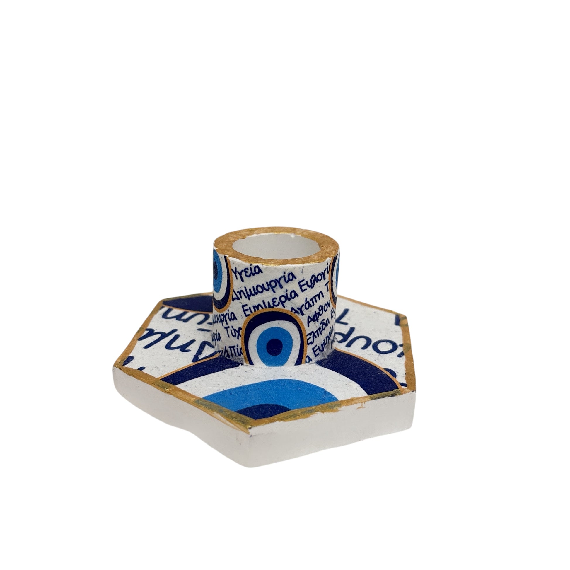 Sublimez votre intérieur avec notre bougeoir ŒIL PROTÉGÉ. Confectionné en porcelaine, ce bougeoir arbore un motif d'œil protecteur et des mots grecs porte-bonheur. Illuminez votre espace d'une douce lueur et éloignez les énergies négatives. Un objet luxueux qui embellira n'importe quelle pièce.