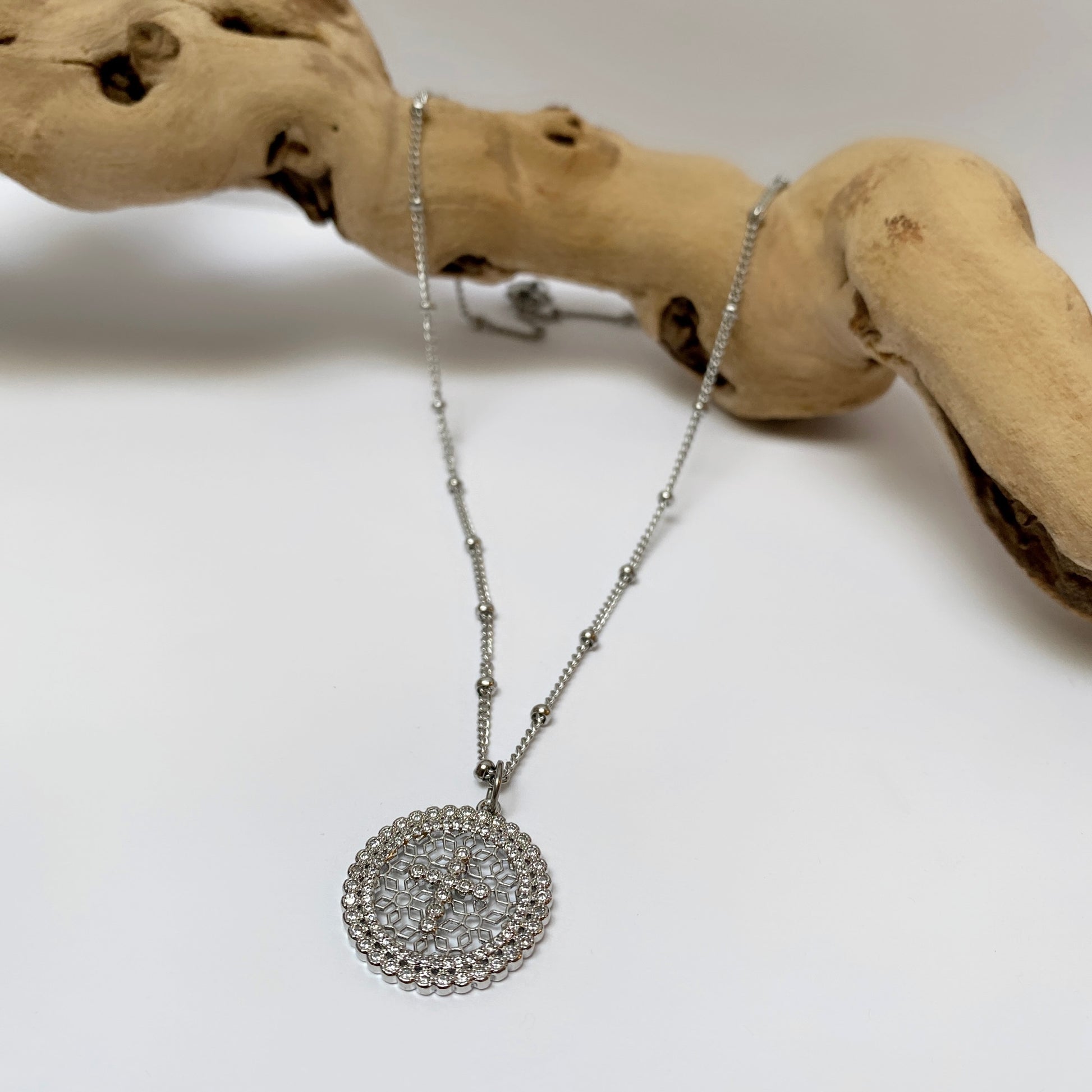 #2 Chaîne à billes en acier inoxydable plaqué argent avec pendentif croix ronde scintillante mesurant 17 pouces