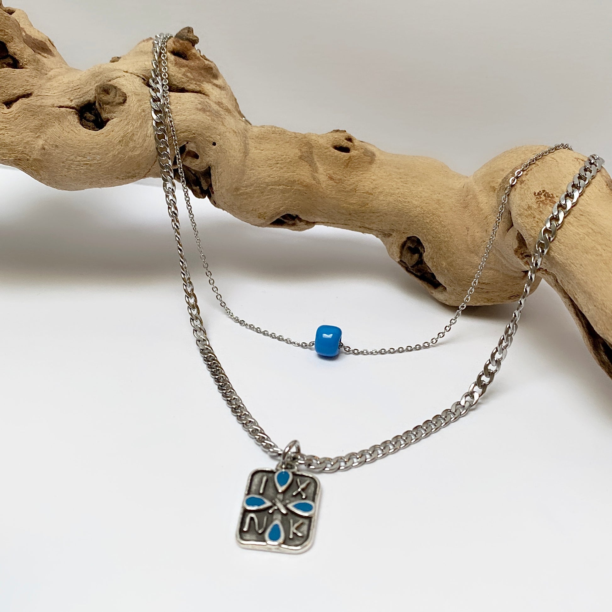 #3 Chaîne double en acier inoxydable plaqué argent avec pendentif et perle bleue mesurant 14,5 pouces (en haut) 17 pouces (en bas)