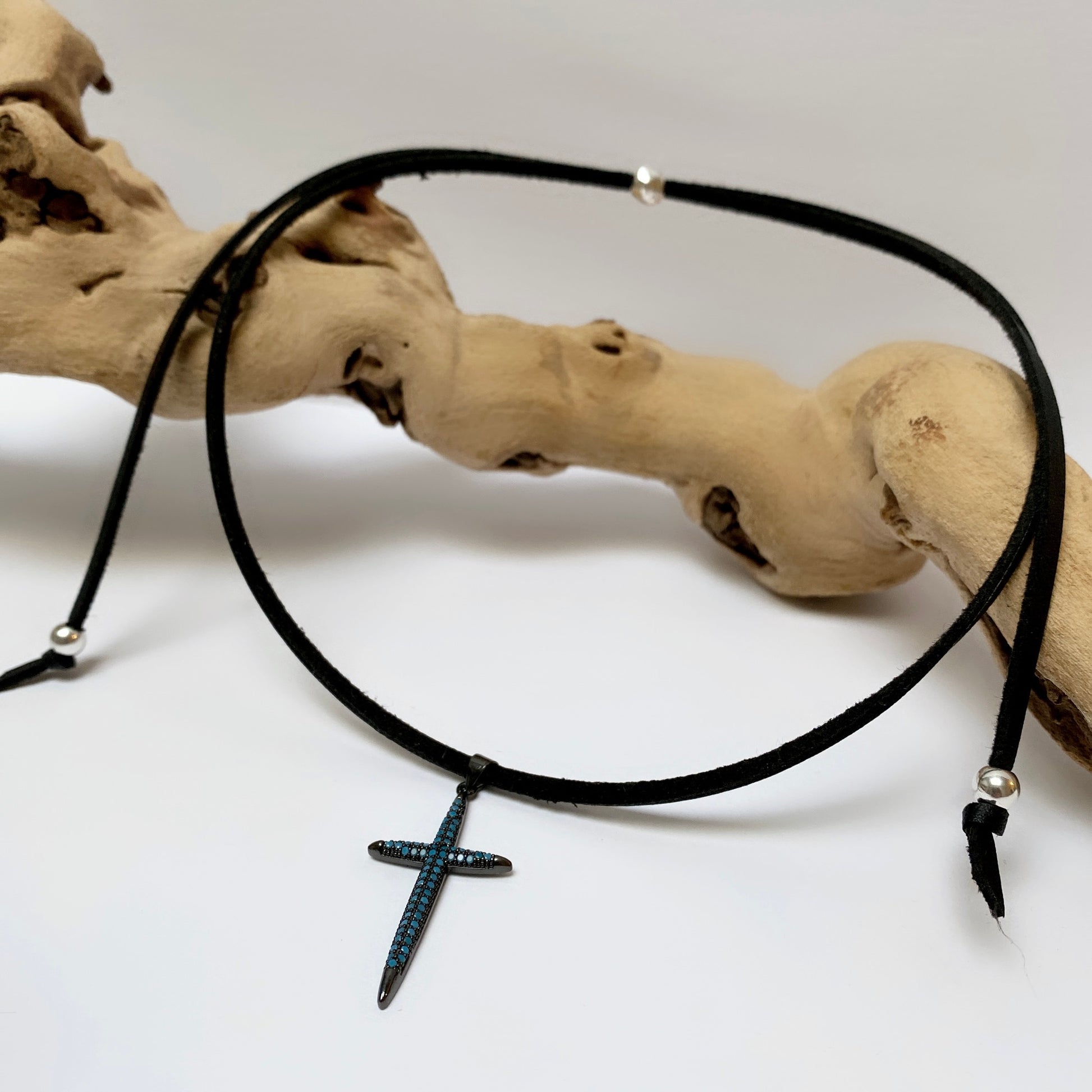 #5 Corde en cuir végétalien et croix bling bleue mesurant 27 pouces maximum (réglable)
