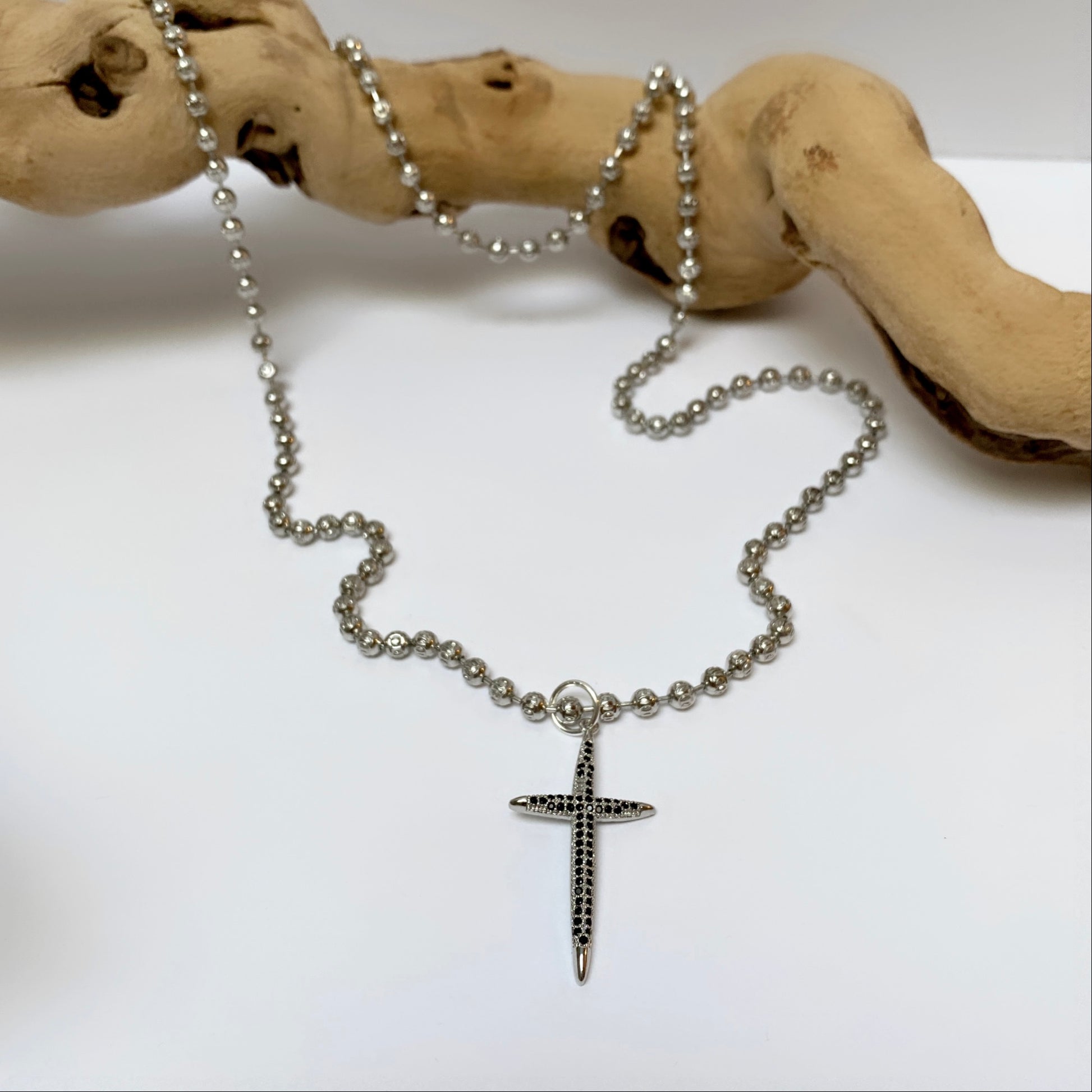 #6 Chaîne à billes en laiton plaqué argent avec croix bling mesurant 29,5 pouces