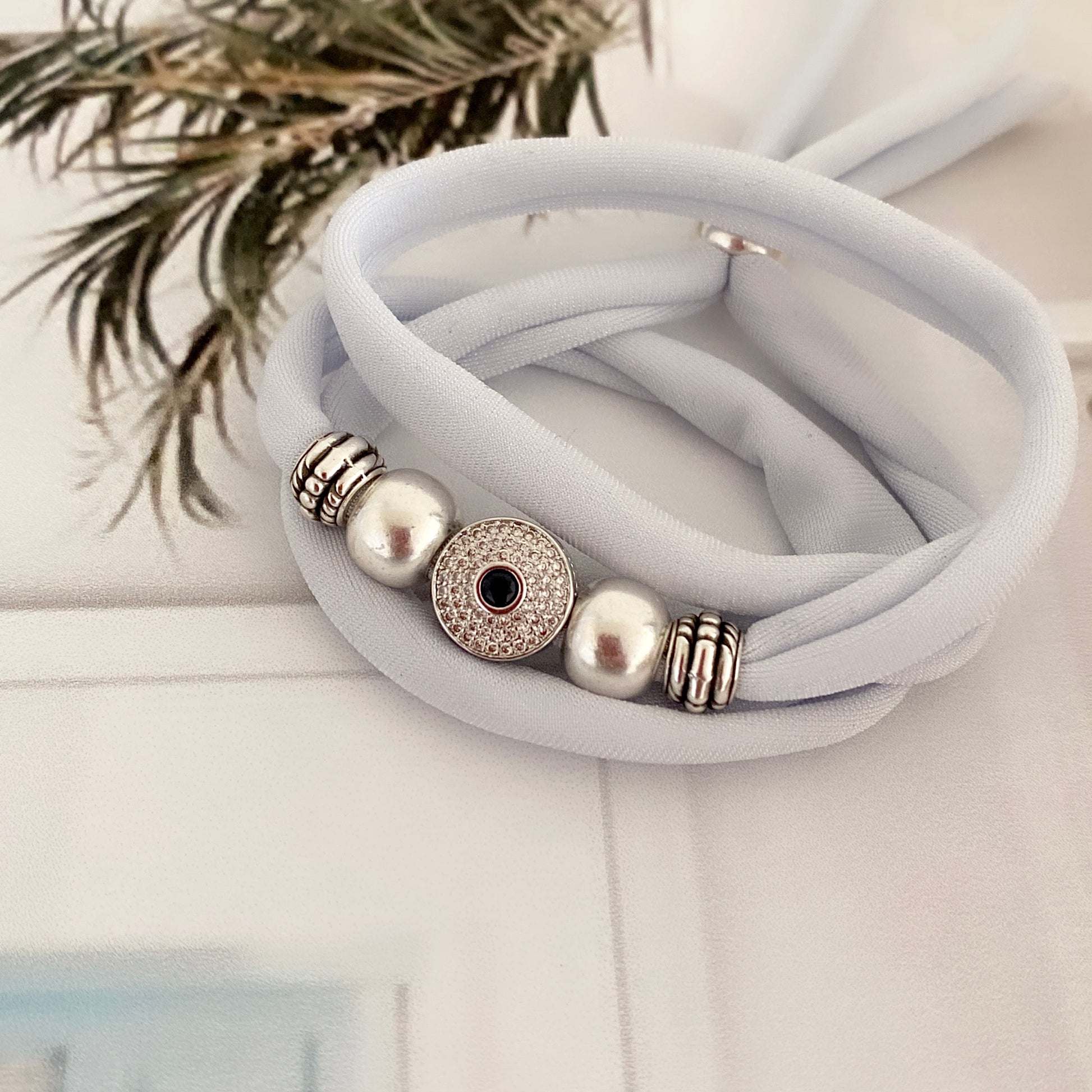Perles d'hématite plaquées argent, perles en céramique, fermoir toggle Swarovski & lycra.