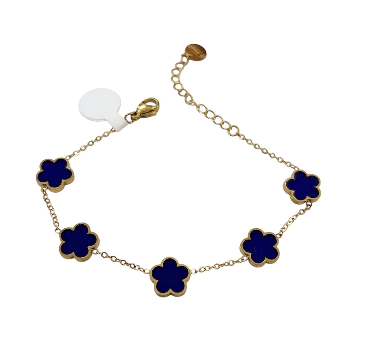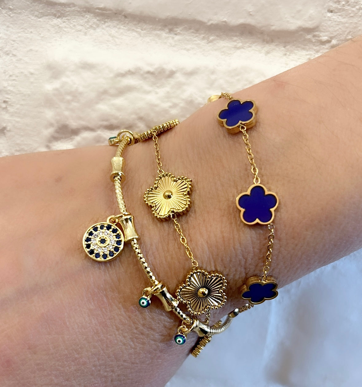 Ajoutez une touche de fantaisie à votre tenue avec nos bracelets FLOWER POWER. Associez-le à des breloques mauvais œil, un bracelet fleur en acier inoxydable plaqué or et un bracelet fleur en émail bleu pour un look unique et ludique. Chaque bracelet est vendu séparément.