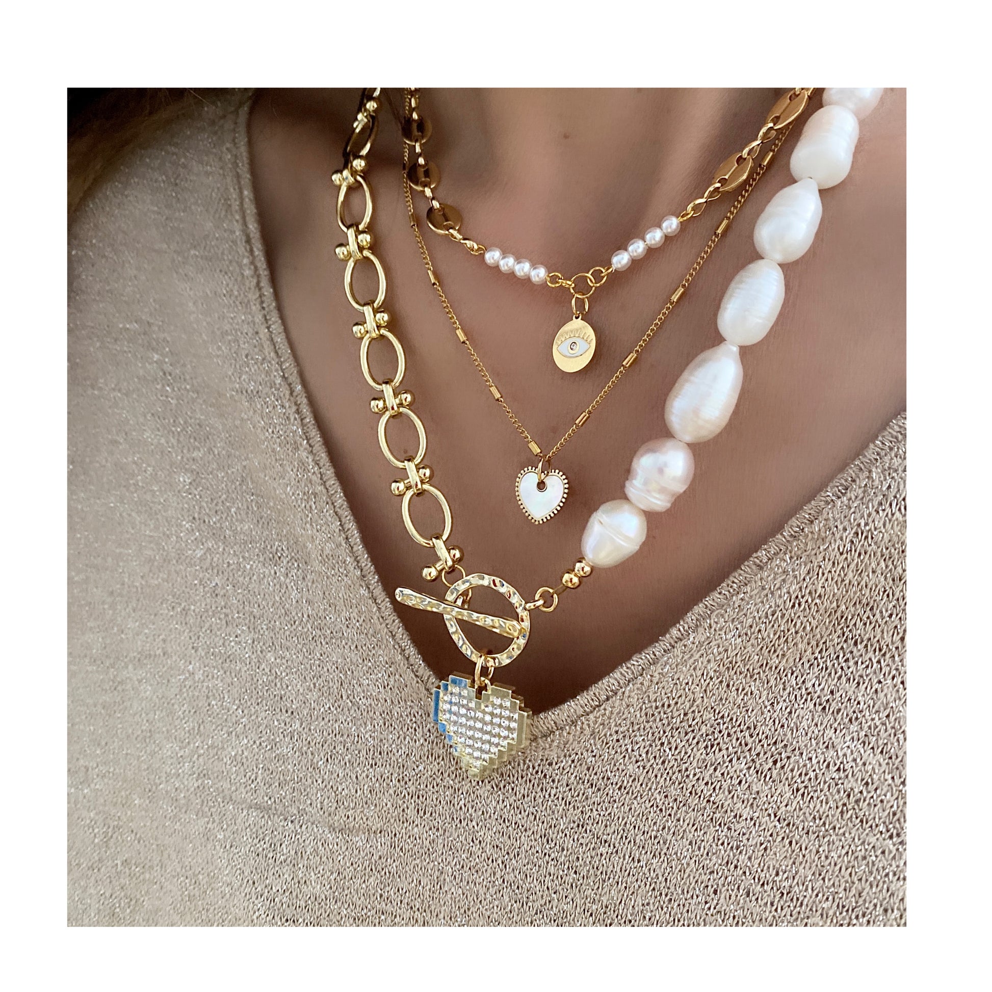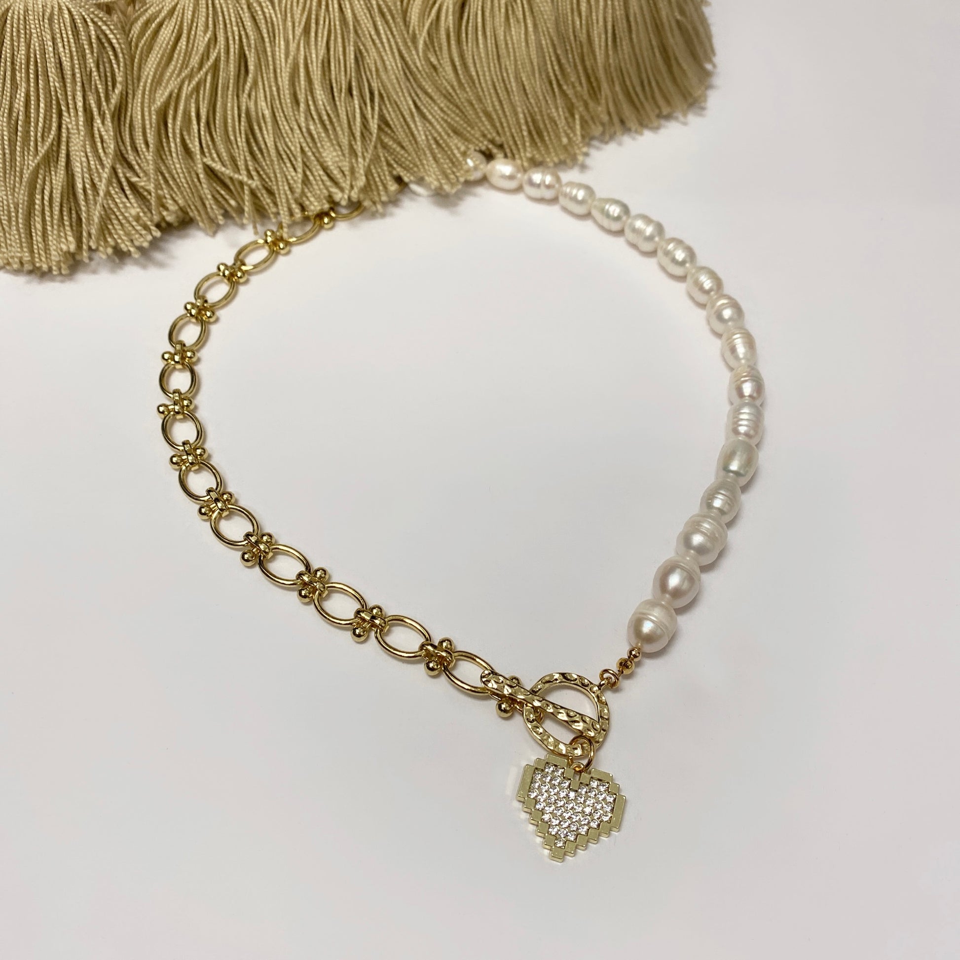 #3 Chaîne en fer plaqué or avec de magnifiques perles d'eau douce avec pendentif cœur en alliage plaqué or et fermoir à bascule martelé mesurant 19 pouces,