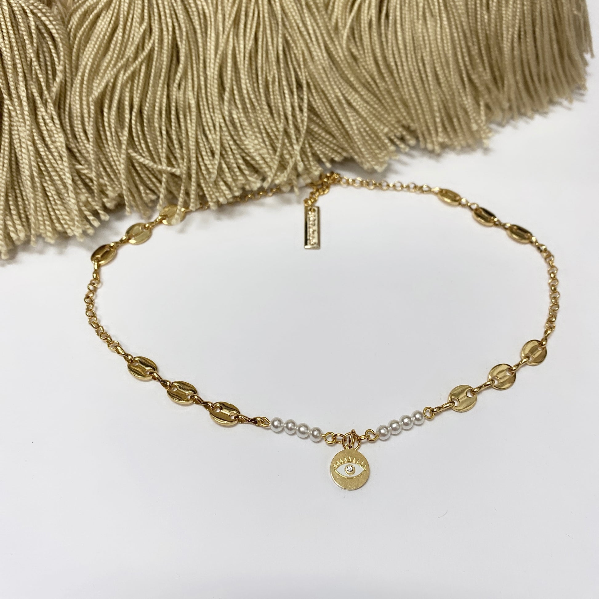 Chaîne en forme de grain de café plaqué or n°1 en acier inoxydable et breloque œil pendante mesurant 38,1 cm.