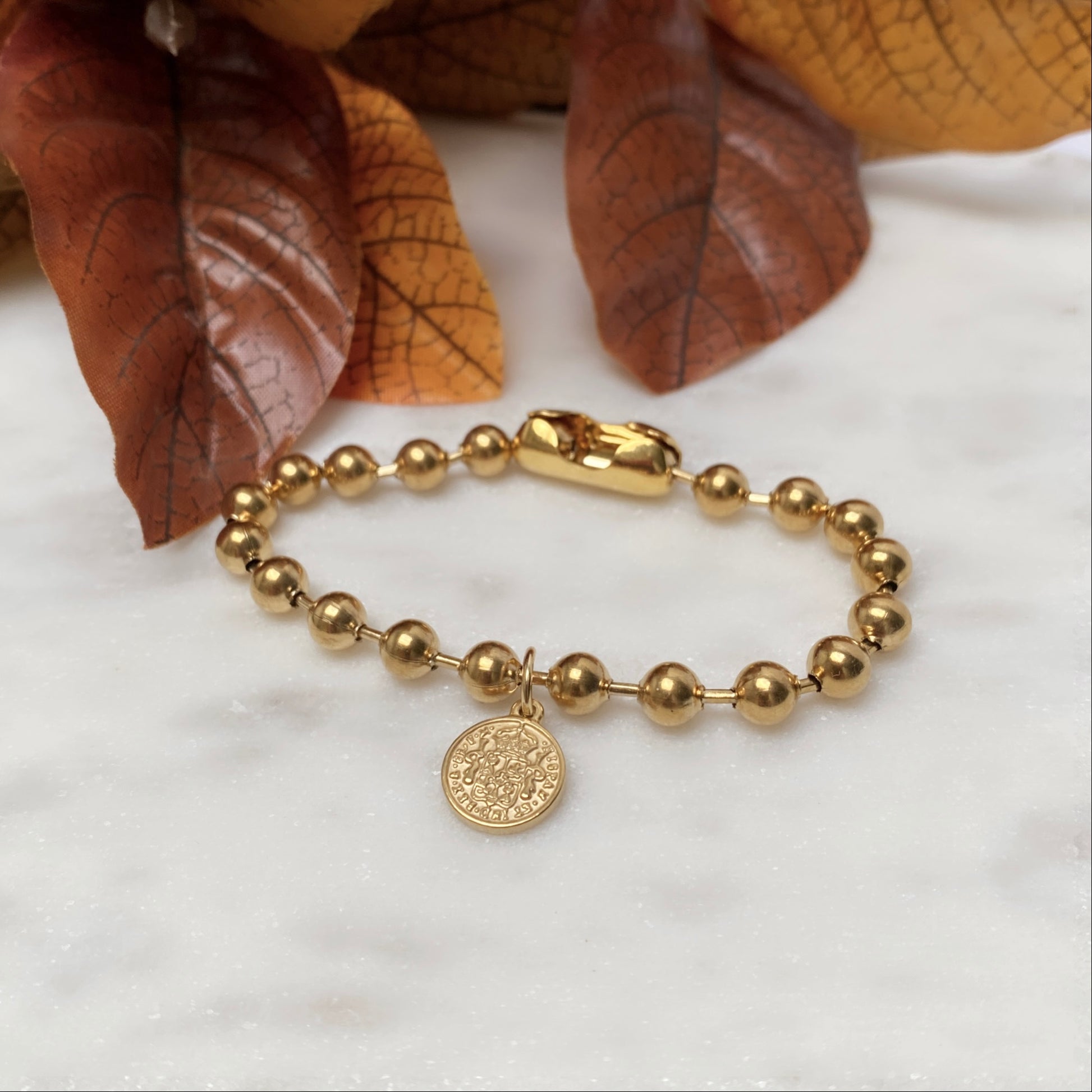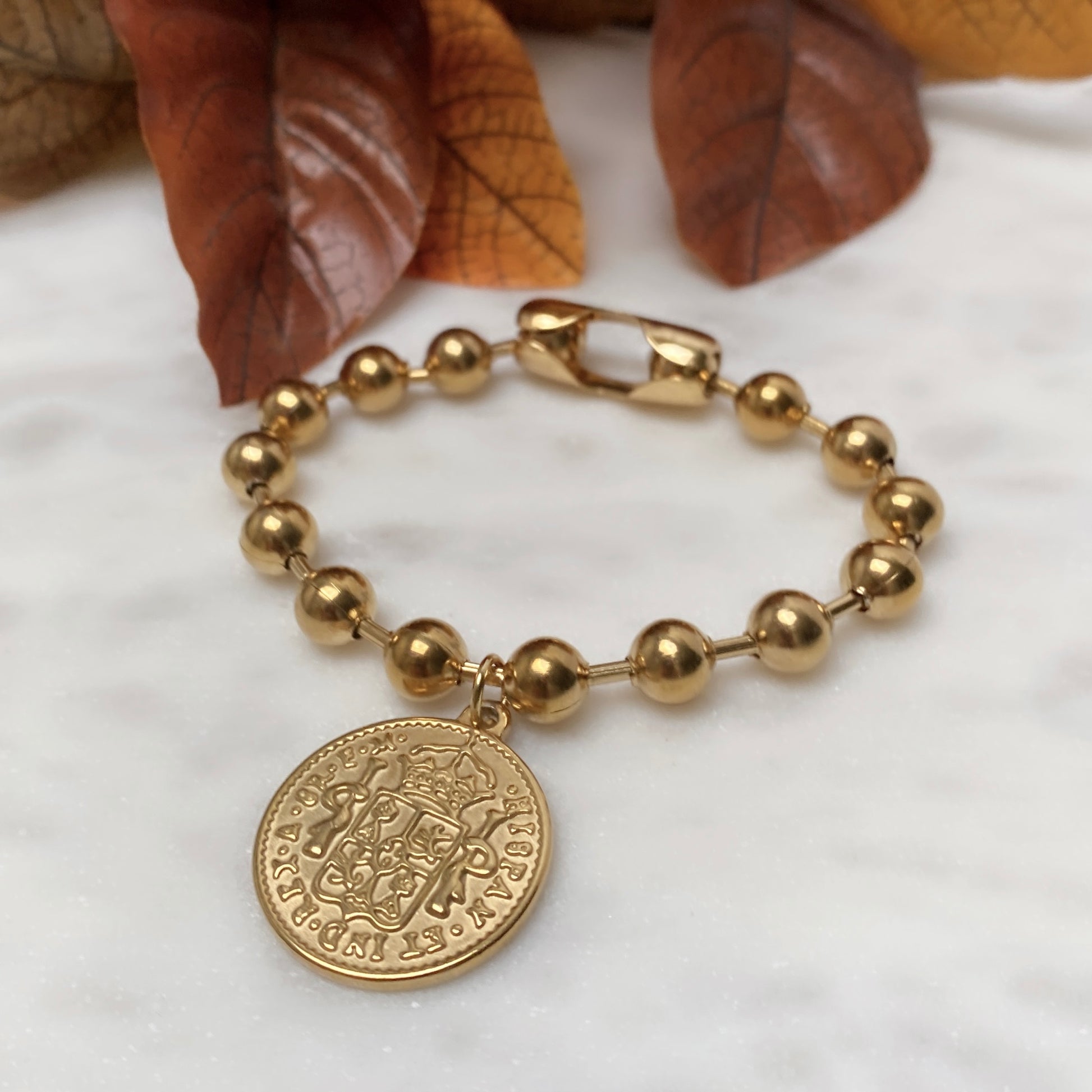 #3 Chaîne à billes en acier inoxydable plaqué or avec breloque pièce de monnaie