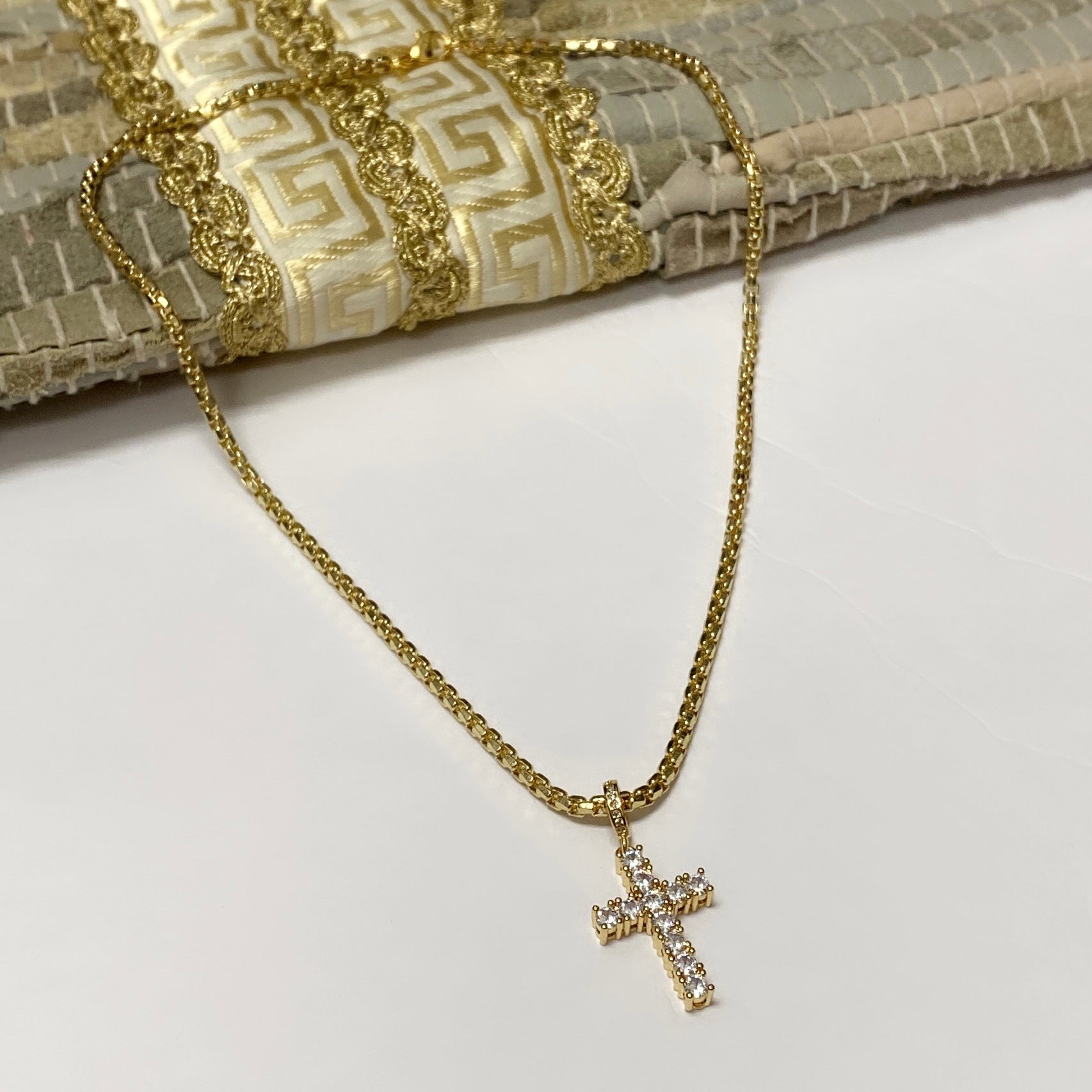 #1 Double chaîne en laiton plaqué or et chaîne fantaisie en zircone cubique avec une croix en laiton et en zircone cubique avec fermoir mousqueton mesurant 16 et 18 pouces