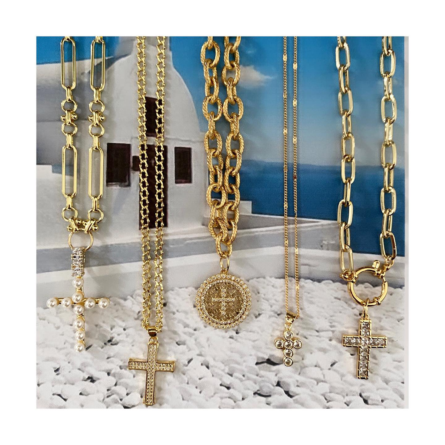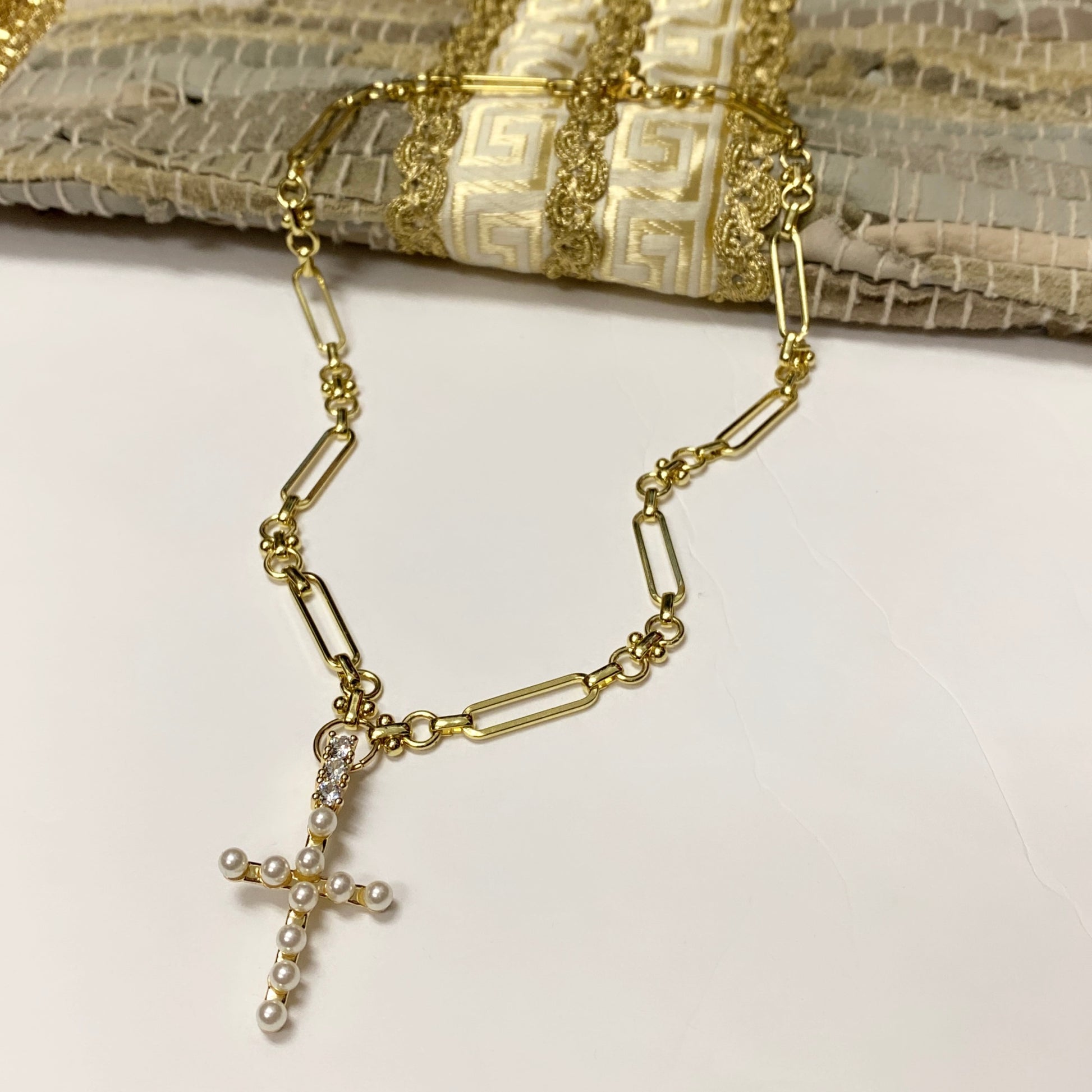 #1 Chaîne en laiton plaqué or avec croix en laiton et perles avec fermoir mousqueton mesurant 17,5 pouces