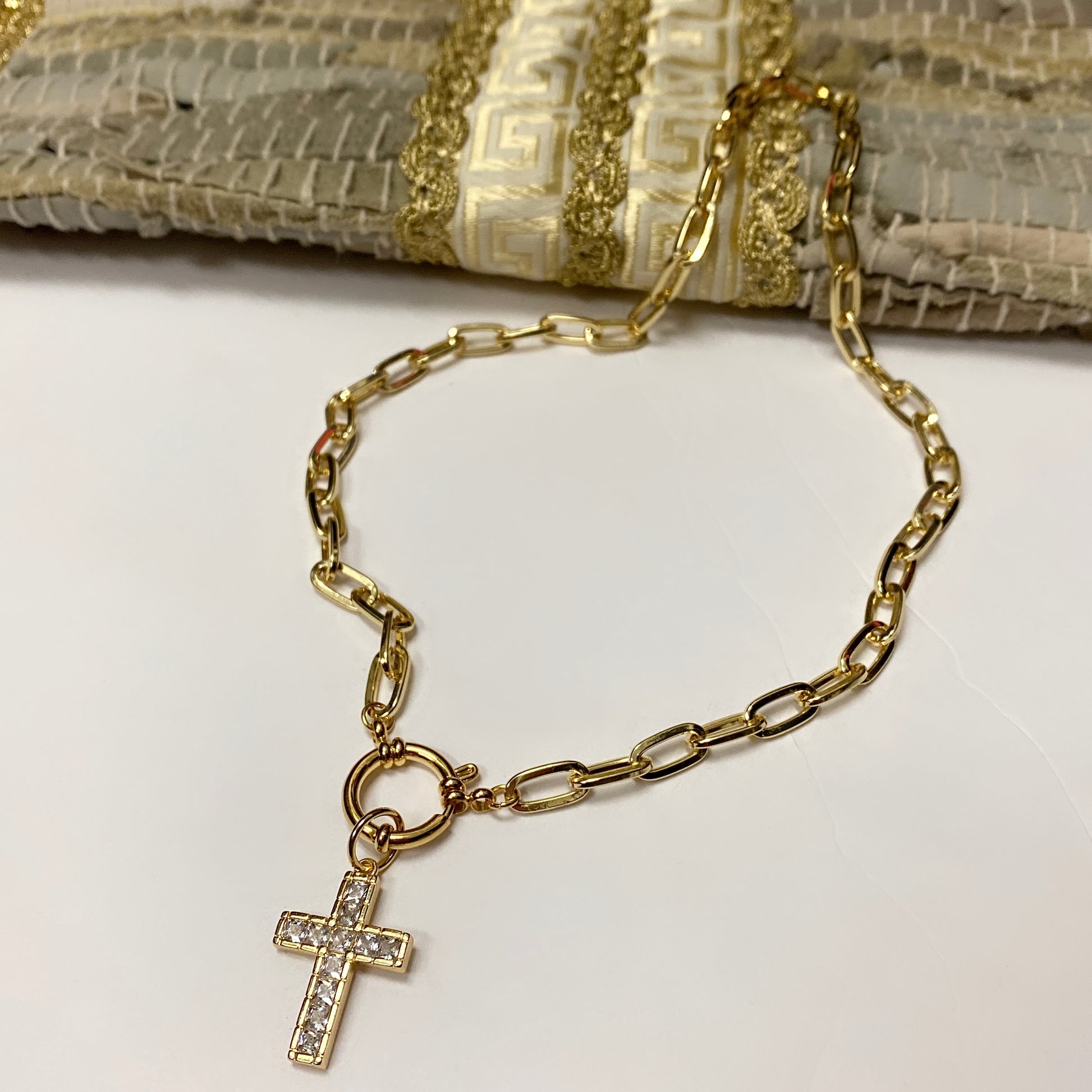 #5 Chaîne de trombones en laiton plaqué or avec croix en zircone cubique et fermoir à ressort mesurant 18 pouces