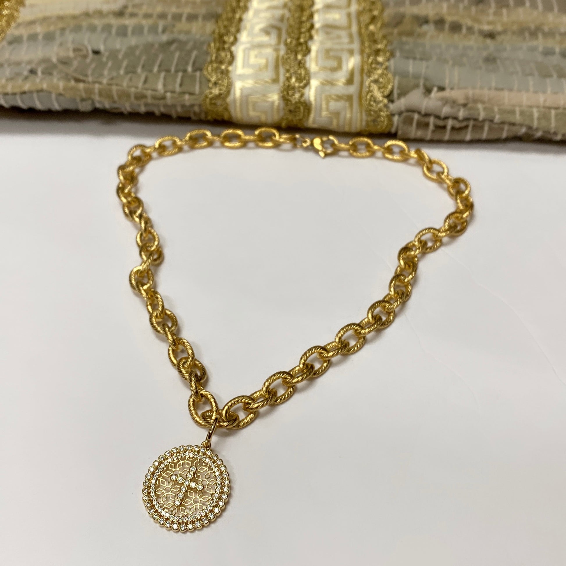 #3 Chaîne épaisse en laiton plaqué or avec pendentif croix ronde en zircone cubique avec fermoir mousqueton mesurant 16 pouces